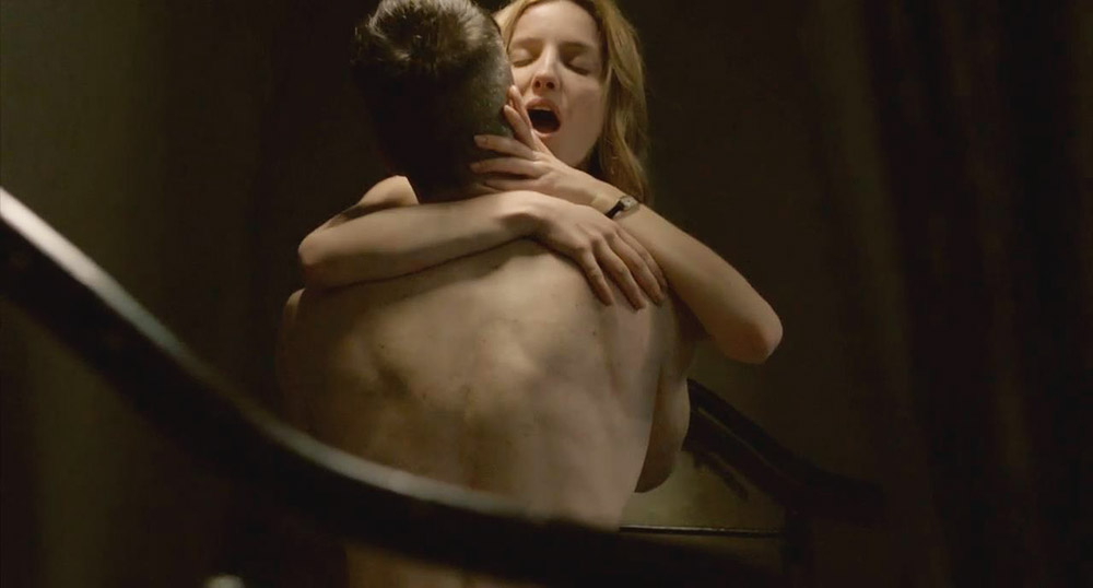We have Gaite Jansen scene, where she’s undressing as a guy kneels in front of her. Gaite is dropping her red dress to the floor and showing breasts and butt in the process. She then walks up to the guy and pushes him down to the floor. Getting on top of him while naked and having sex. The guy then imagines Annabelle Wallis in her place, though Annabelle doesn’t show nudity. After they finish having sex, Gaite lays down on her back next to the guy with her nude tits in view again.