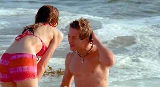 Here, Christy Carlson Romano is sunbathing on a beach when she takes off her shirt to reveal her bikini and walks down the beach to flirt with some guys before heading into the water, where her bikini top comes undone, leading her to clutch her breasts.