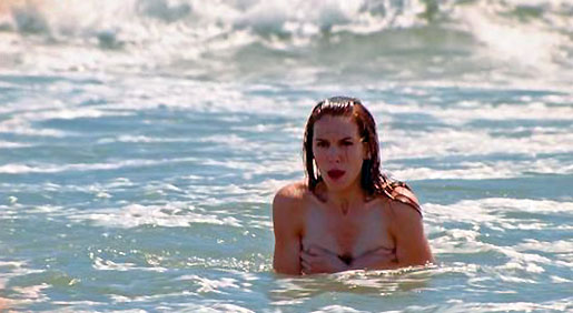 In the last scene, Christy Carlson Romano is on the beach, tying her bikini top while a man hides her view with a towel, then watching a man surf with the bottom of her left breast hanging out of her bikini top before walking over.