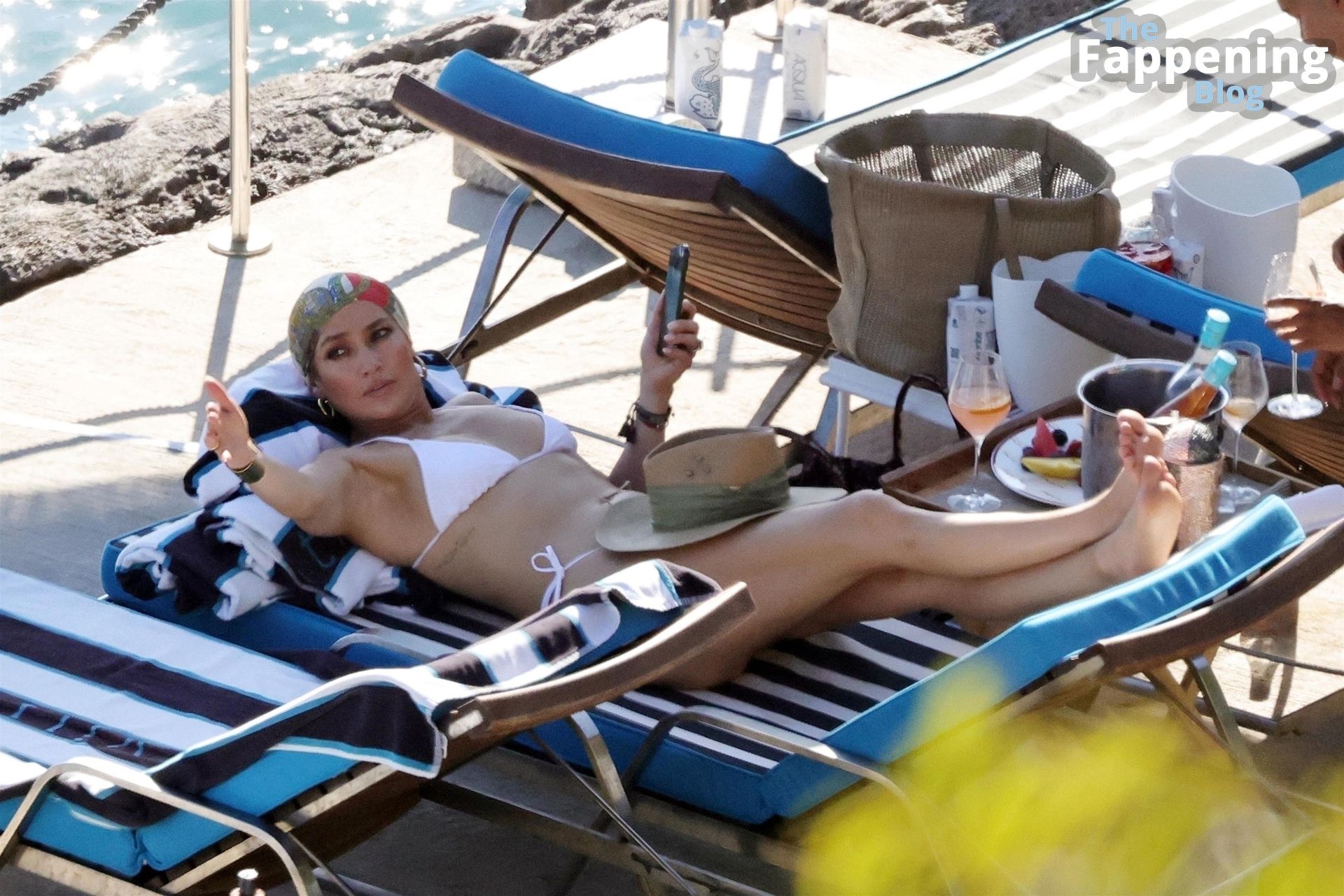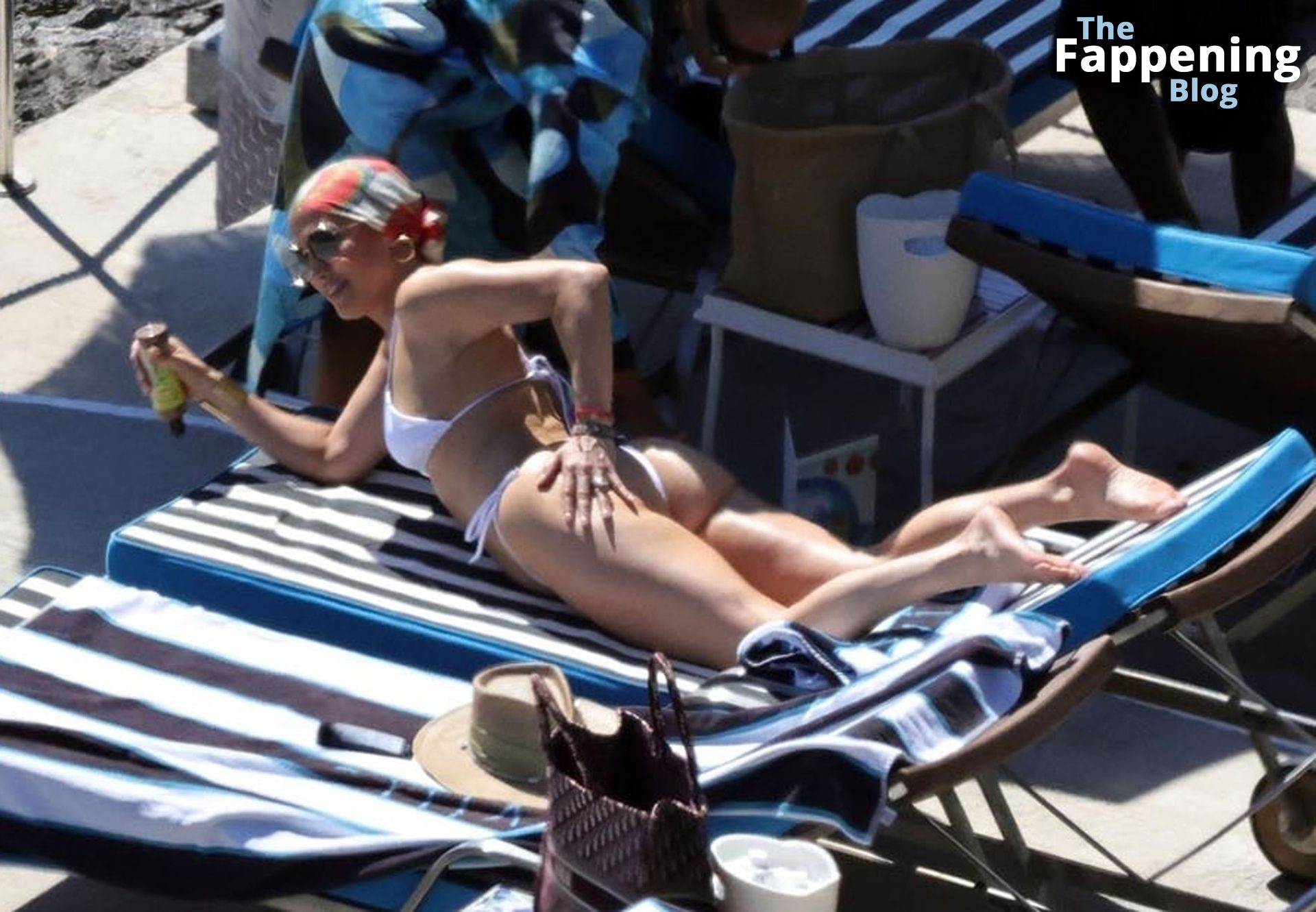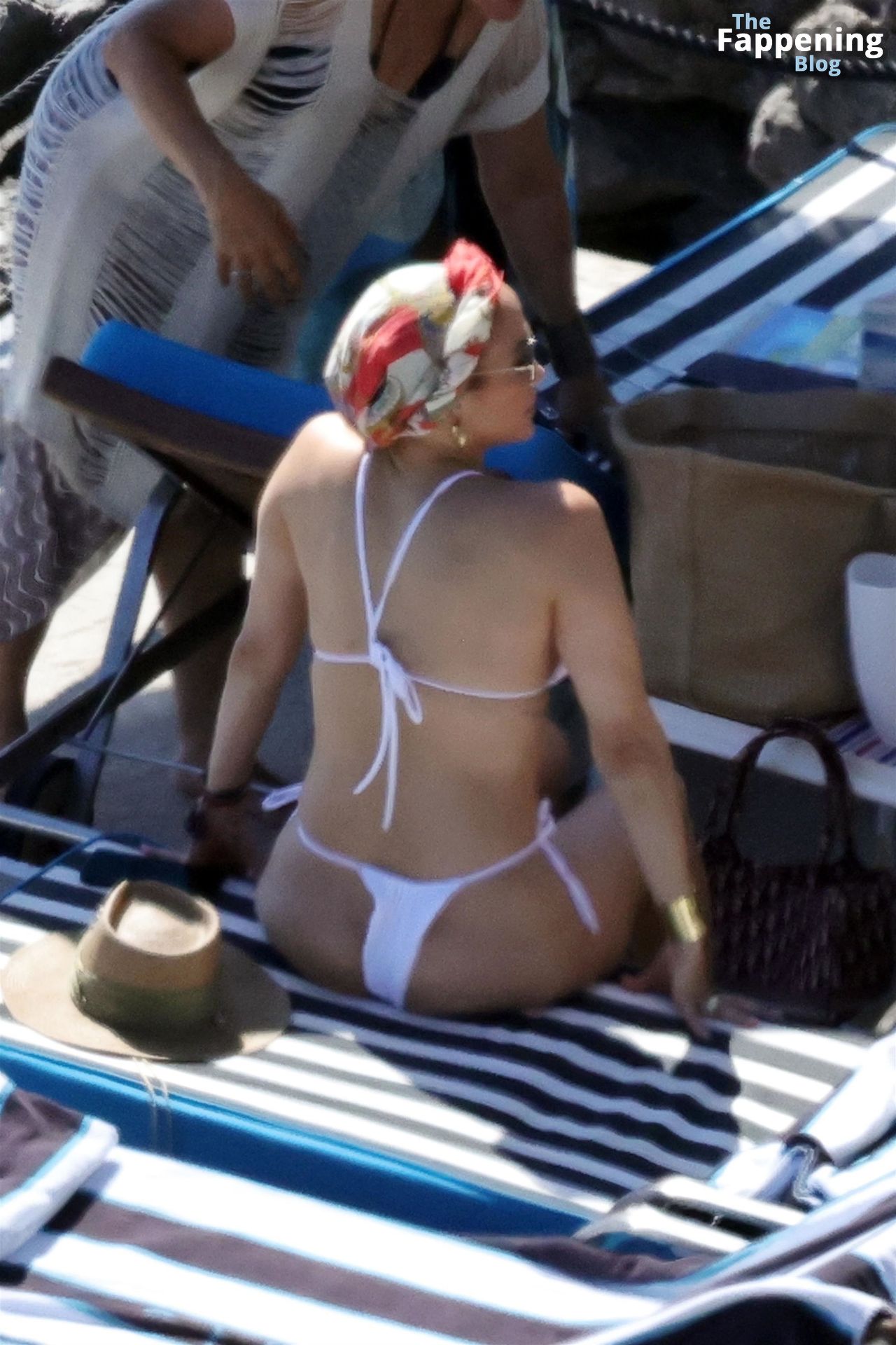 The stunning 54-year-old continues to defy her age as she is posed out on her sun bed showing off her toned figure and not to mention her world-famous derriere on display in a jaw-dropping white thong bikini.