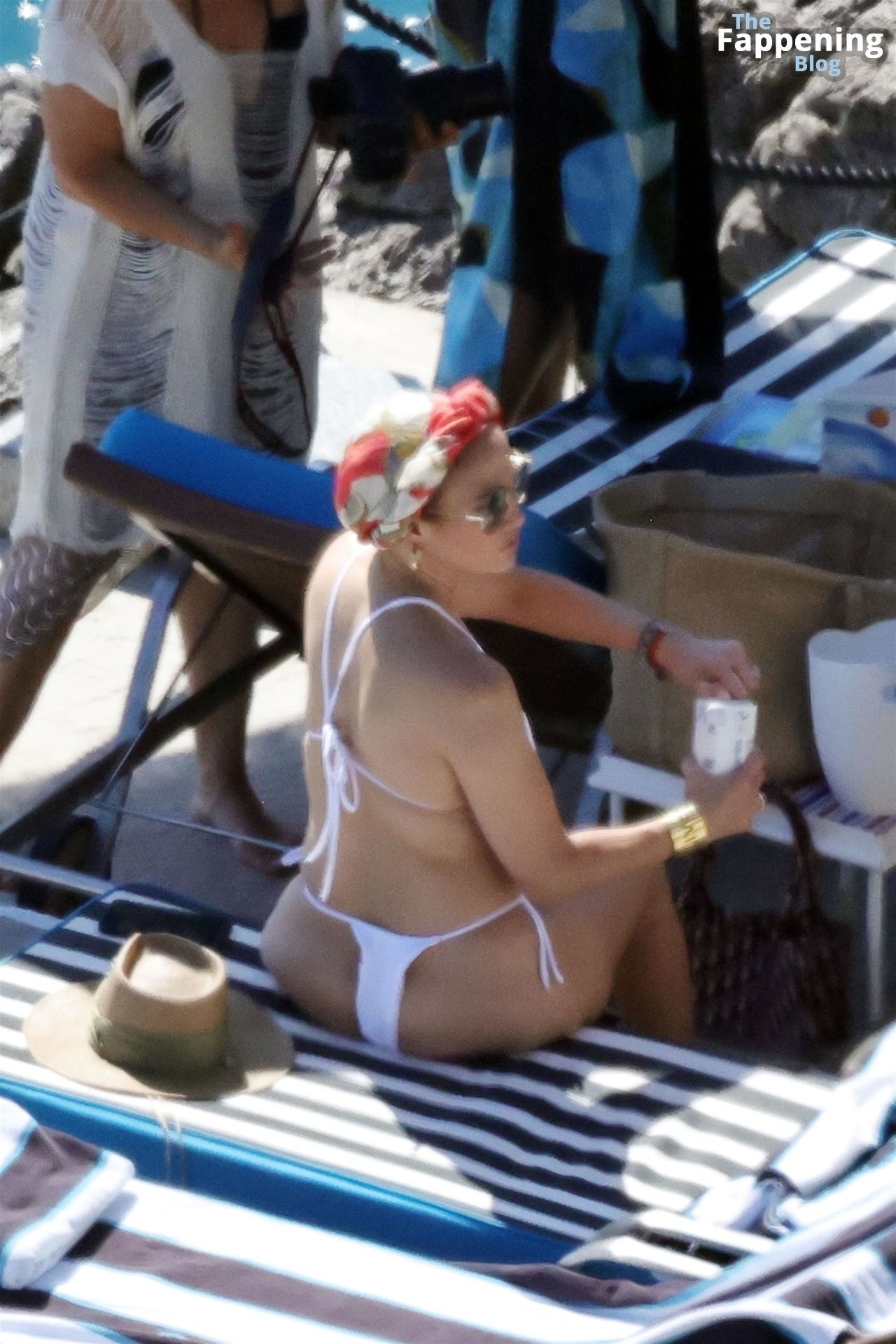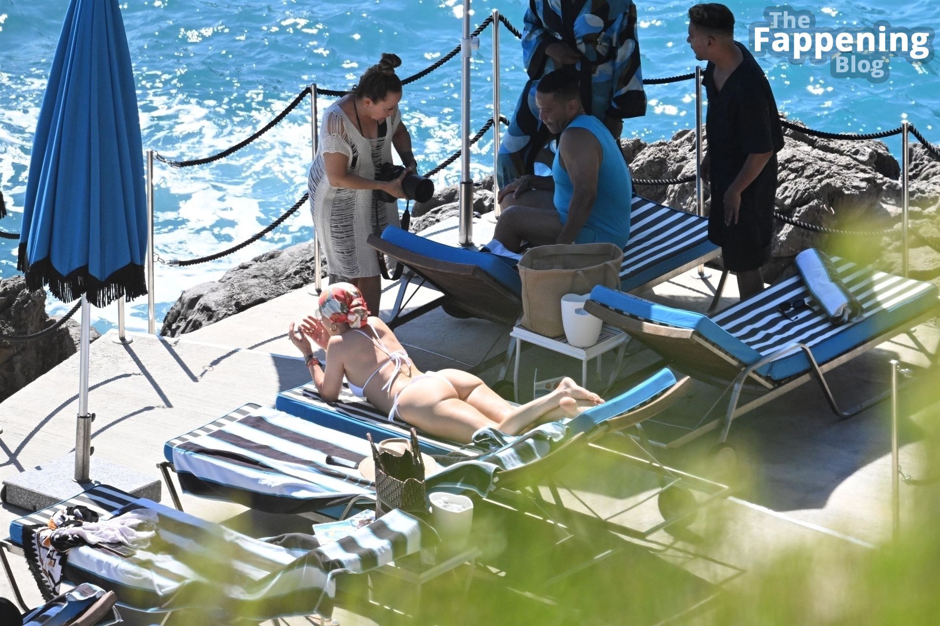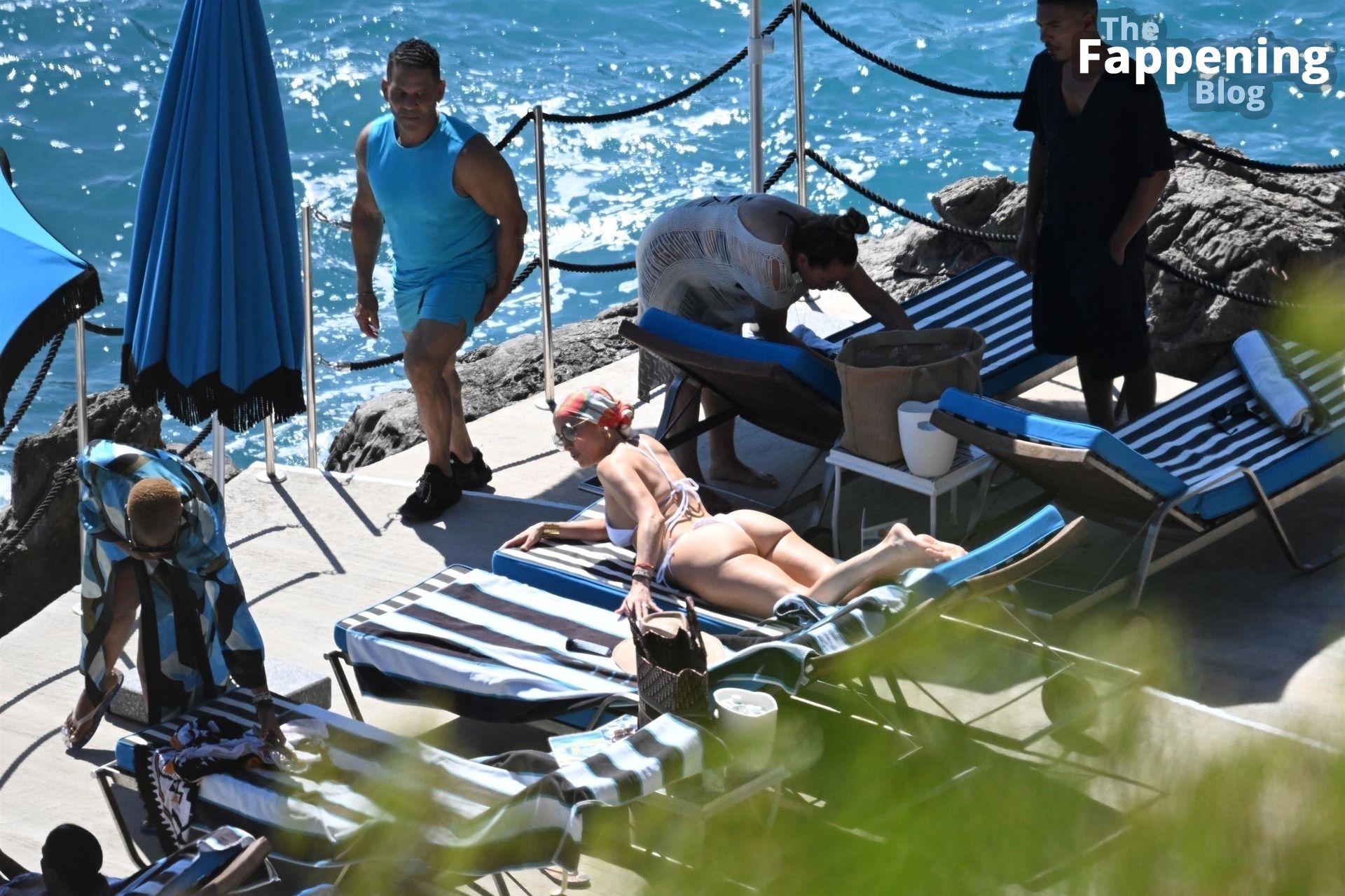 The stunning 54-year-old continues to defy her age as she is posed out on her sun bed showing off her toned figure and not to mention her world-famous derriere on display in a jaw-dropping white thong bikini.