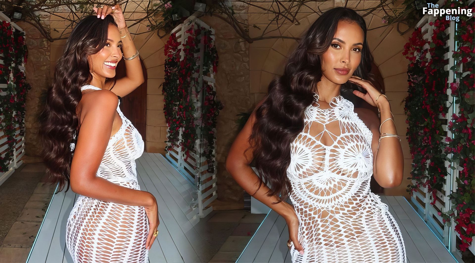 Maya Jama poses with a braless vibe in a see-through white fit, showin’ her stunning curves.