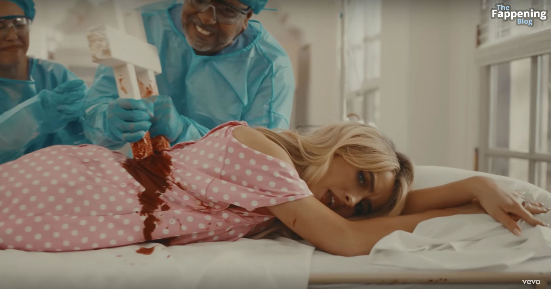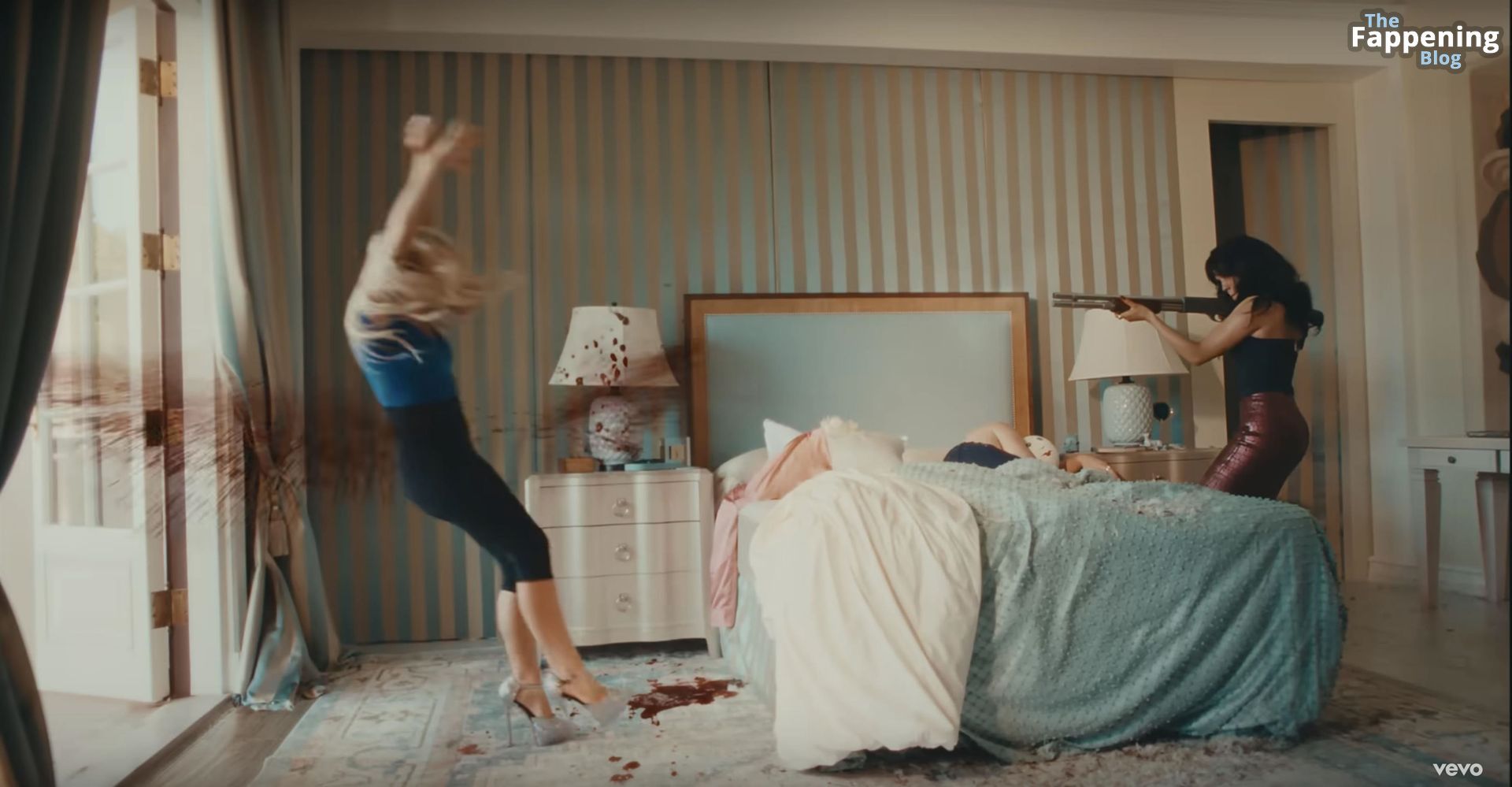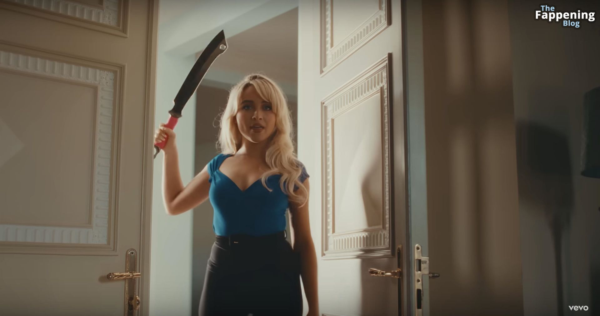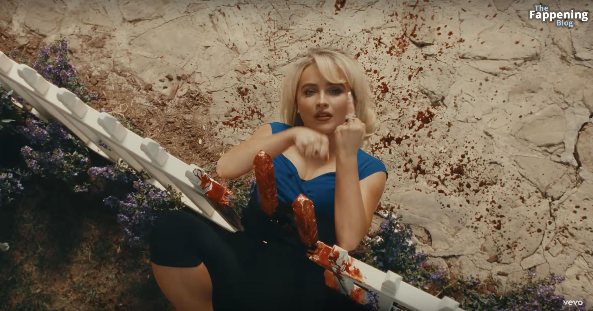 In the Dave Meyers-directed video, Carpenter and the “Beetlejuice 2” actress are constantly trying to take each other out and even share a steamy kiss. At the start, the “Nonsense” singer hits up a pink bed loaded with murder tools and grabs a knife to use as a mirror while she’s getting ready. She then storms into a mansion, trying to off the You actress, who she thinks is hooking up with her guy.