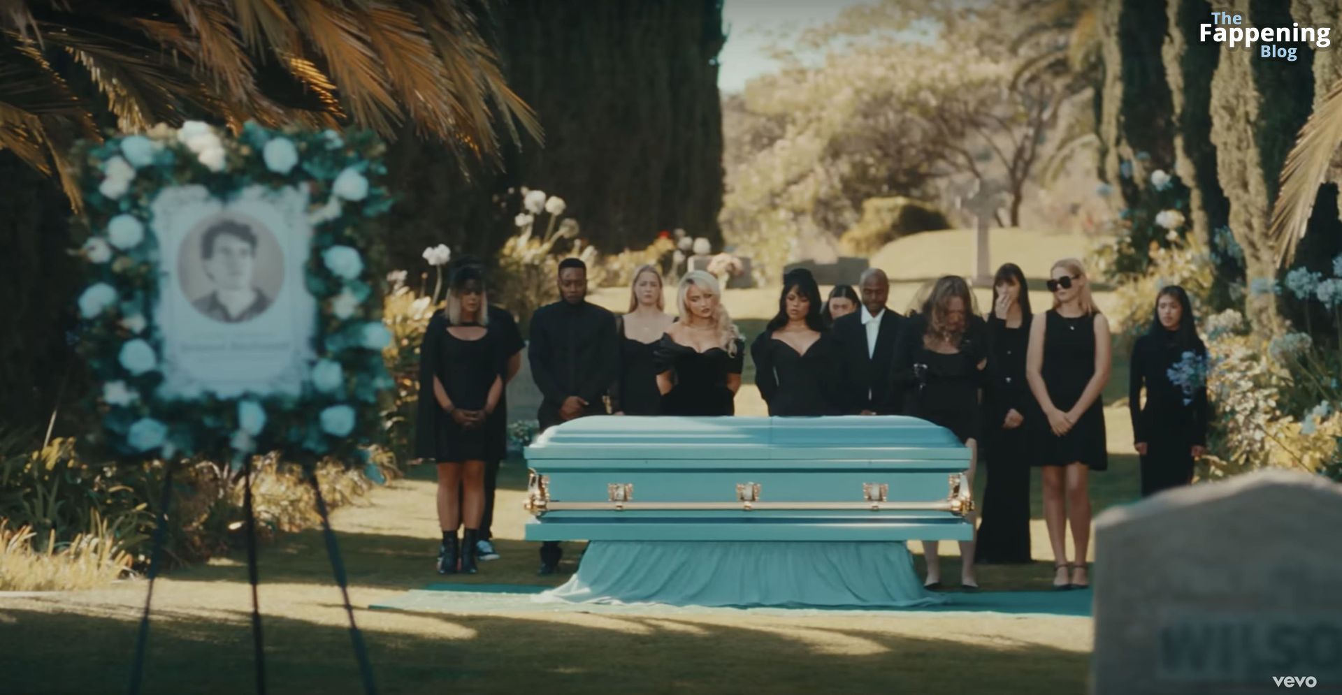 At the end of the video, the pair show up to his funeral in black funeral gear, giggling and sipping smoothies. The whole thing is full of campy horror references.