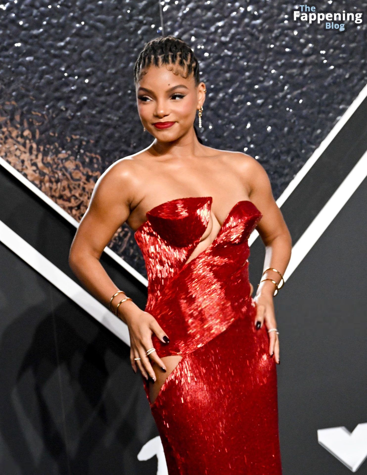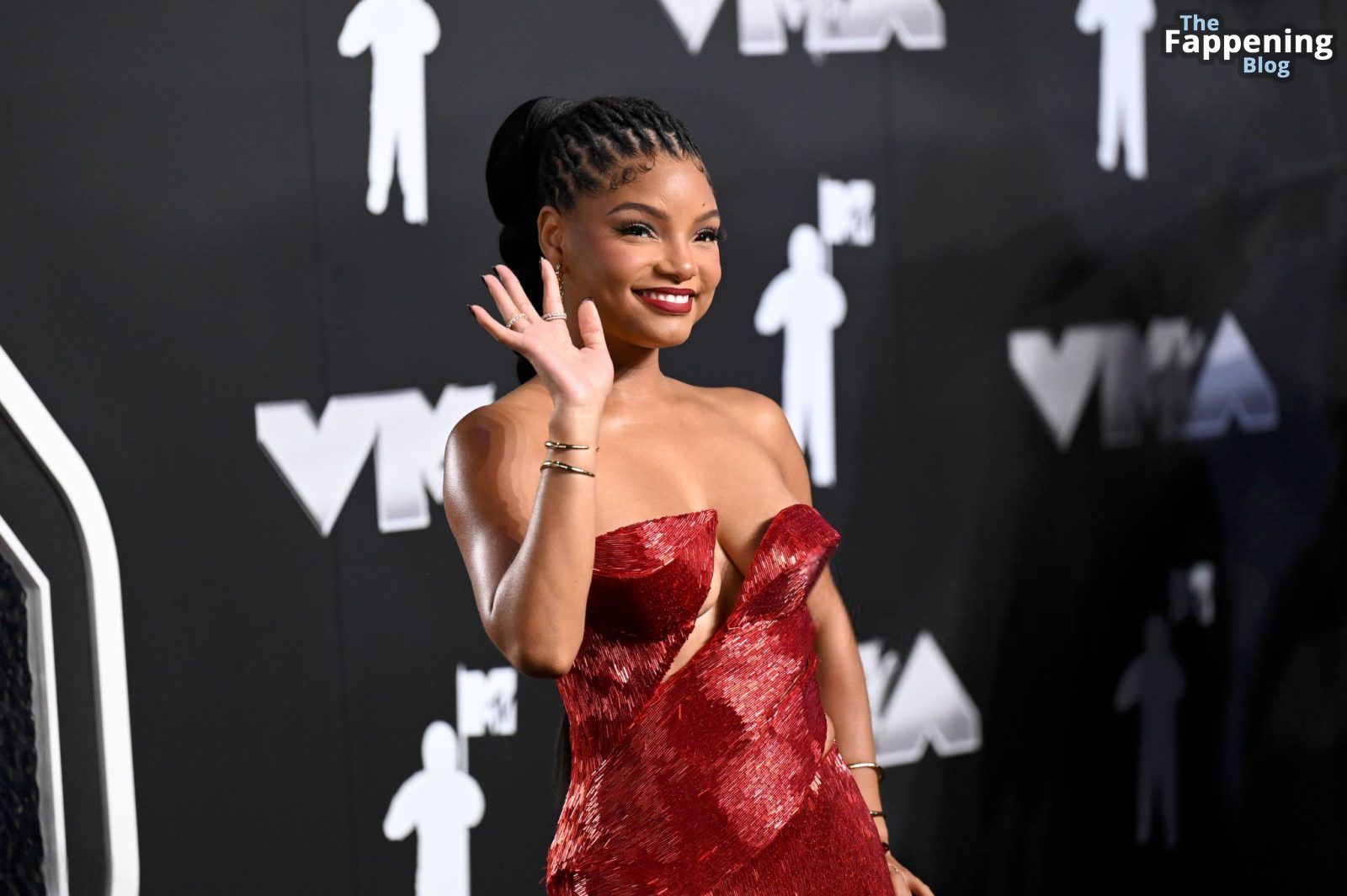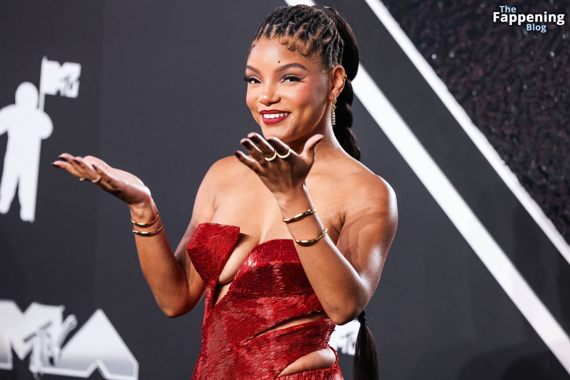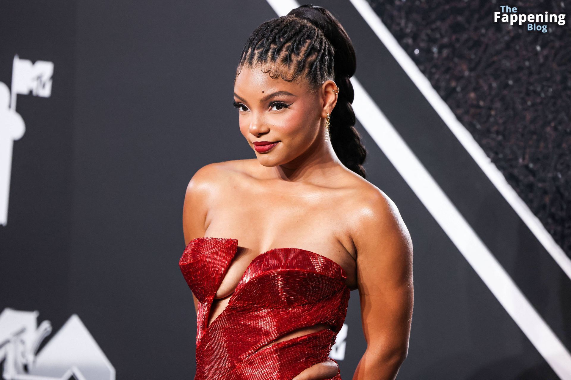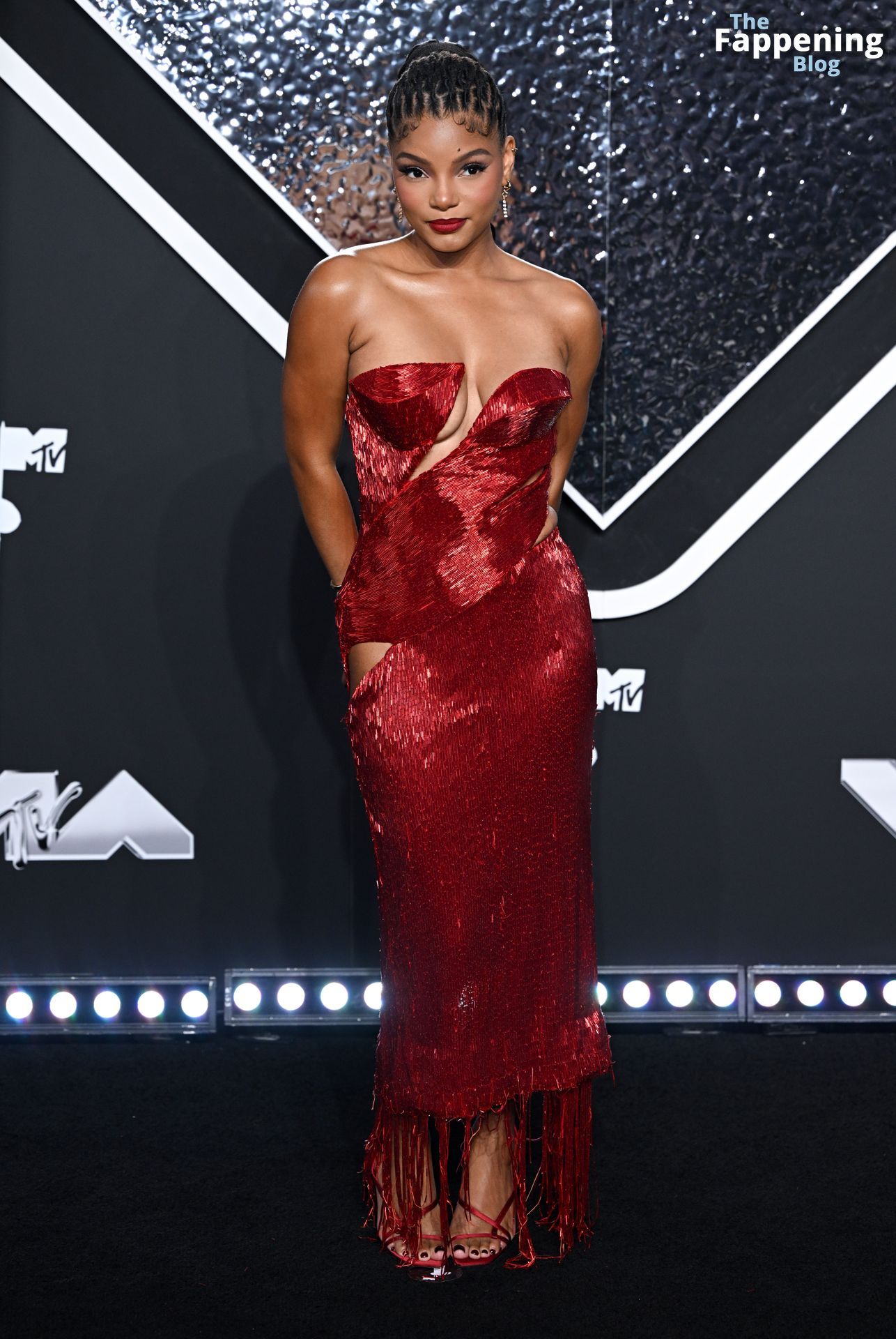 Halle Bailey is seen at the MTV VMAs in NYC, turnin’ heads with her bold, cleavage-baring look. Peep her outfit and that revealing style.