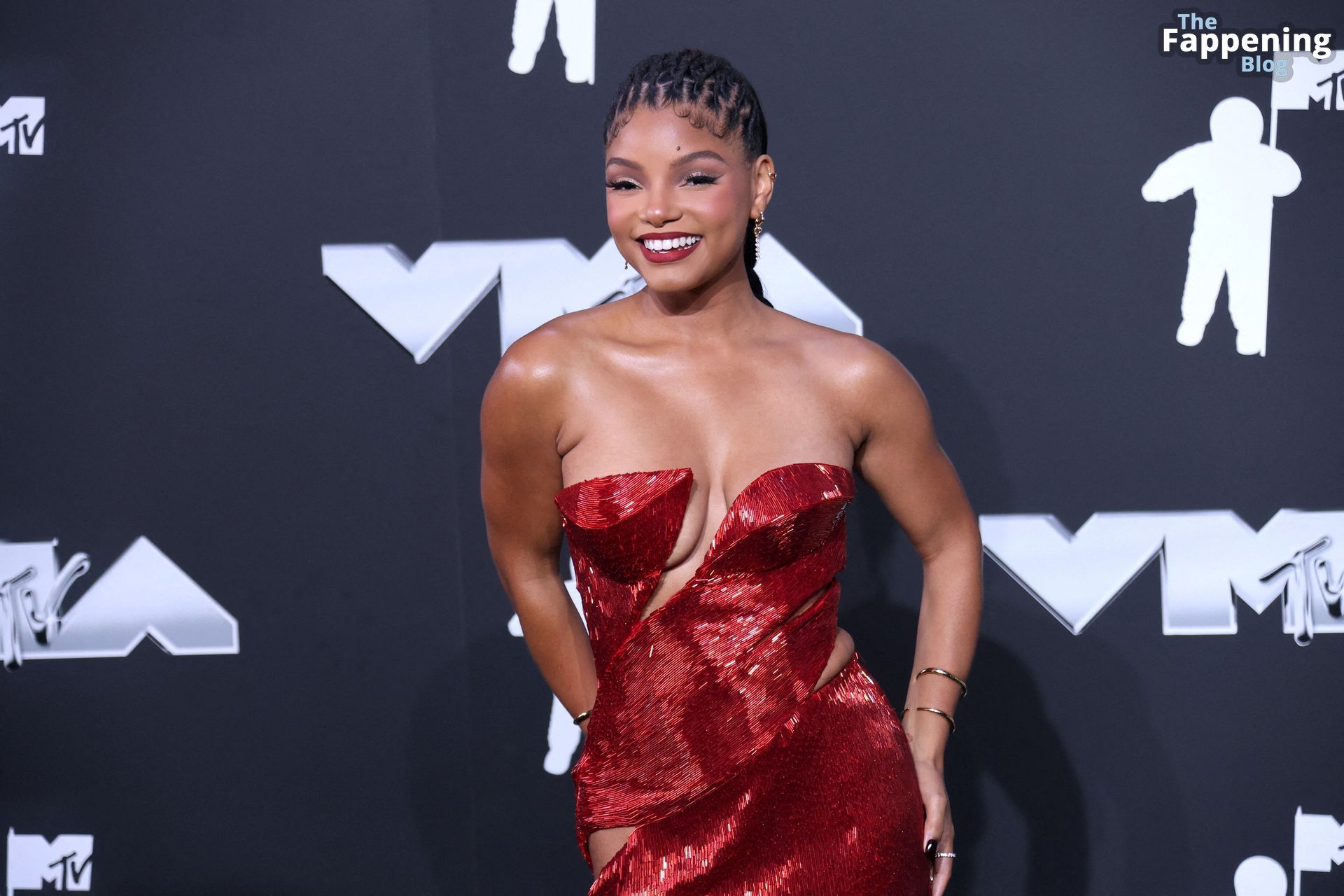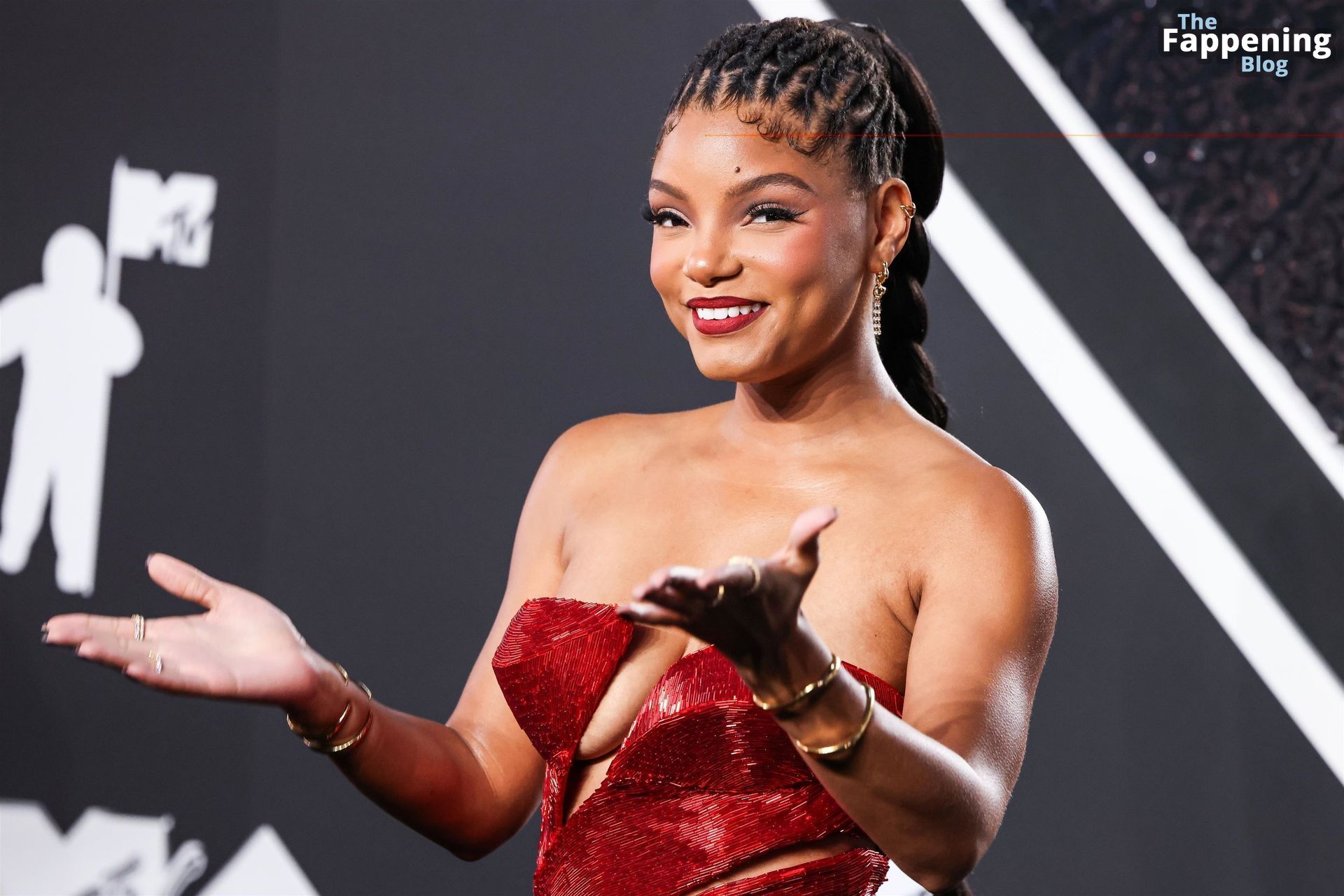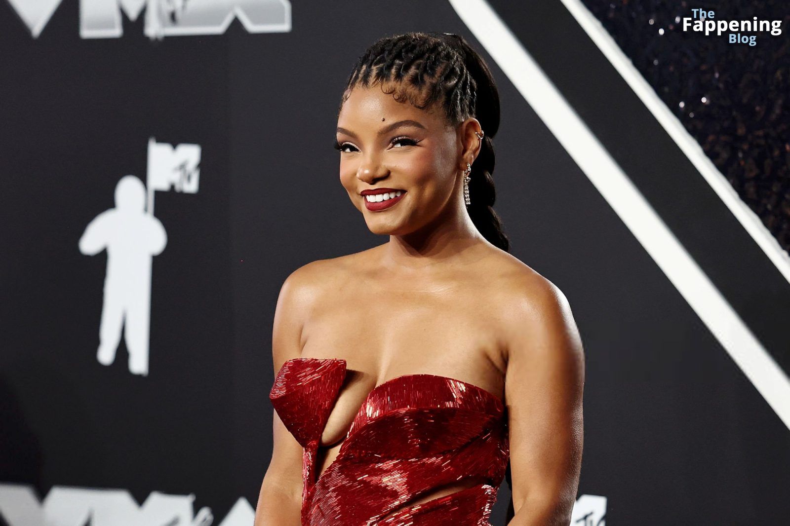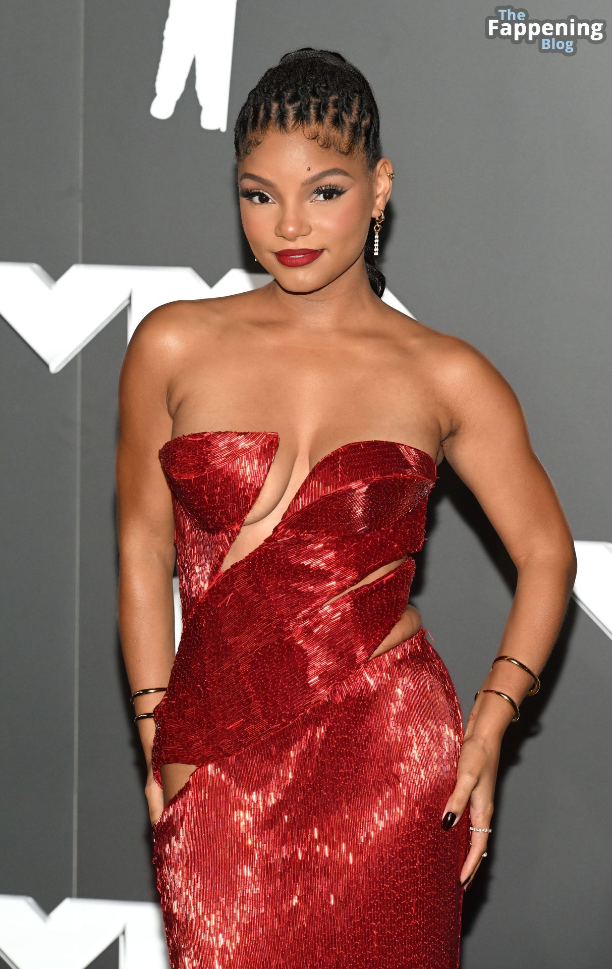 Halle Bailey is seen at the MTV VMAs in NYC, turnin’ heads with her bold, cleavage-baring look. Peep her outfit and that revealing style.