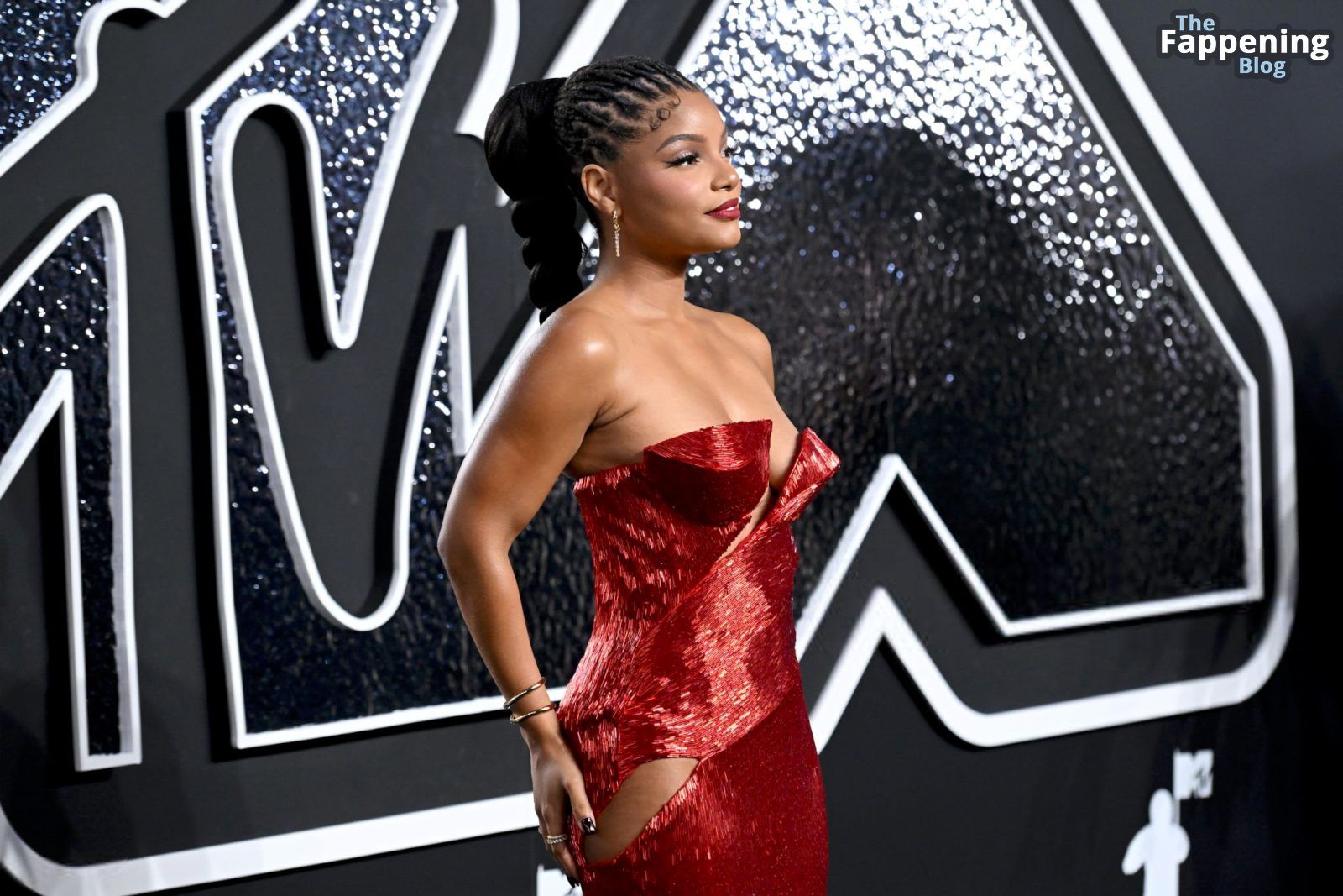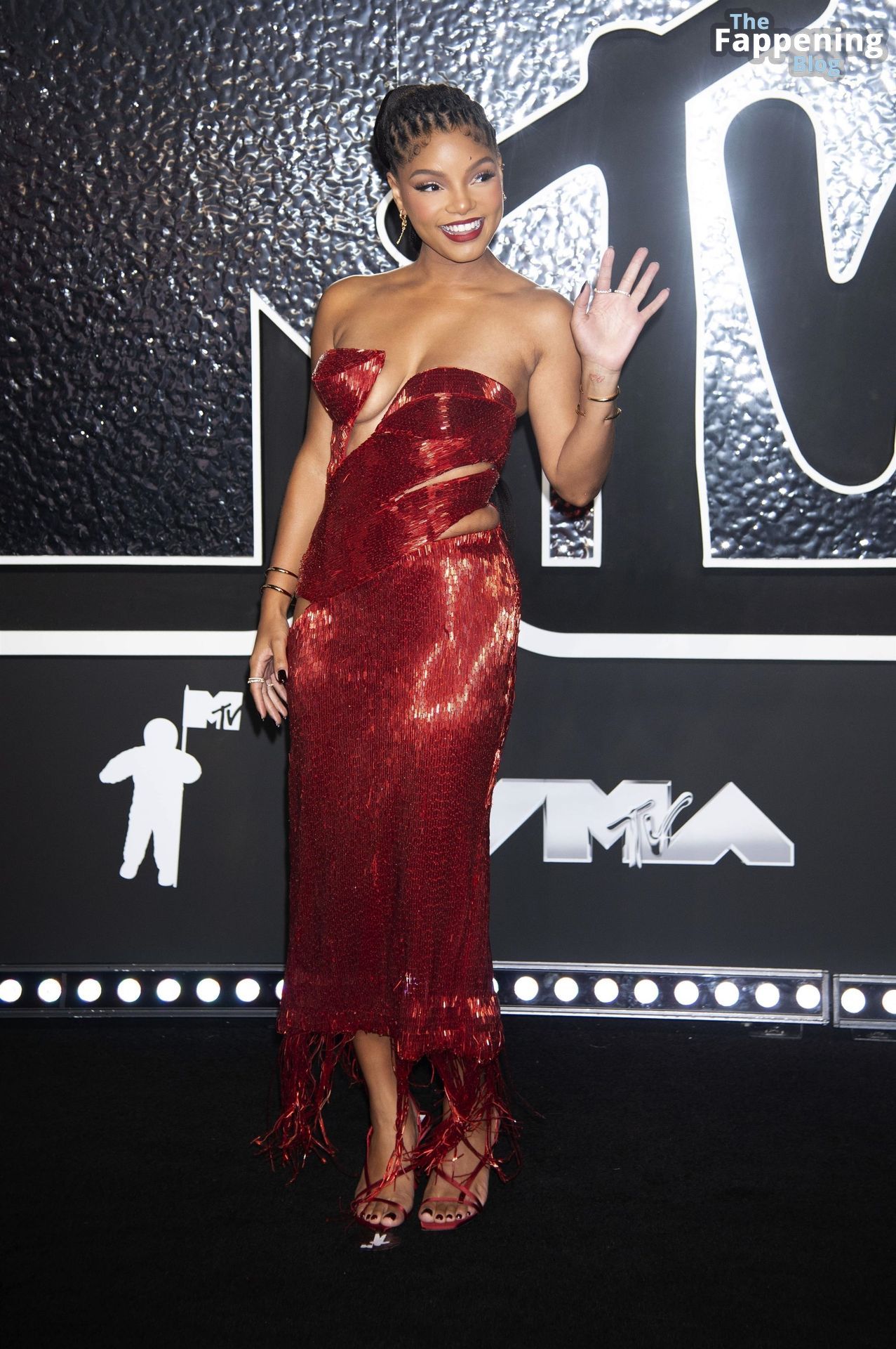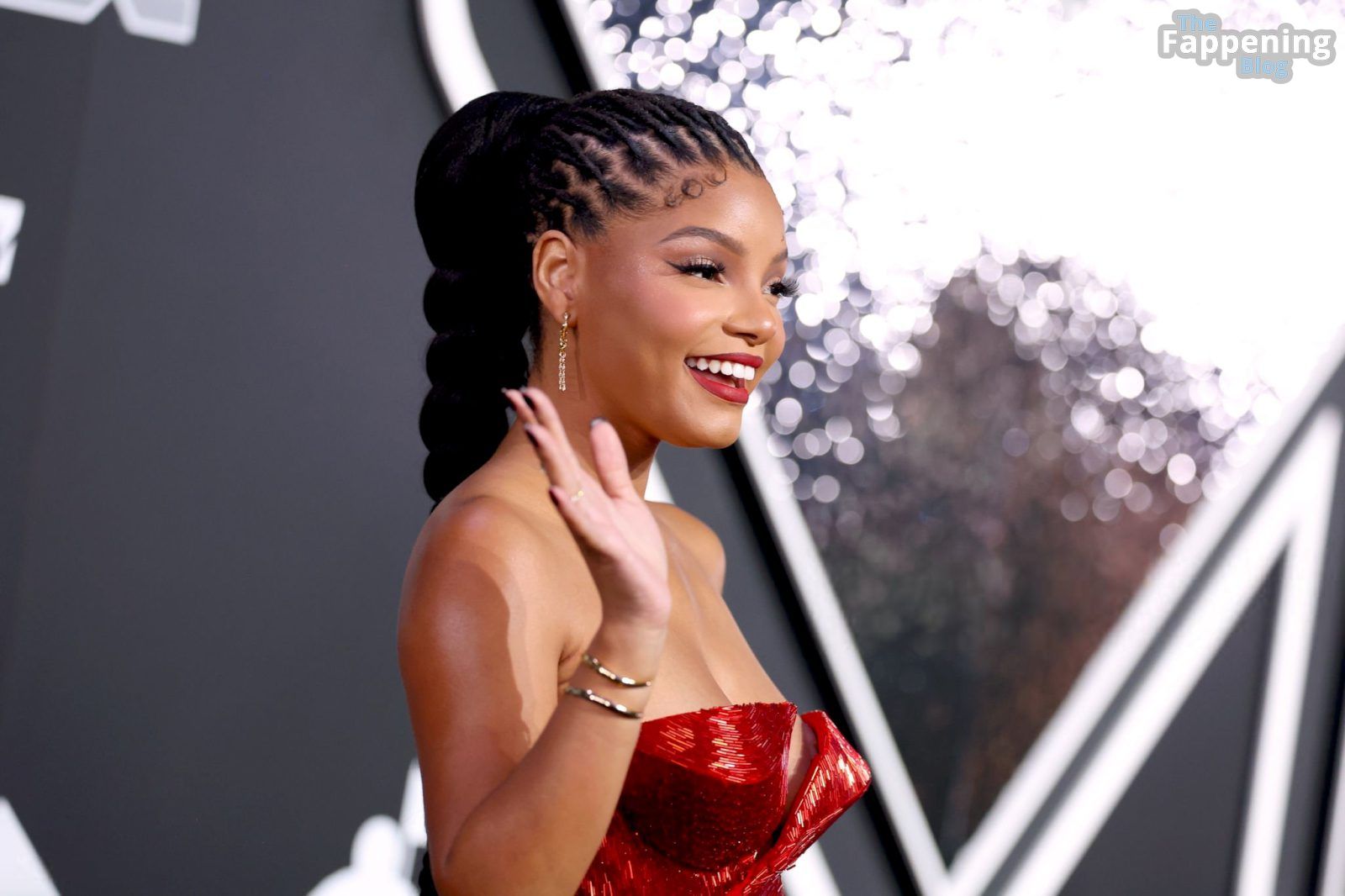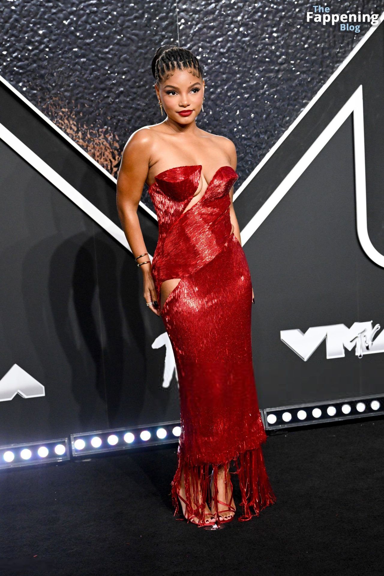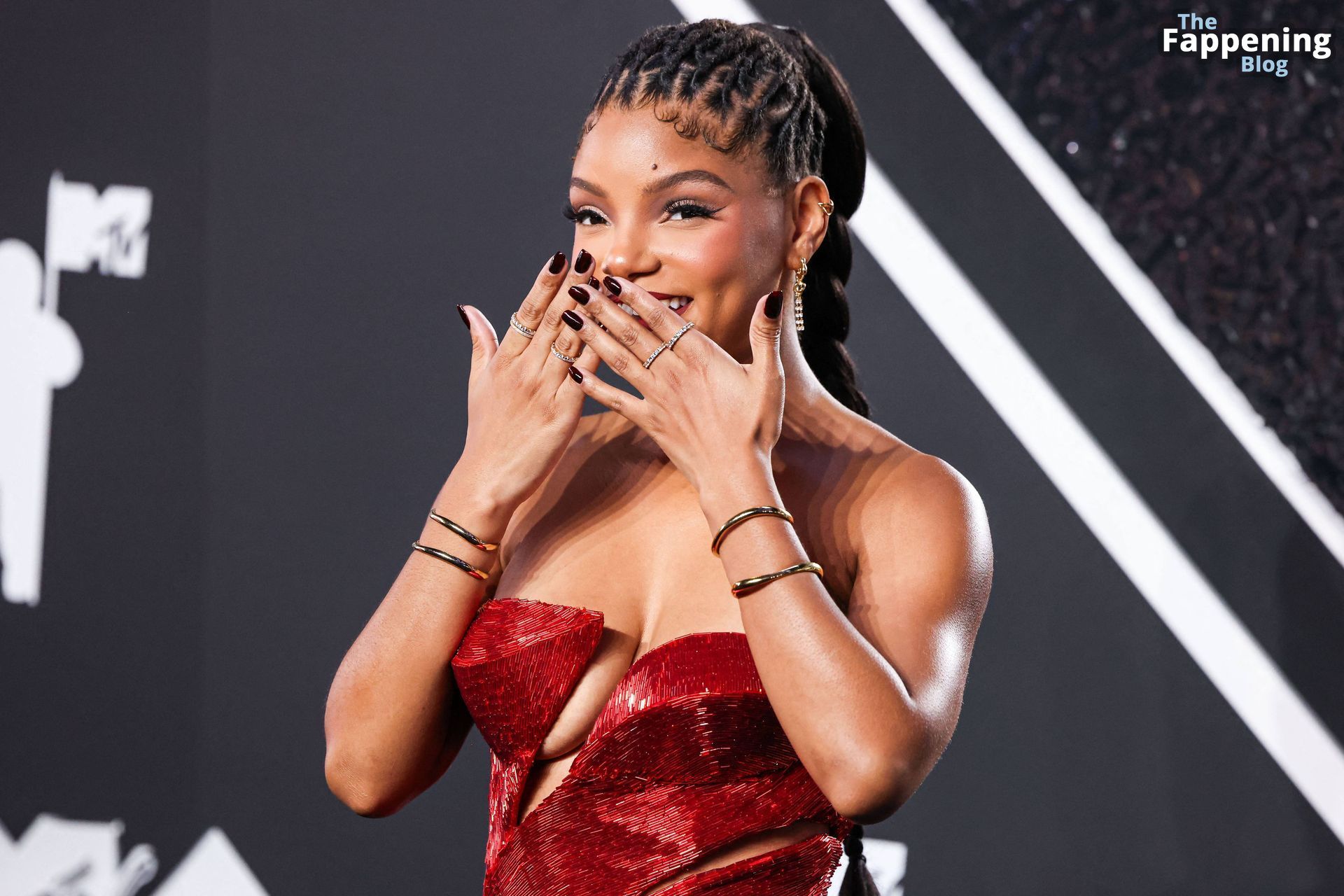 Halle Bailey is seen at the MTV VMAs in NYC, turnin’ heads with her bold, cleavage-baring look. Peep her outfit and that revealing style.