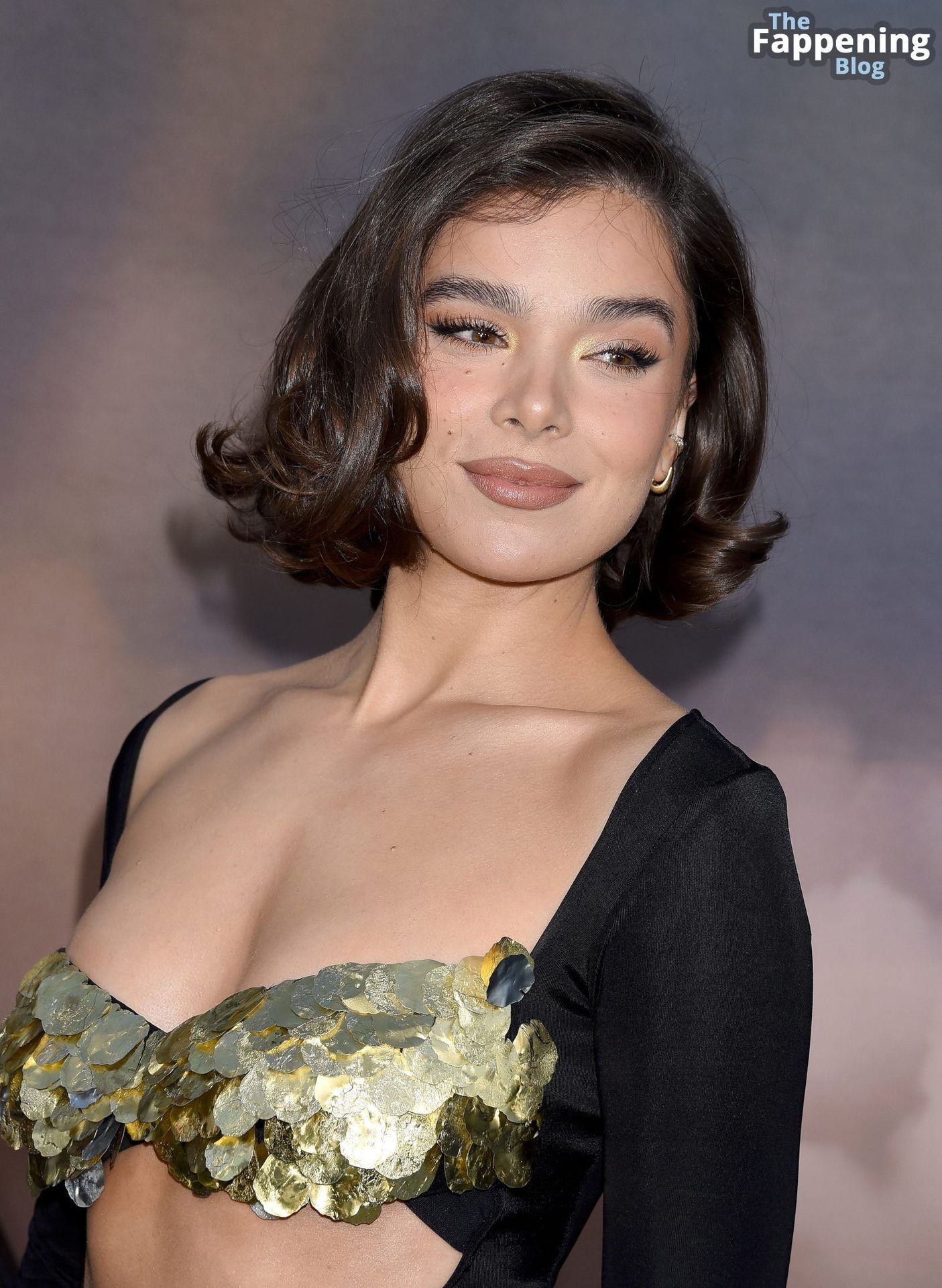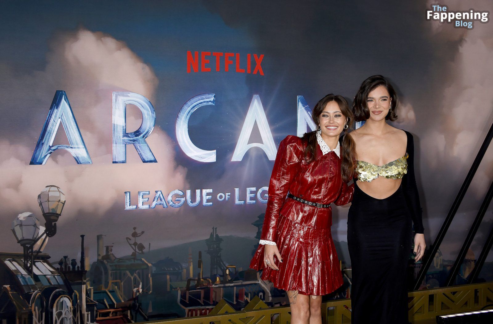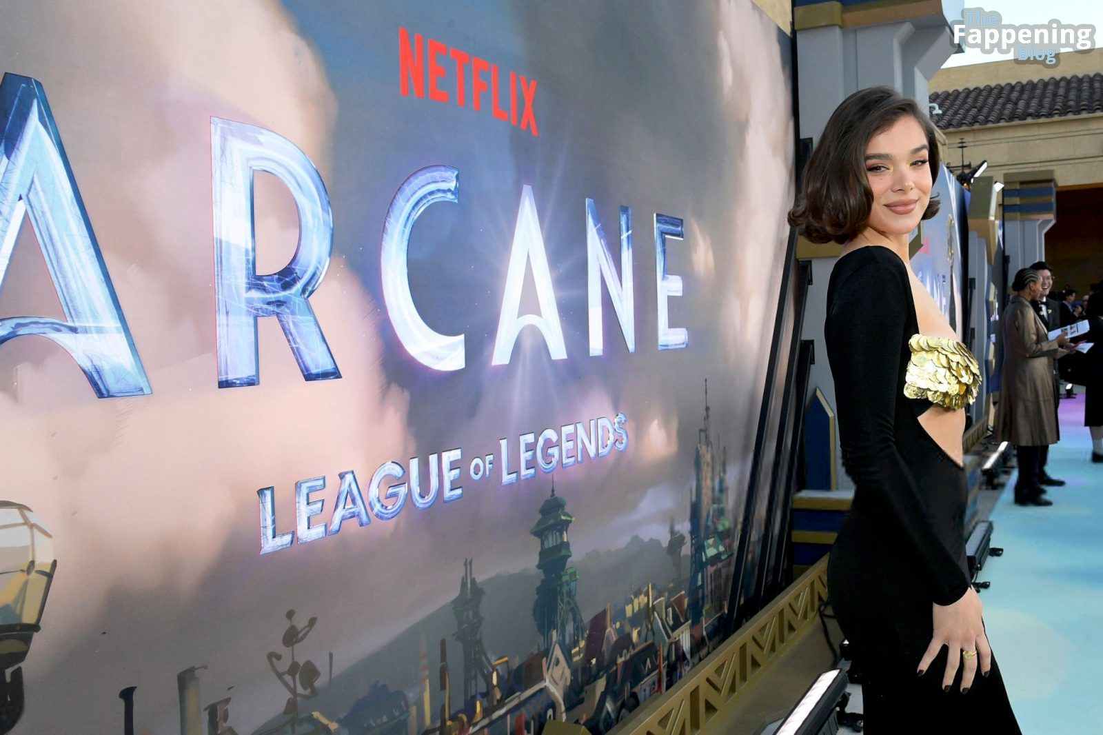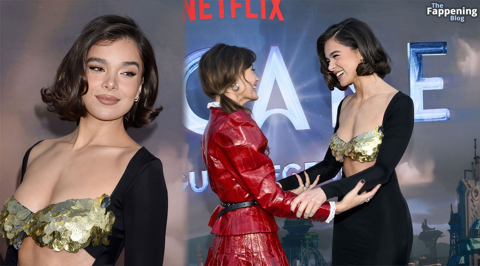 Hailee Steinfeld is seen in a bold black gown with a cleavage-baring design and gold accents at the “Arcane” Season 2 premiere at The Egyptian Theatre in Hollywood in Los Angeles. Here she is, along with Mia Sinclair Jenness and Ella Purnell.