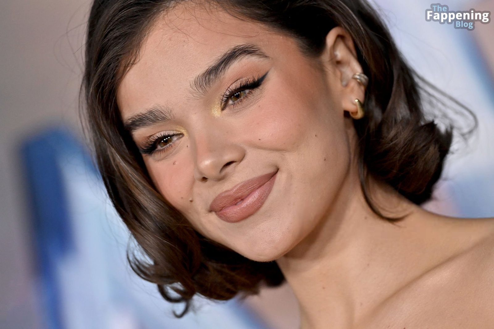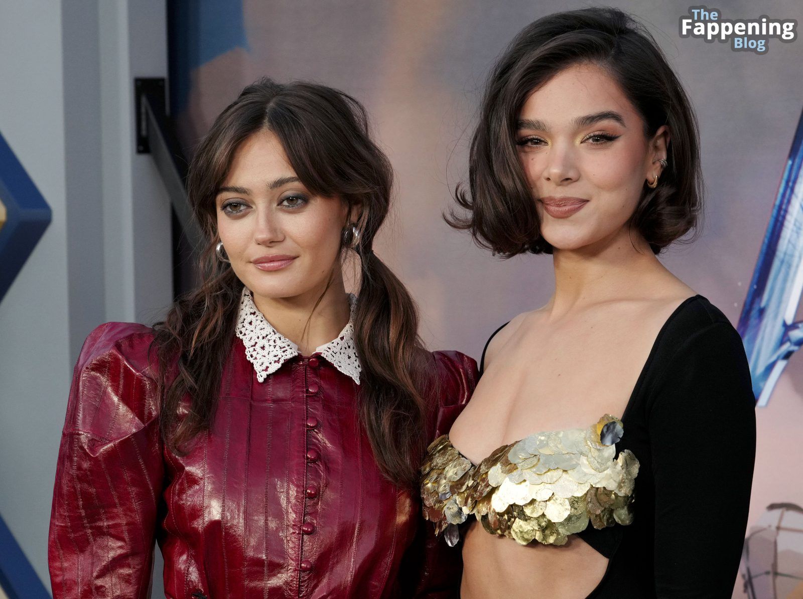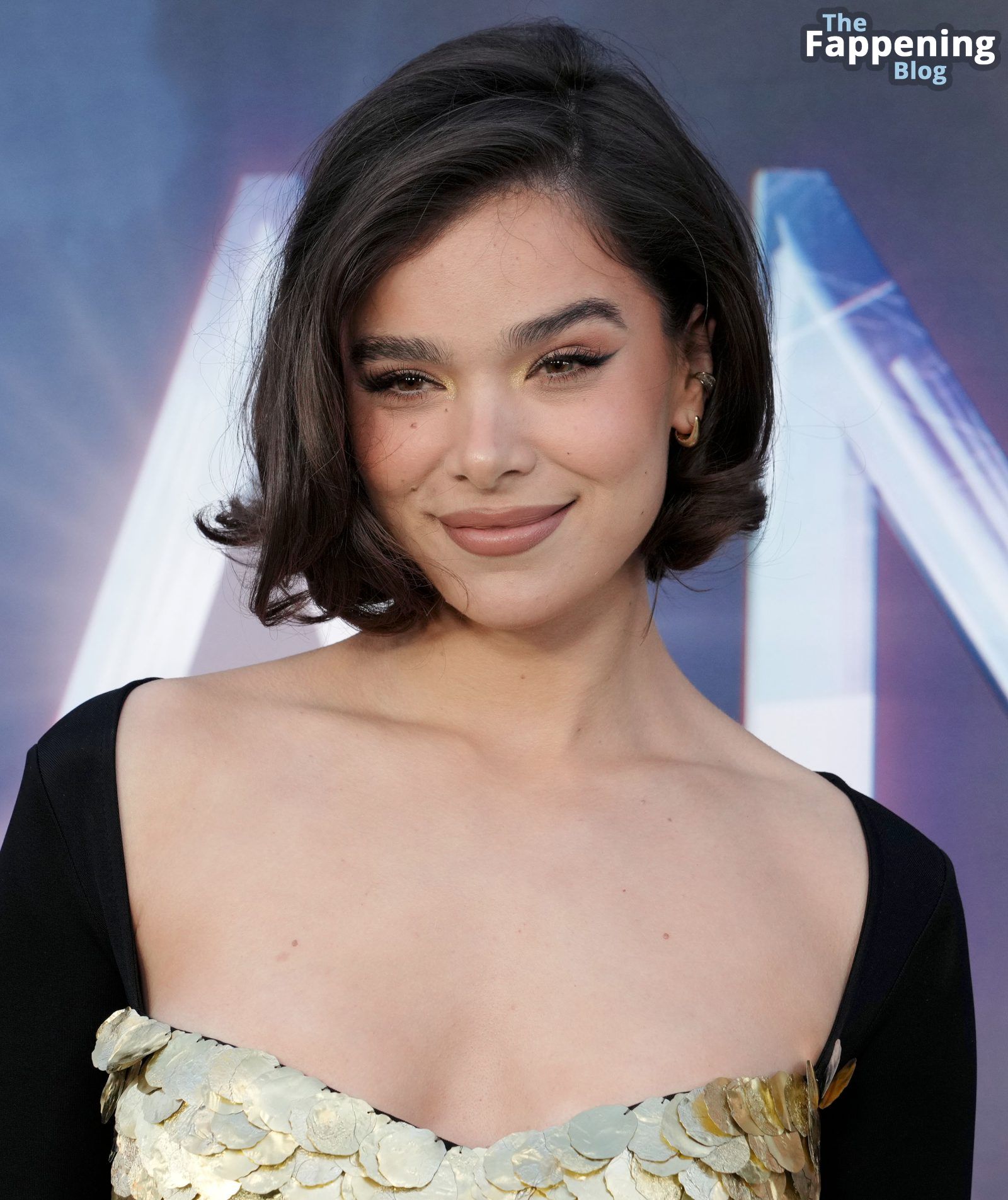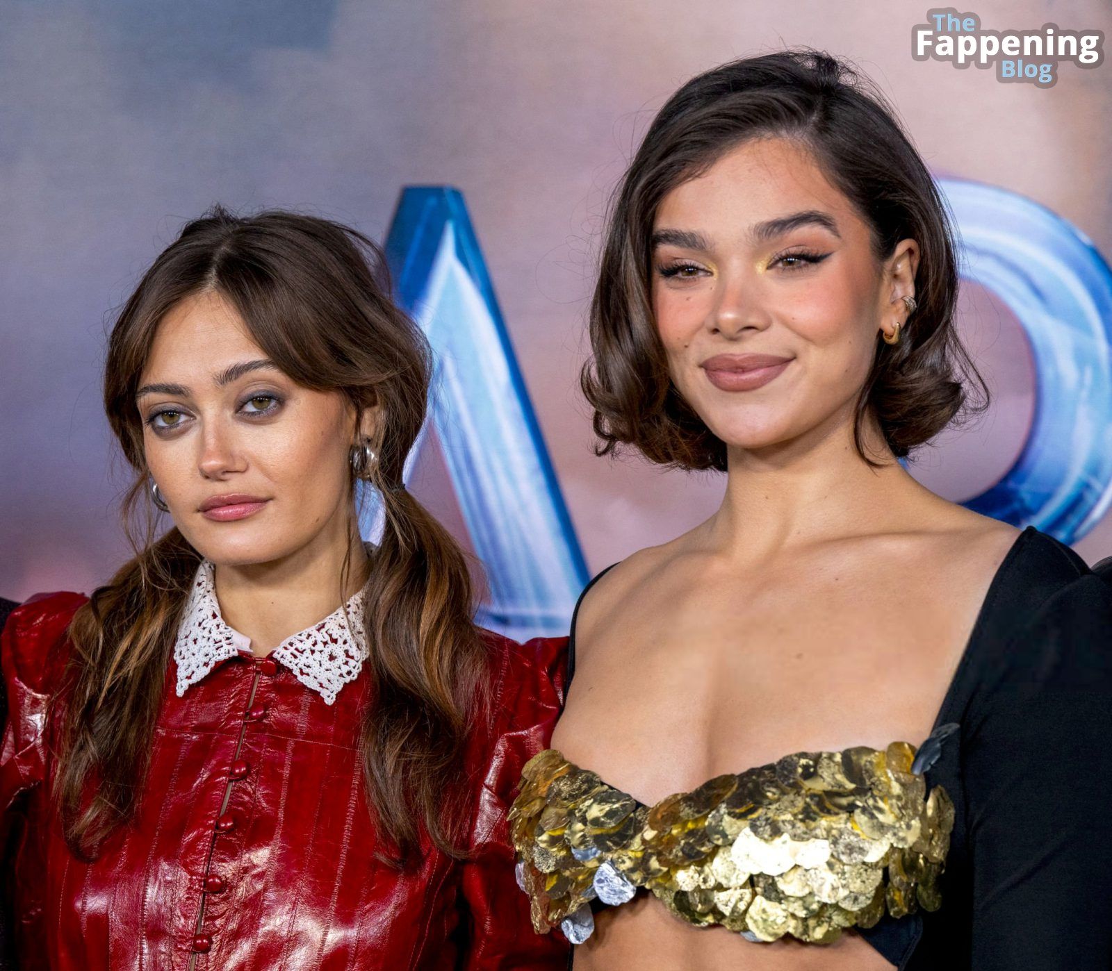 Hailee Steinfeld is seen in a bold black gown with a cleavage-baring design and gold accents at the “Arcane” Season 2 premiere at The Egyptian Theatre in Hollywood in Los Angeles. Here she is, along with Mia Sinclair Jenness and Ella Purnell.