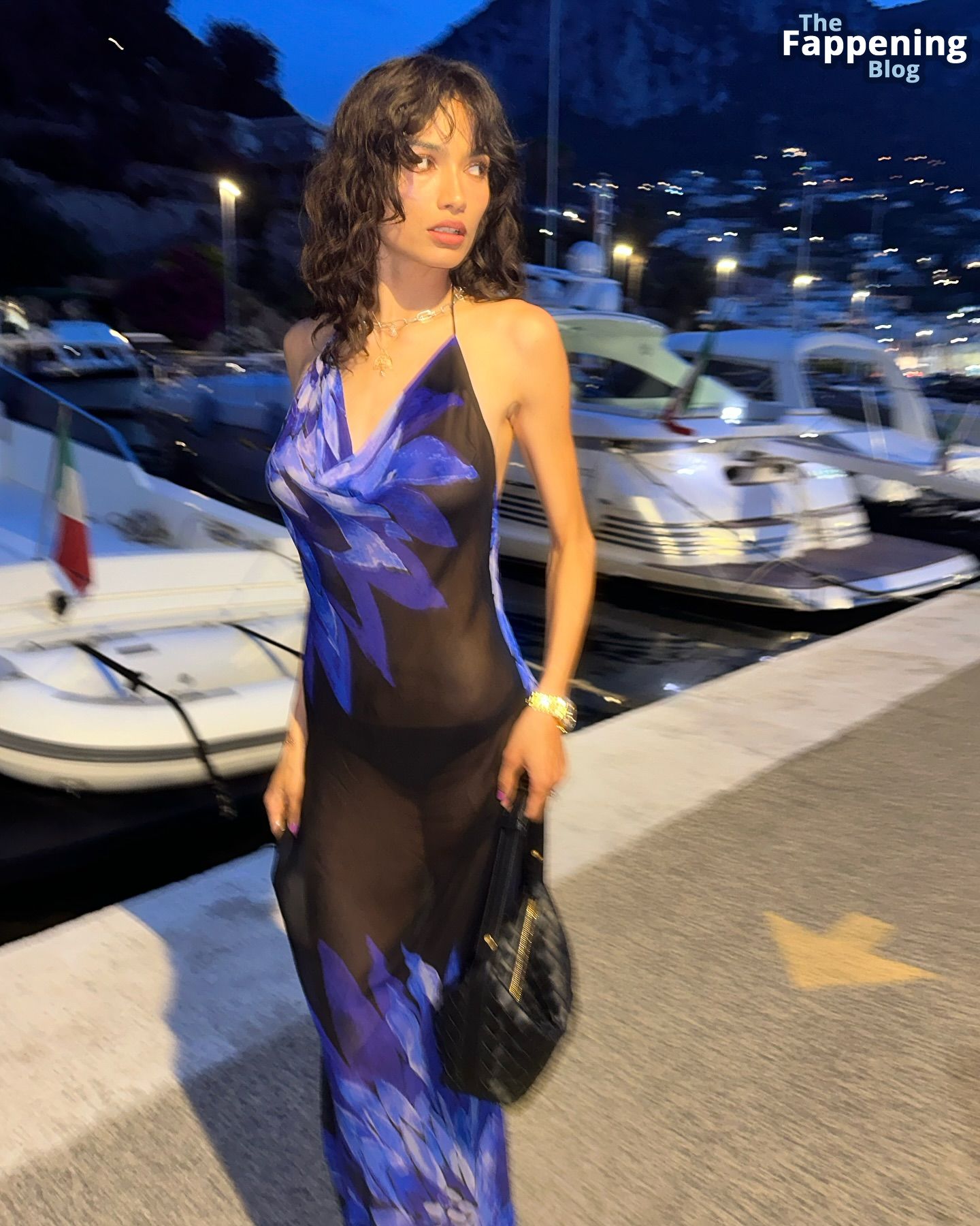Model Kelly Gale is flaunting her bare tits, going braless in a sheer frock.
