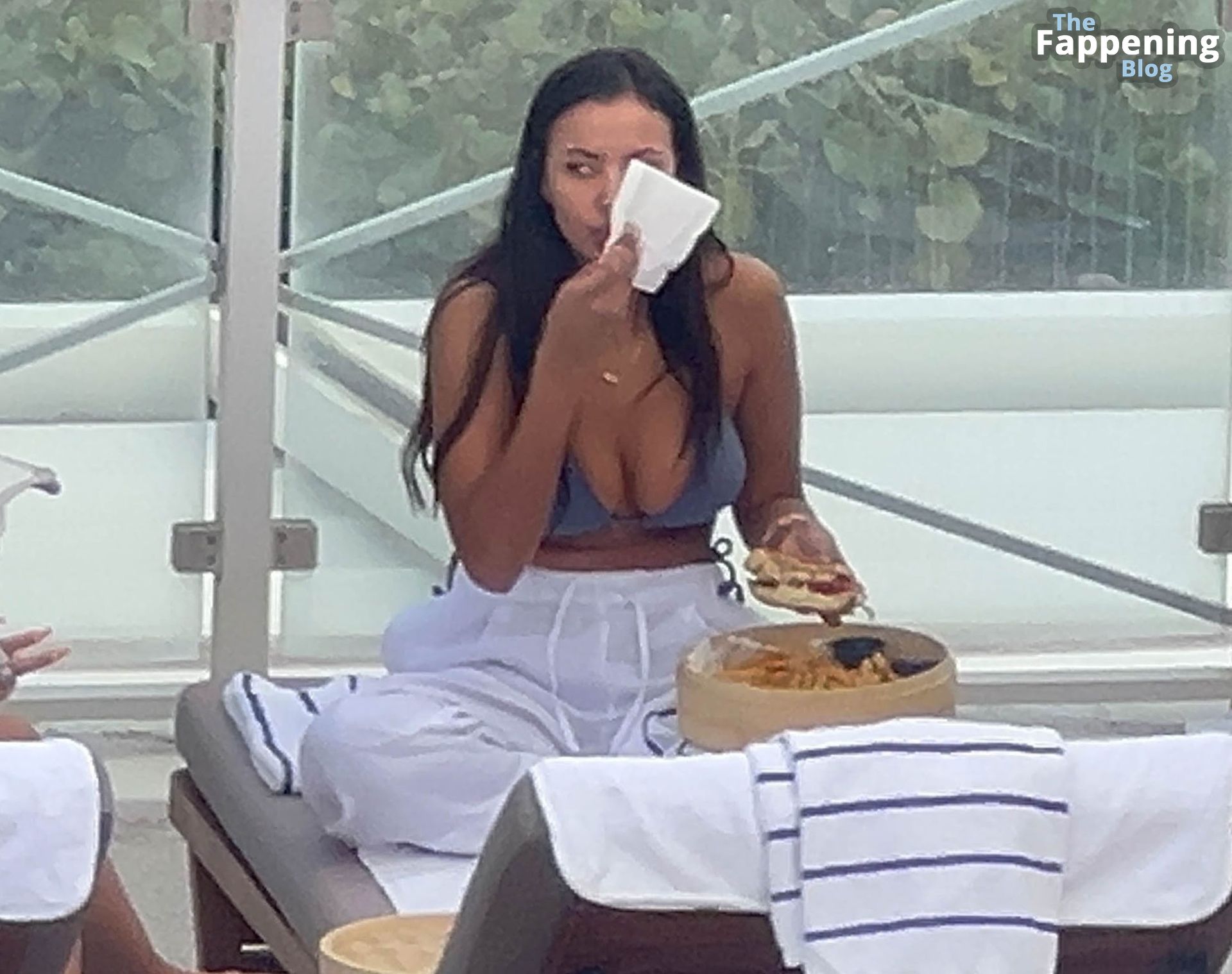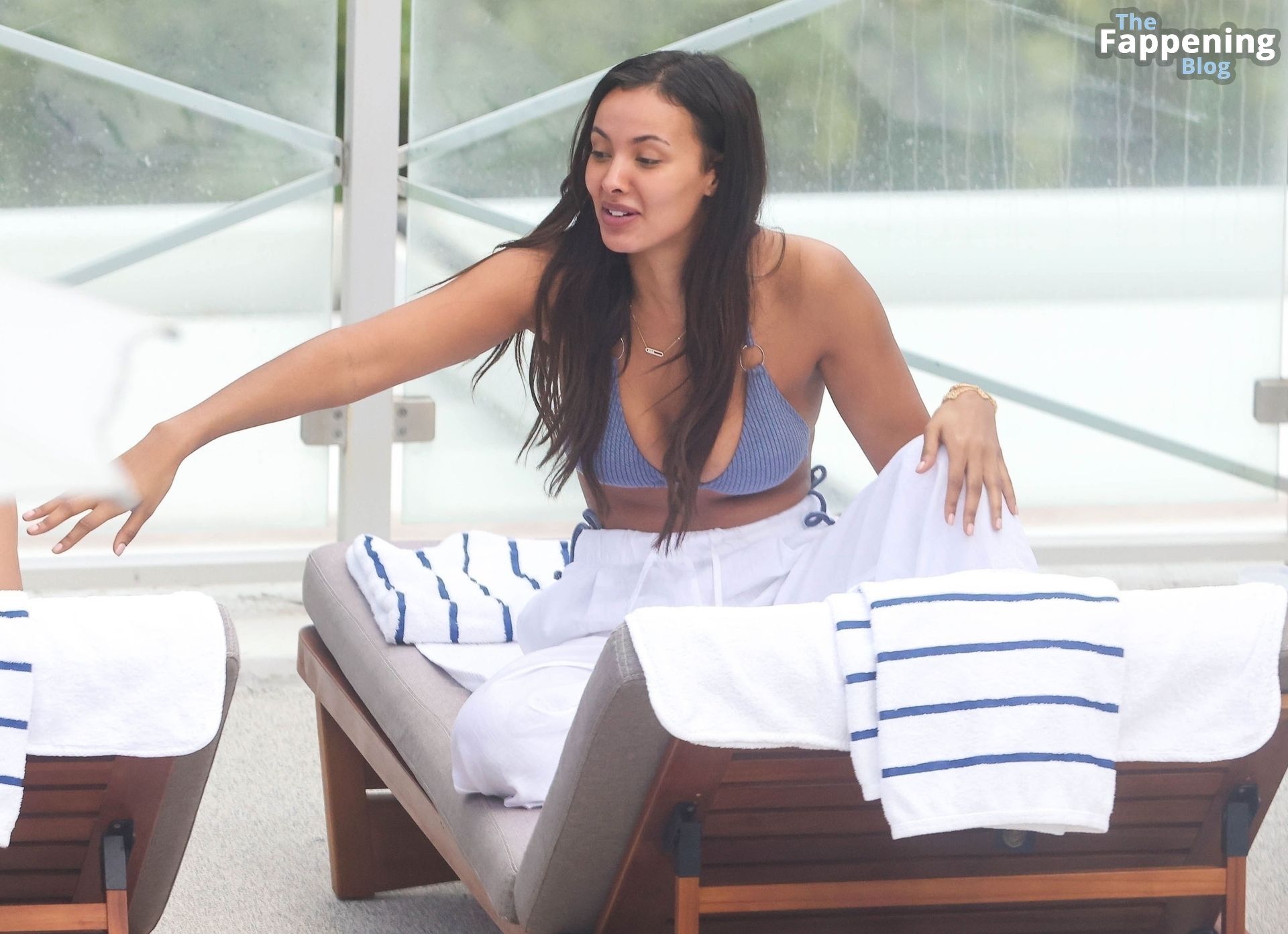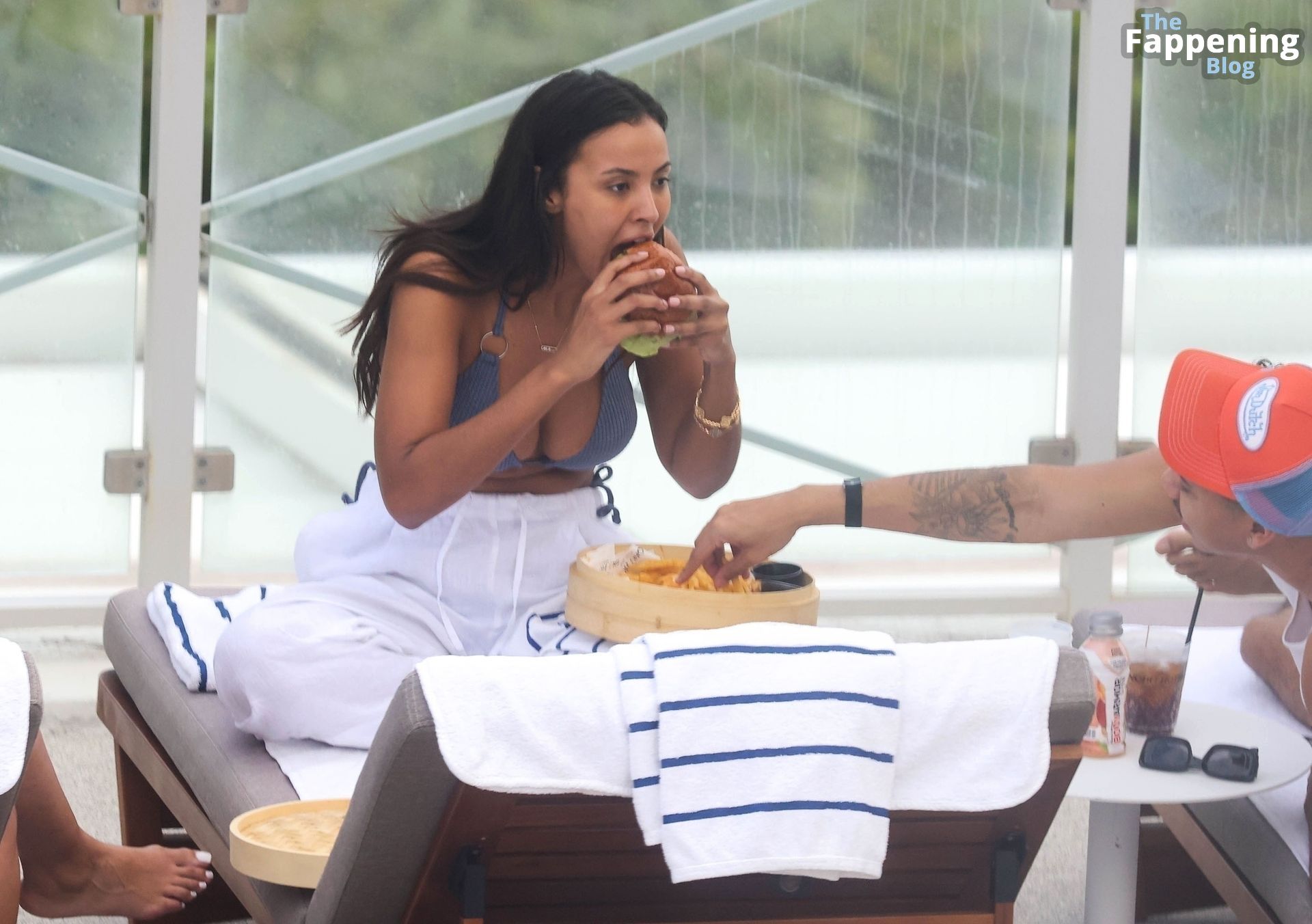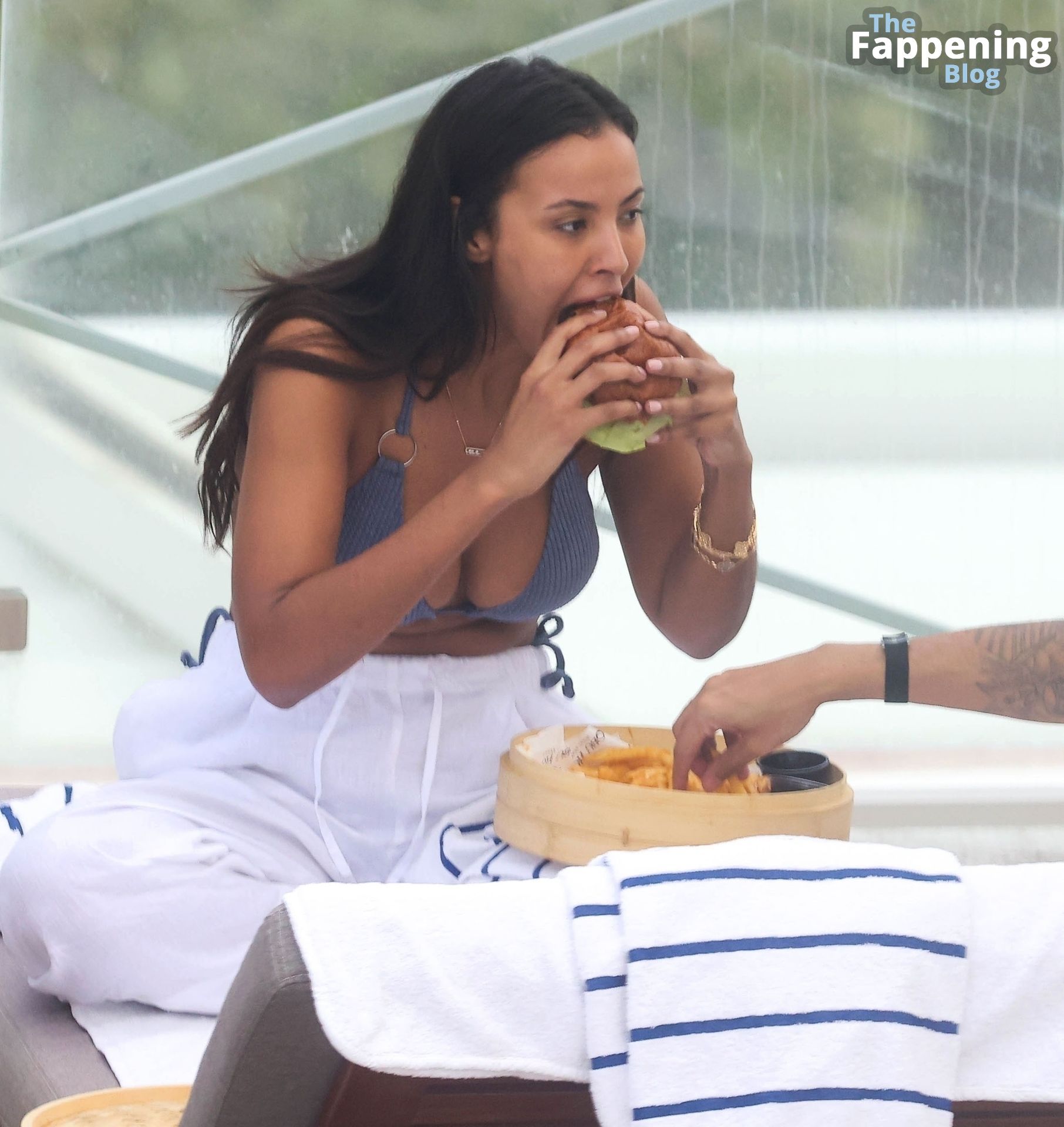 Ahead of the “Love Island All Stars” filming Maya kept it chic and looked incredible whilst enjoying a bite to eat on her sun lounger dressed in a blue bikini top and white wide-leg linen pants, complemented by her dark sunglasses and minimal jewellery as the newly single presenter seemed to be getting a lot of male attention from passers by who recognized the star and gleefully posed for selfies with her fans.