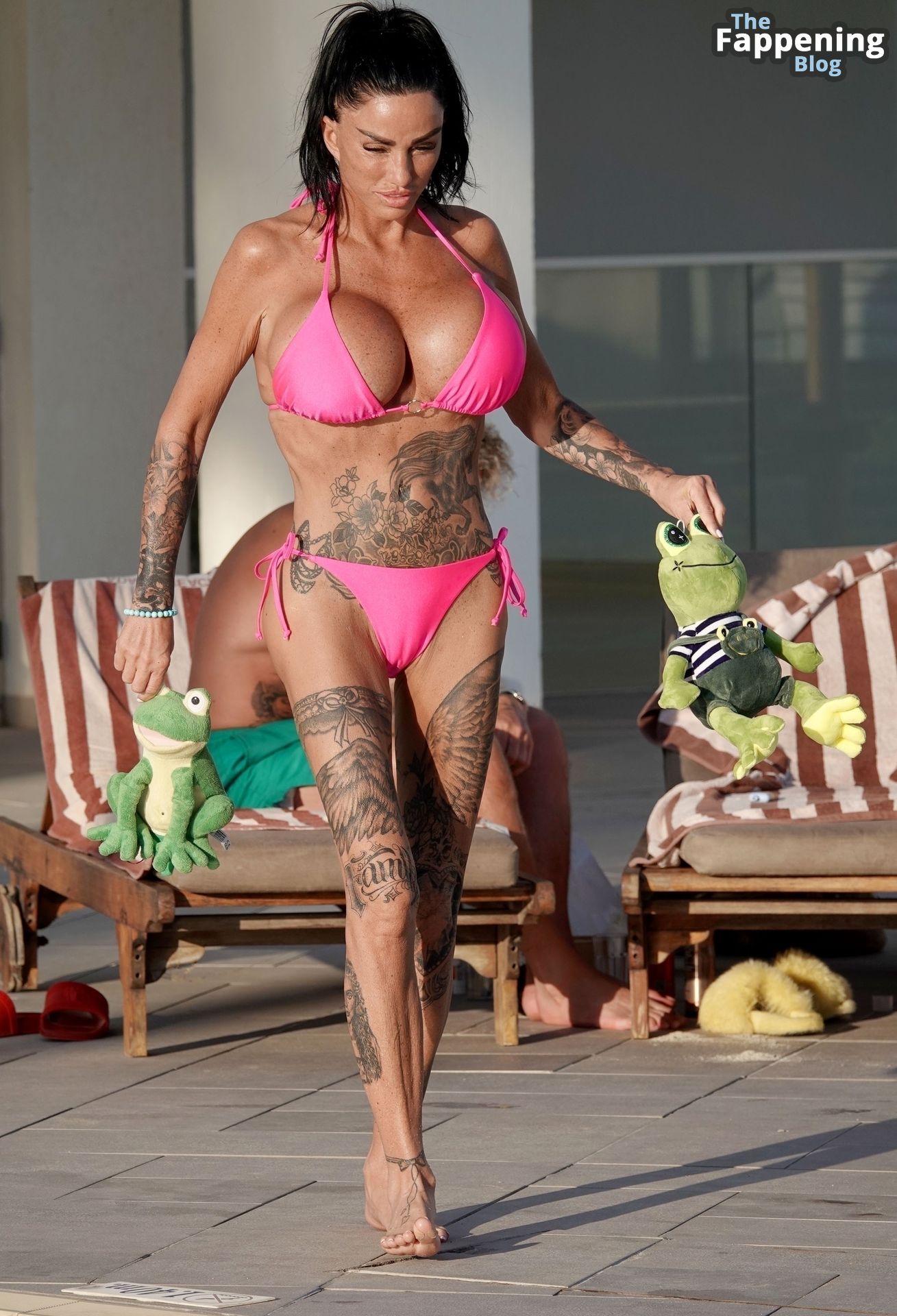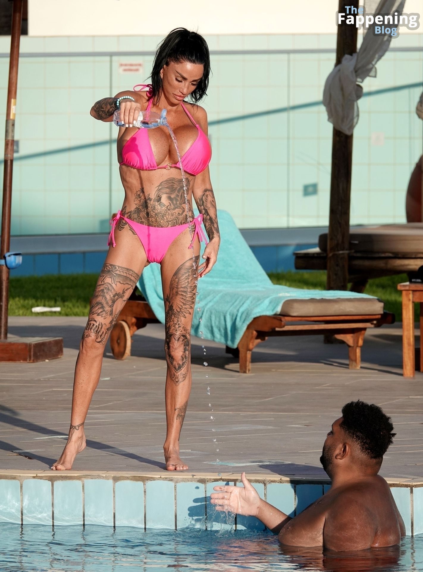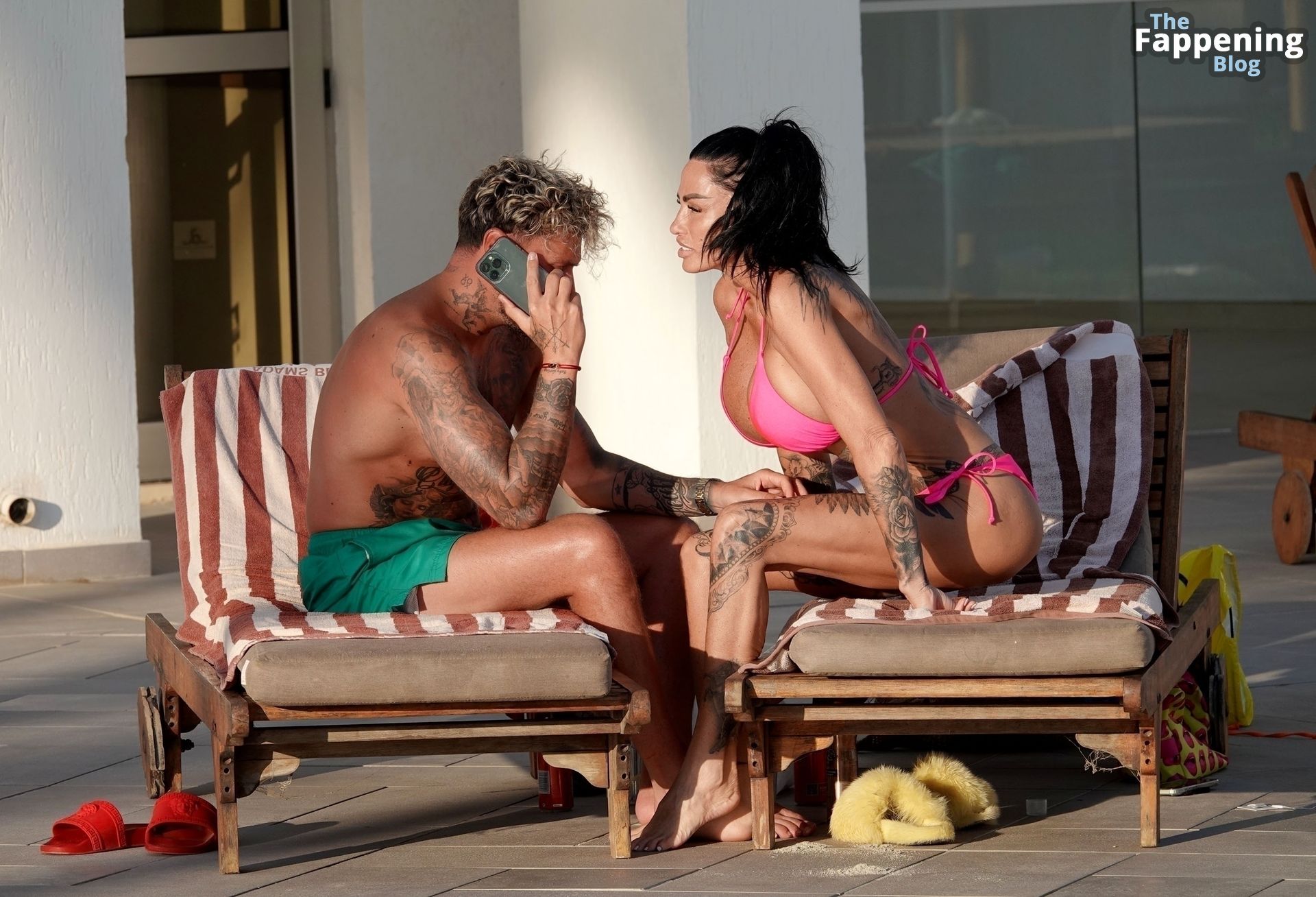 Model and reality TV star Katie Price wow’s in a pink bikini as she relaxed by the pool with her son Harvey and boyfriend JJ Slater during holiday in Cyprus.