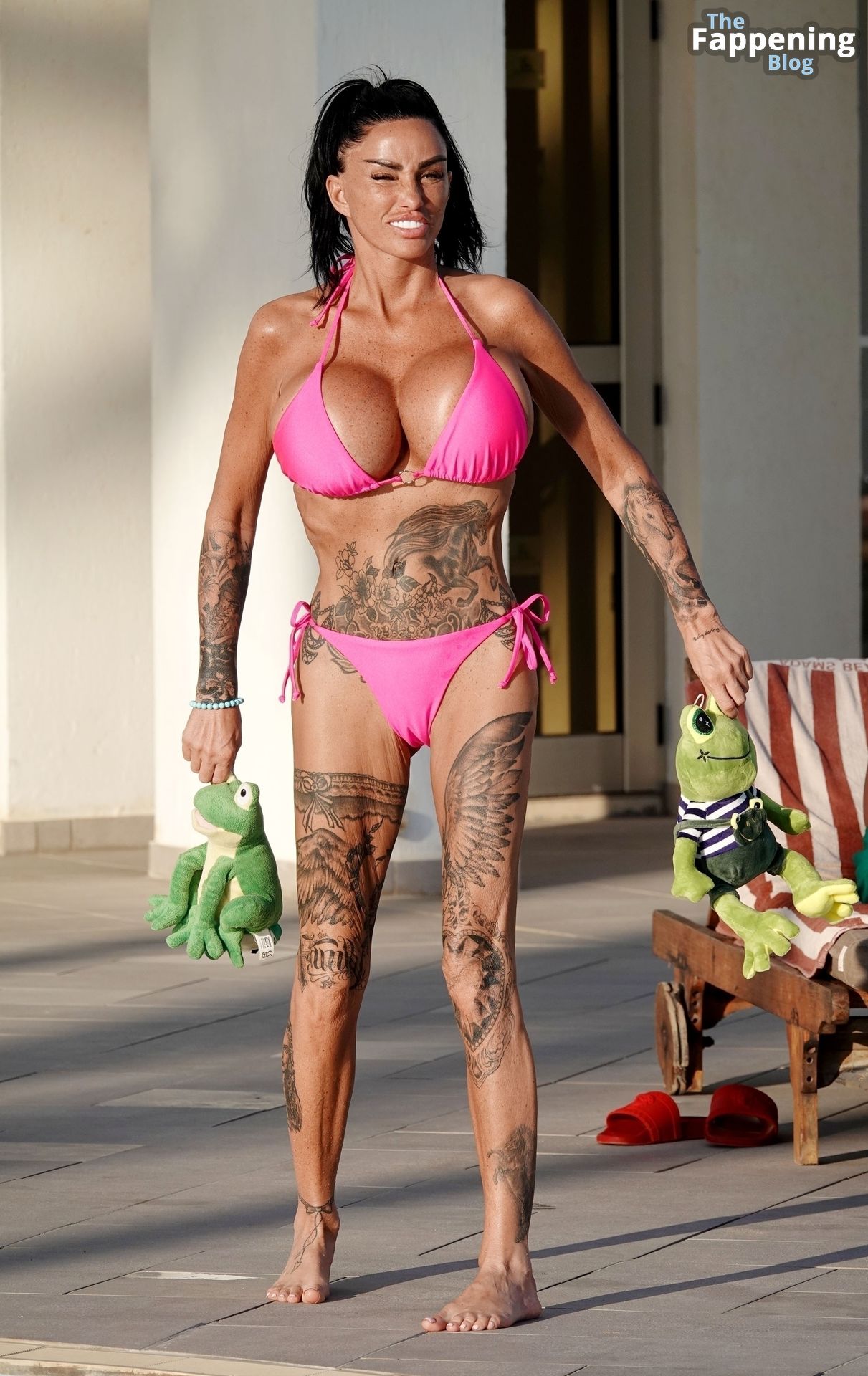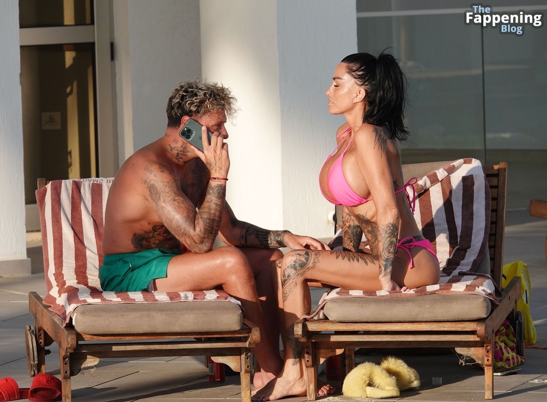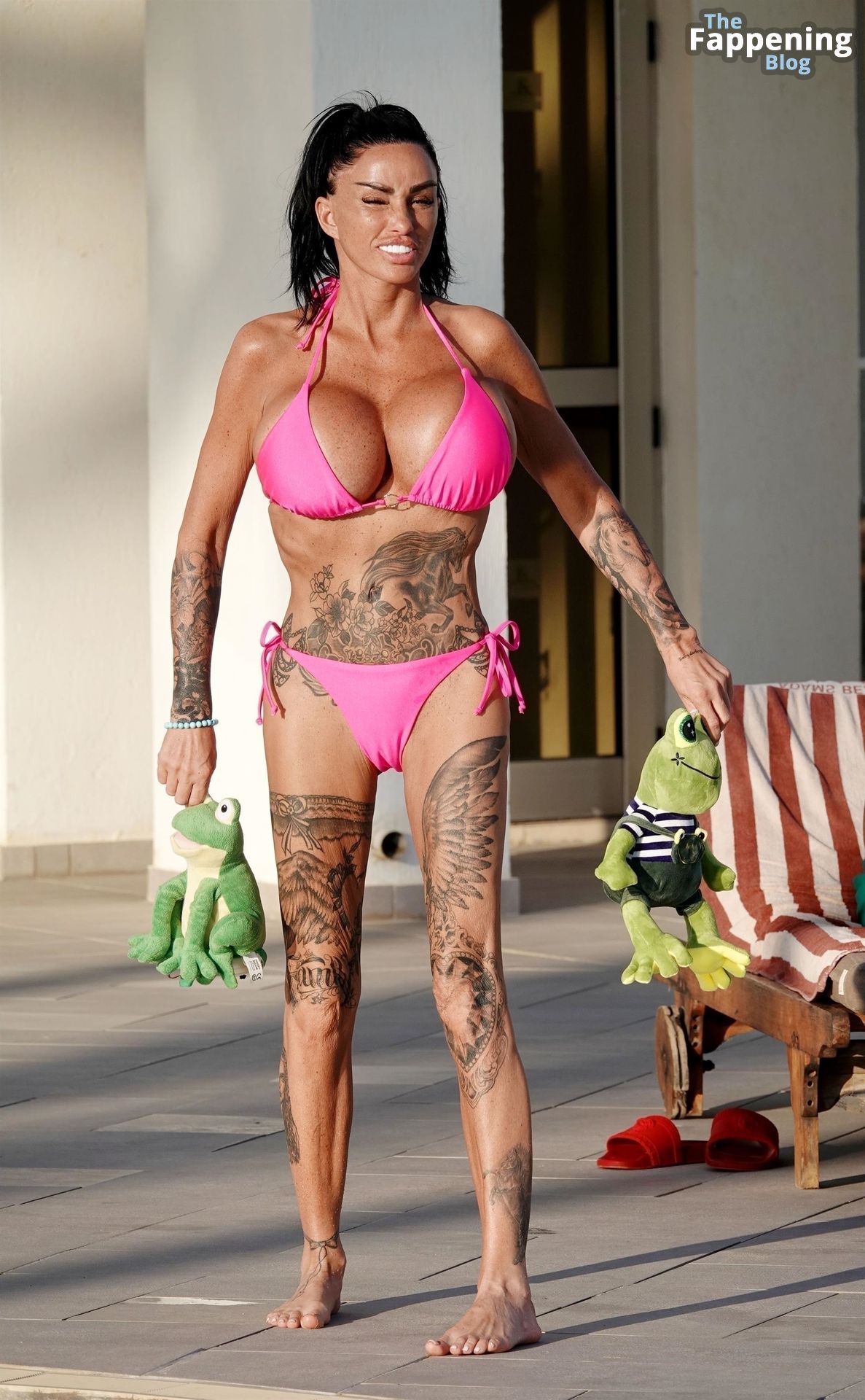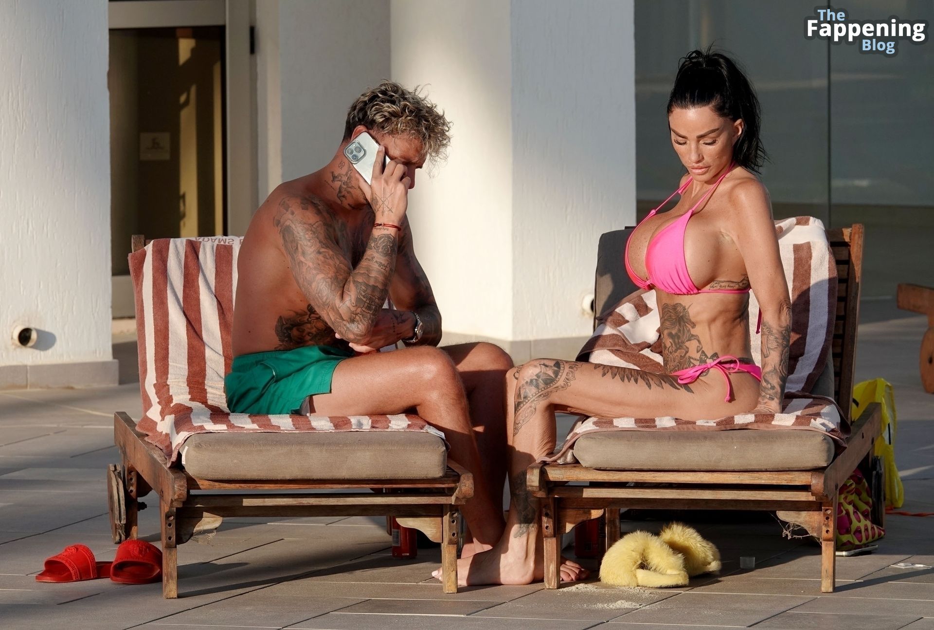 Model and reality TV star Katie Price wow’s in a pink bikini as she relaxed by the pool with her son Harvey and boyfriend JJ Slater during holiday in Cyprus.
