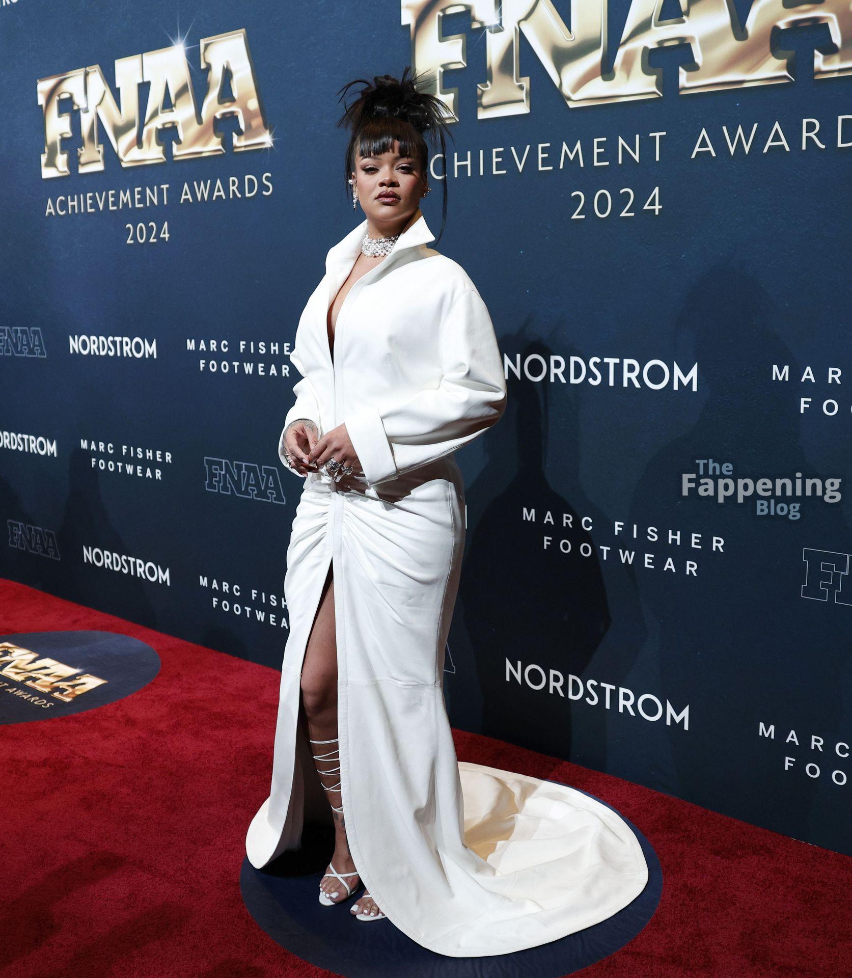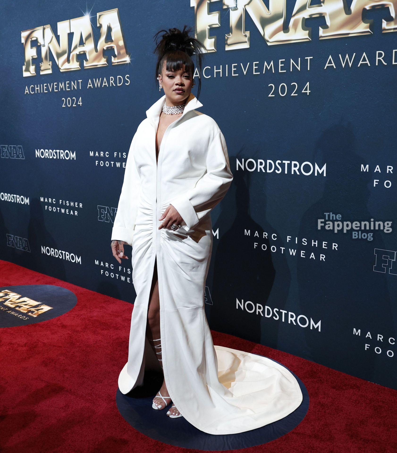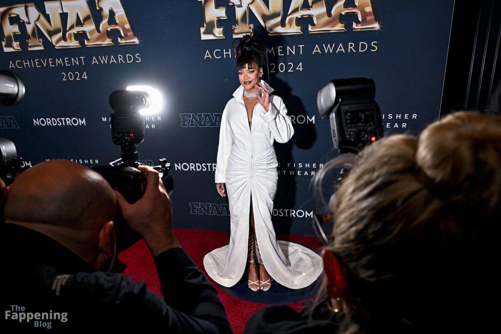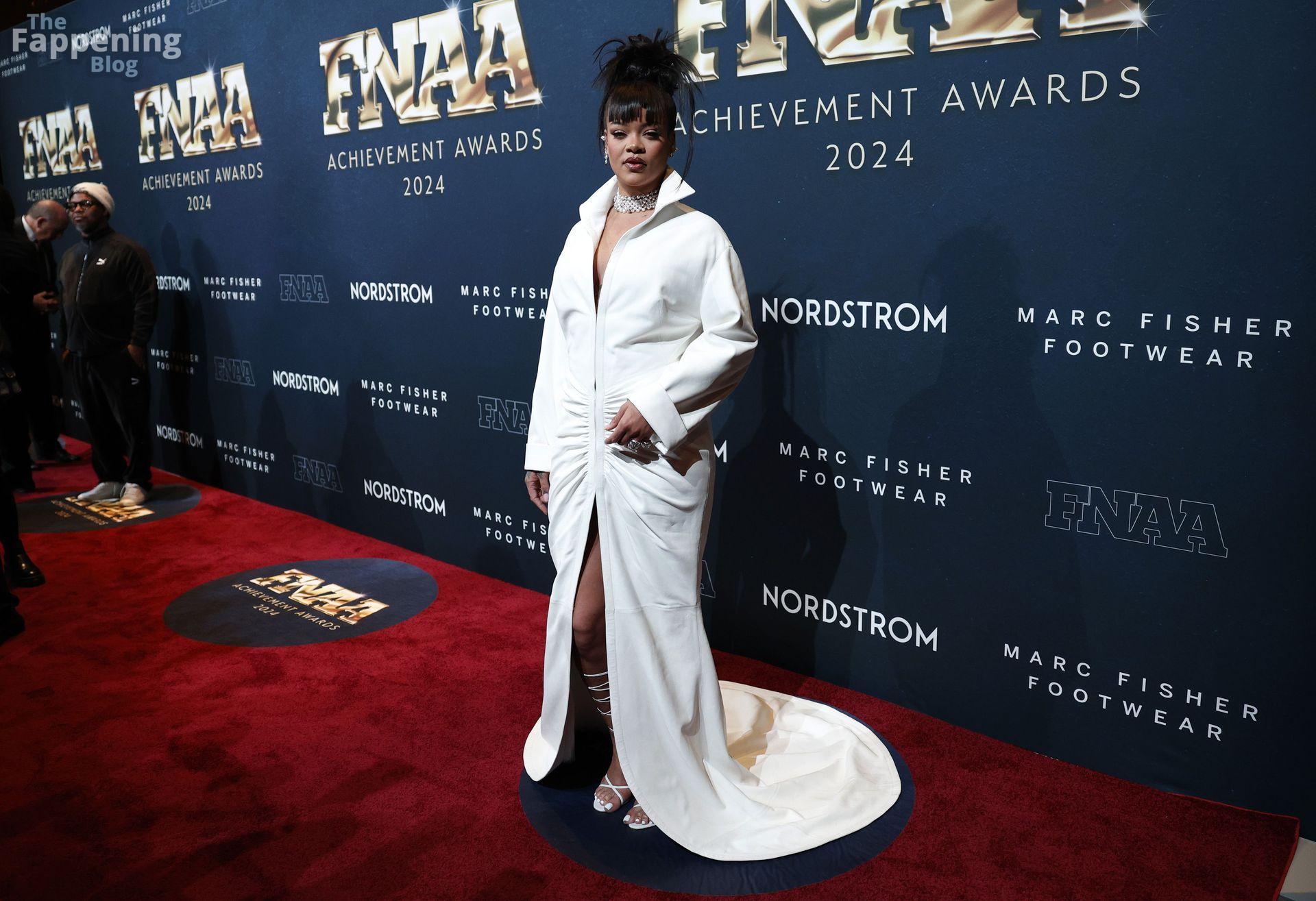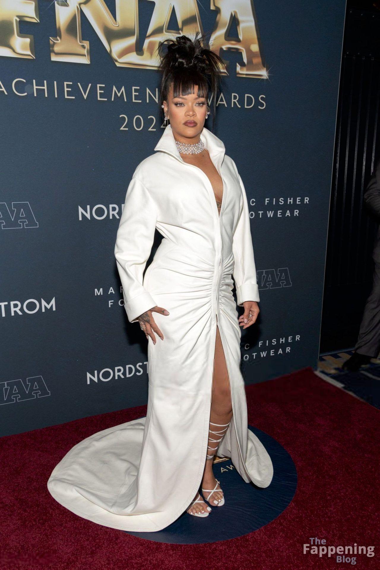 Rihanna stuns in a white dress at the 38th Annual Footwear News Achievement Awards at Cipriani South Street in New York City.