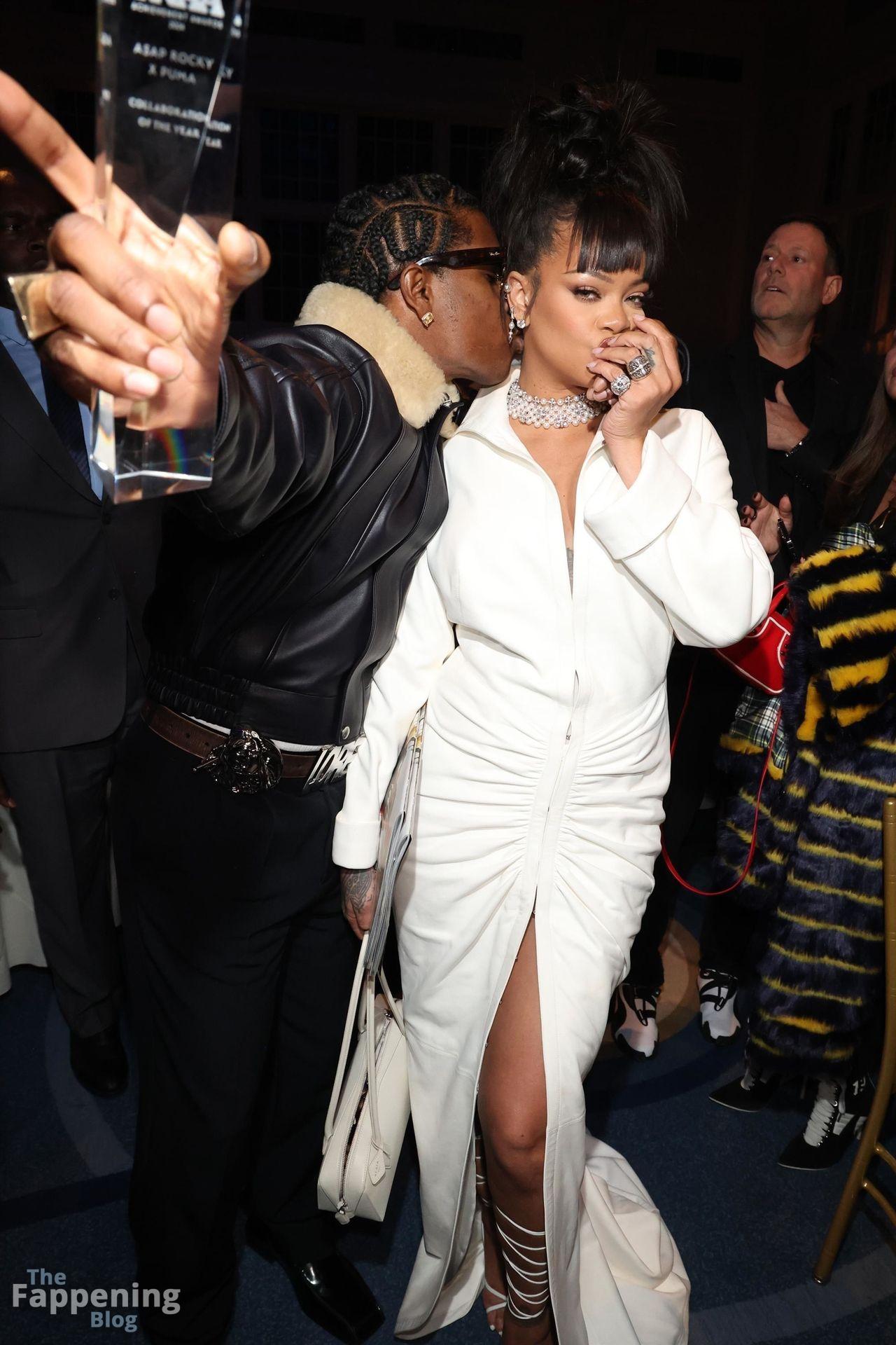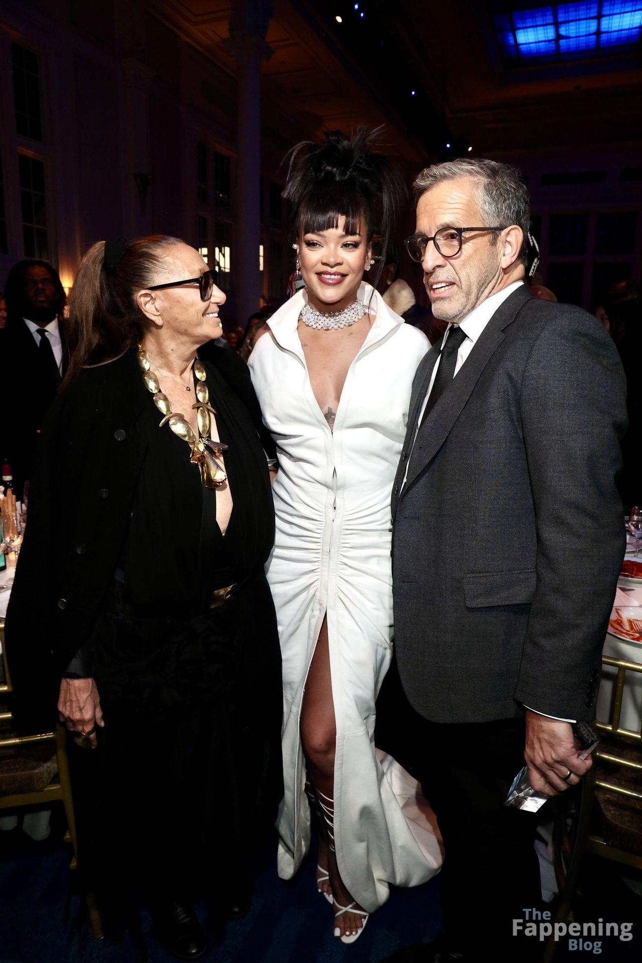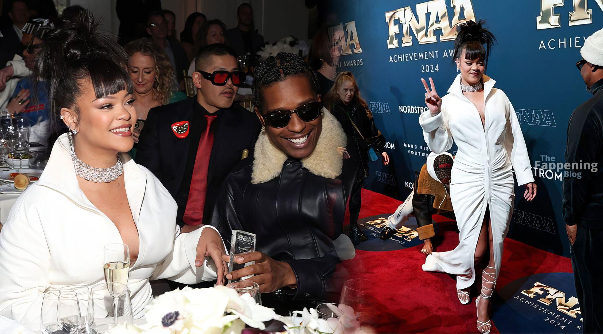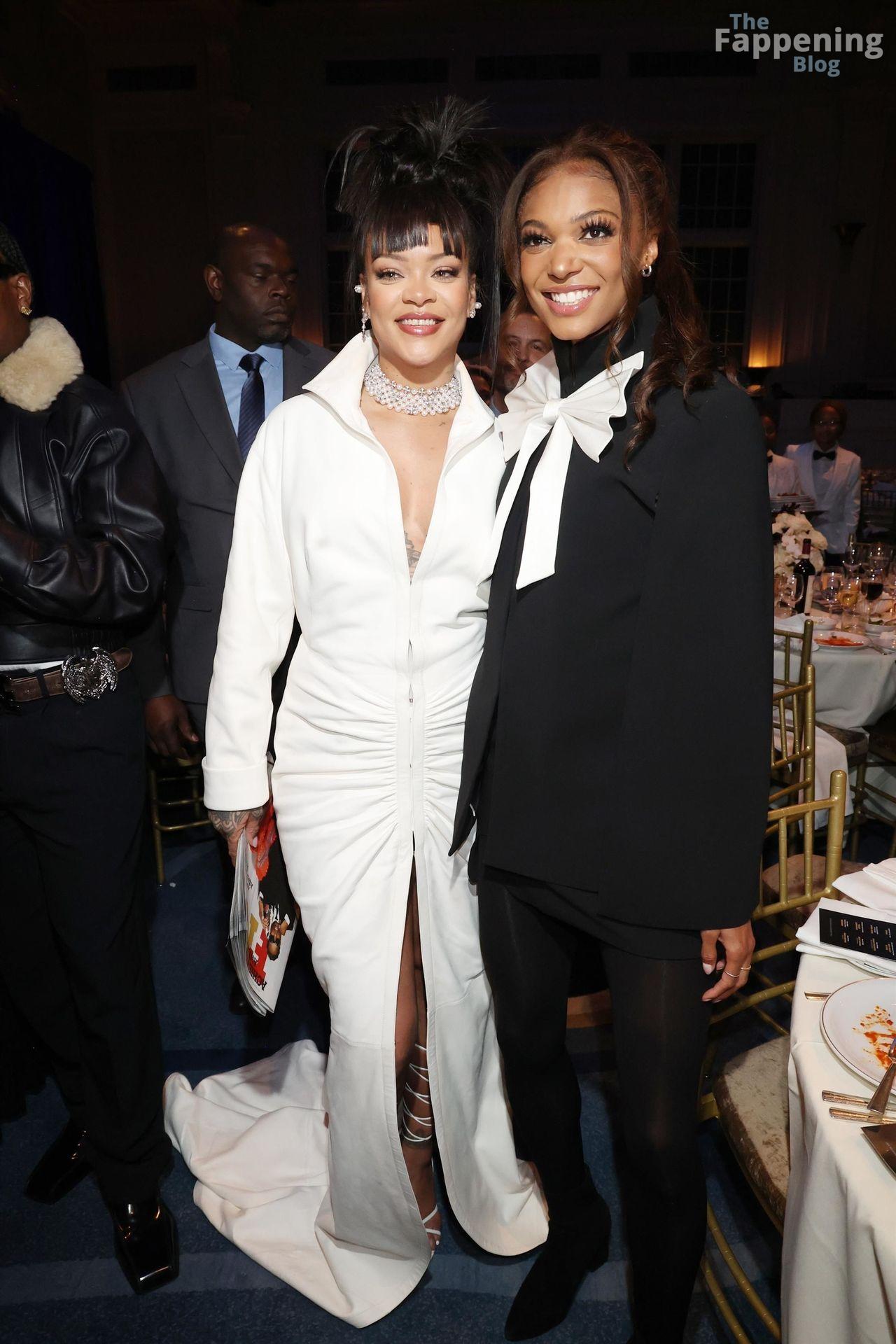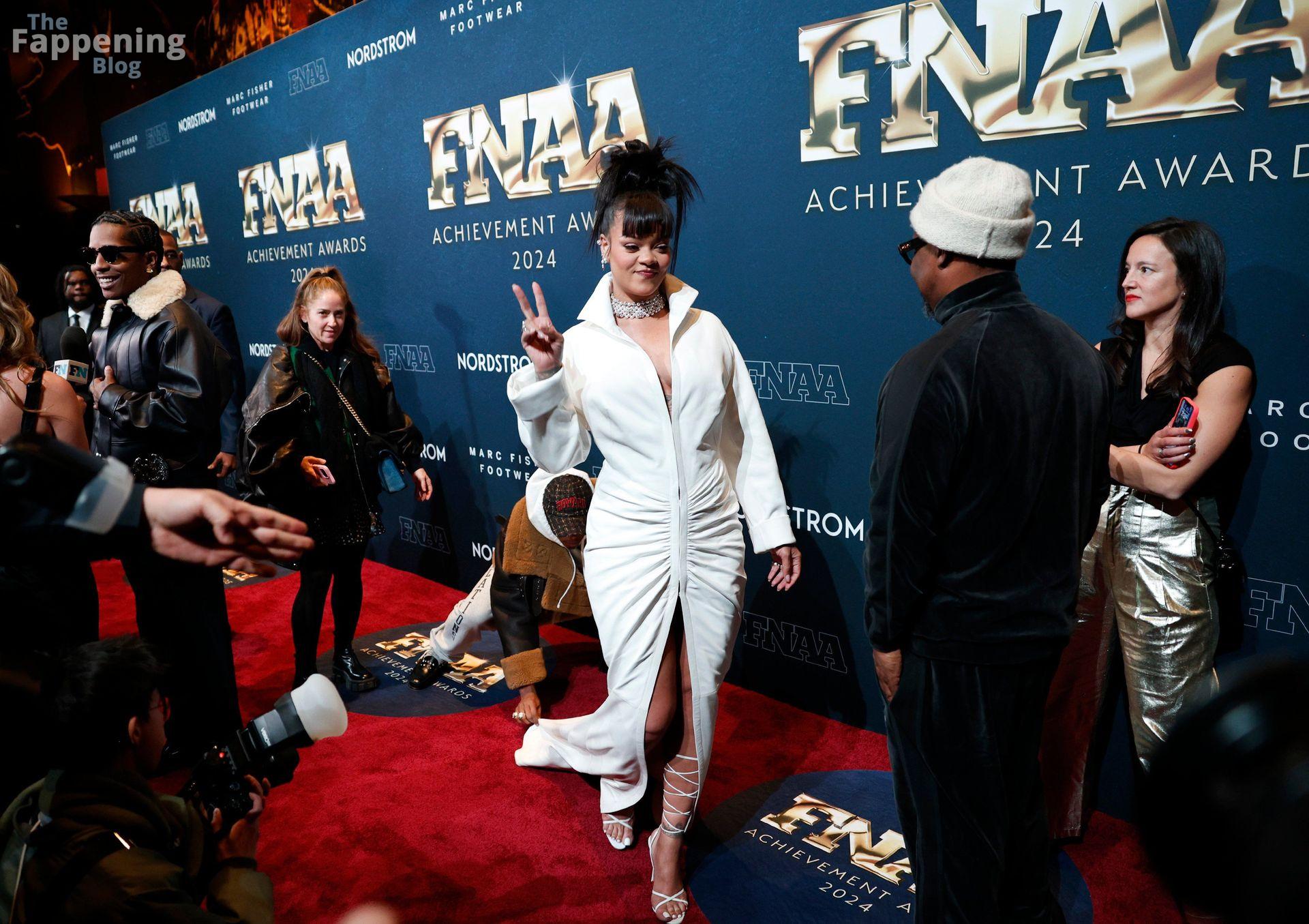 Rihanna stuns in a white dress at the 38th Annual Footwear News Achievement Awards at Cipriani South Street in New York City.