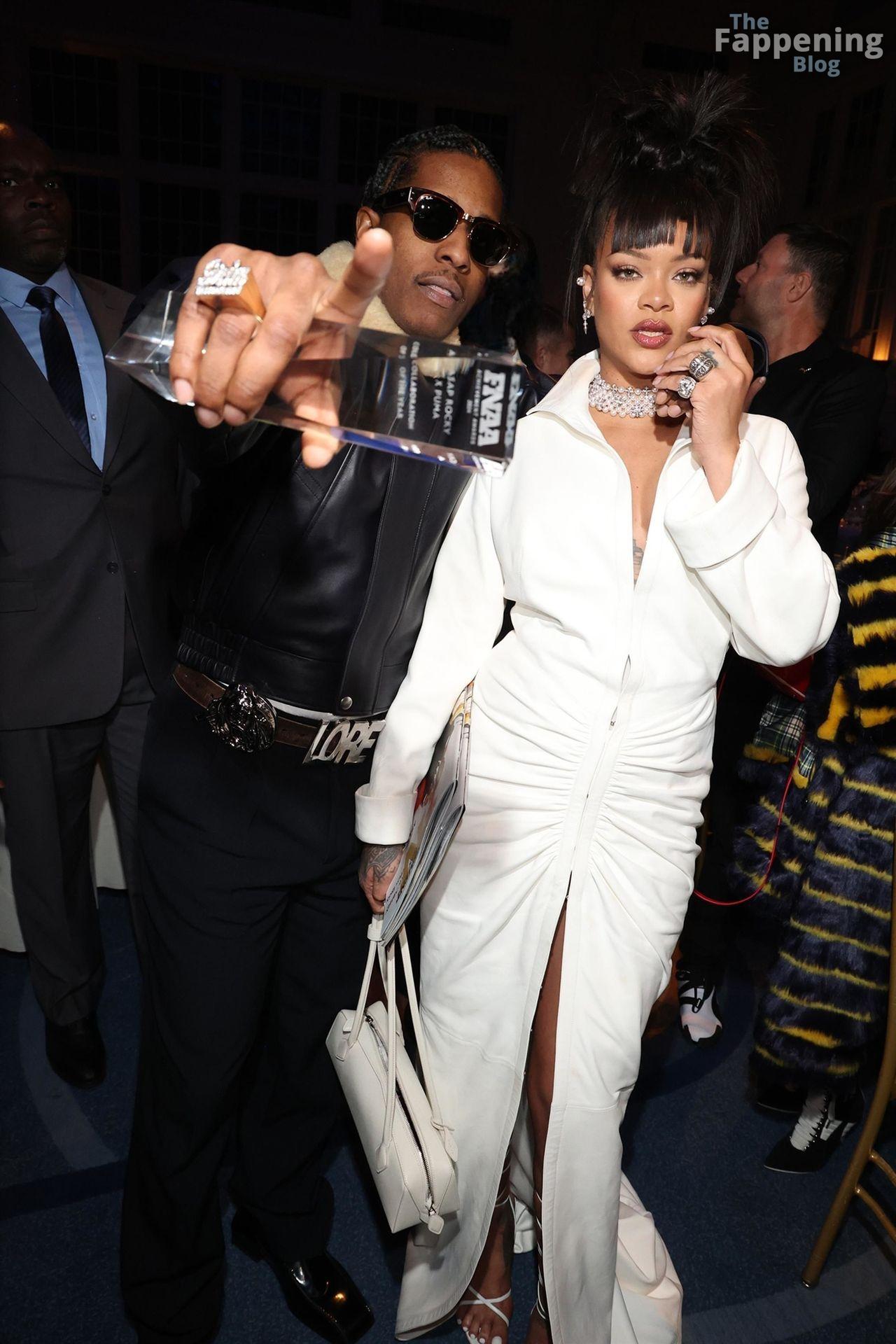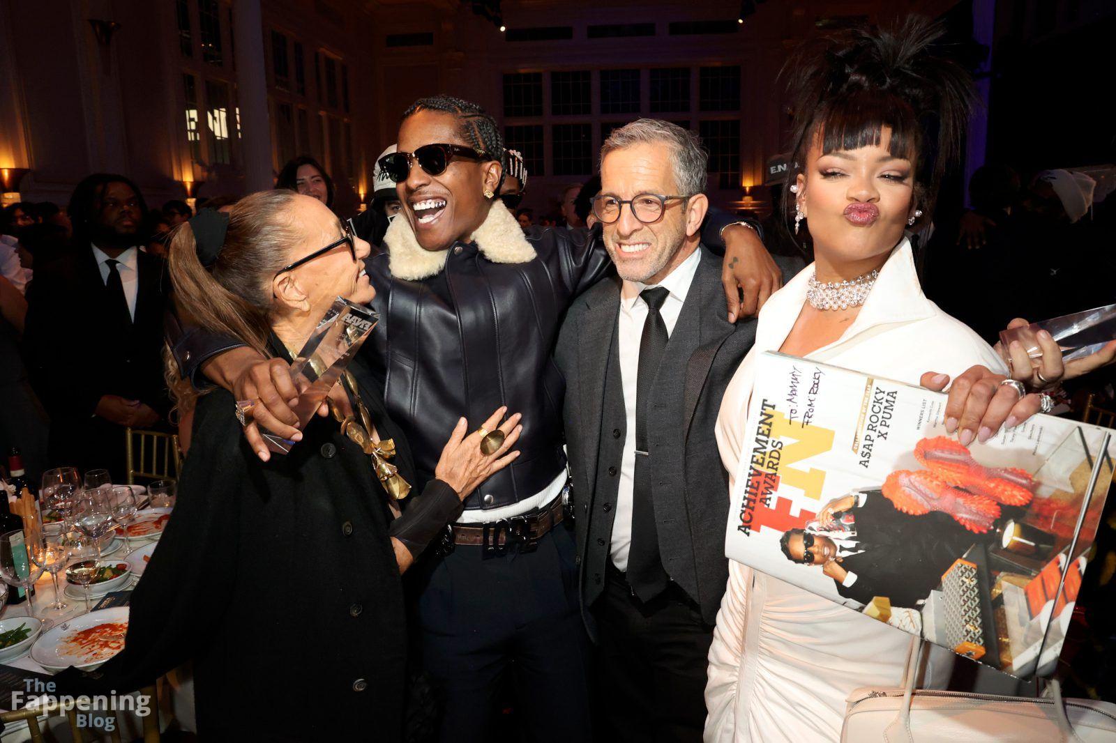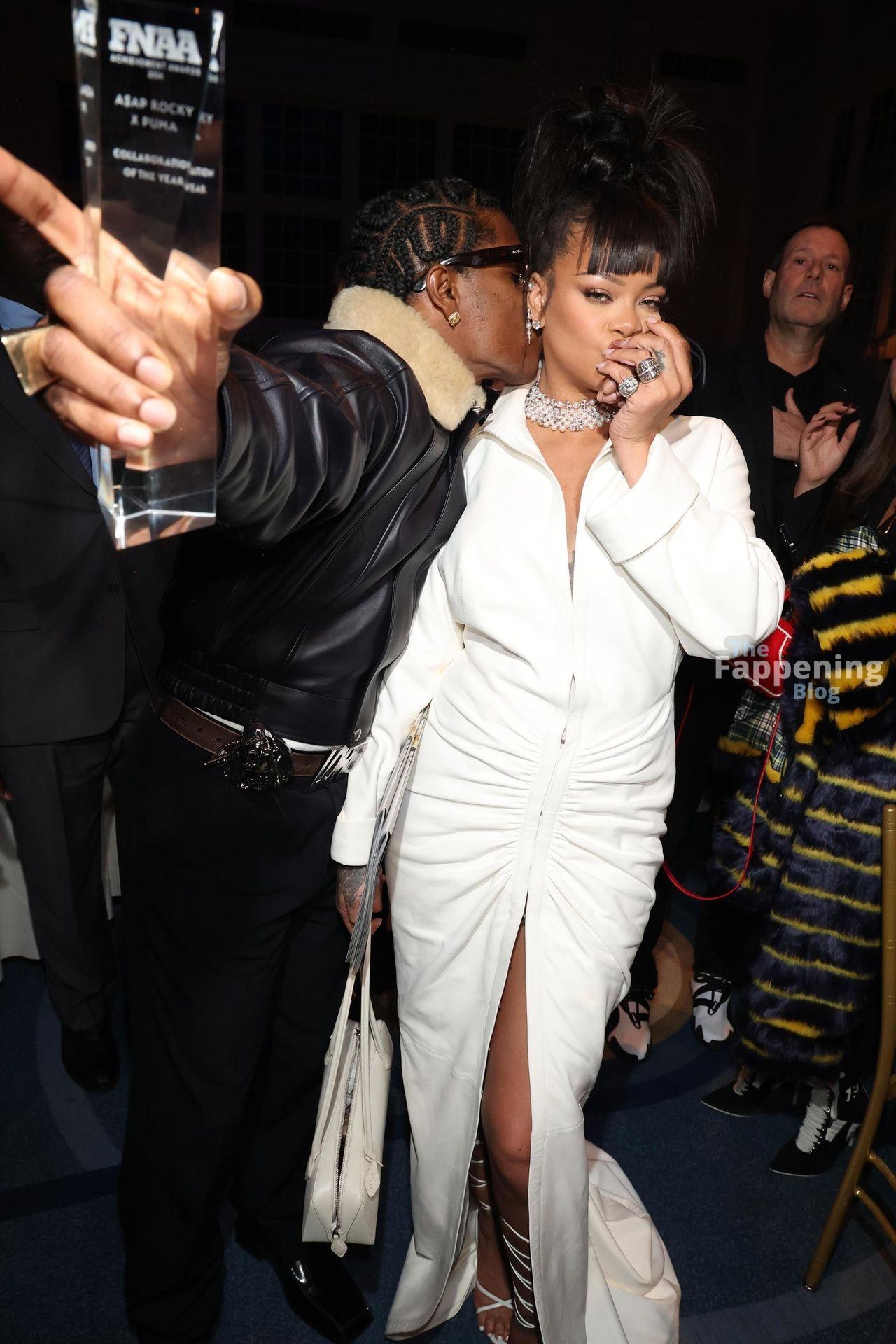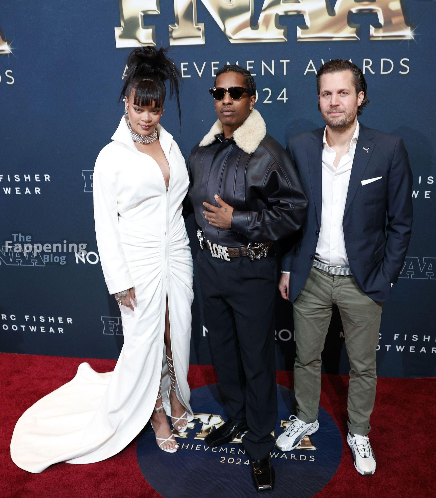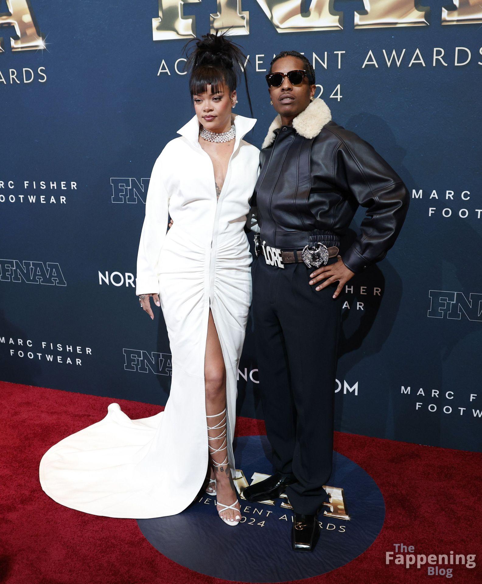 Rihanna stuns in a white dress at the 38th Annual Footwear News Achievement Awards at Cipriani South Street in New York City.