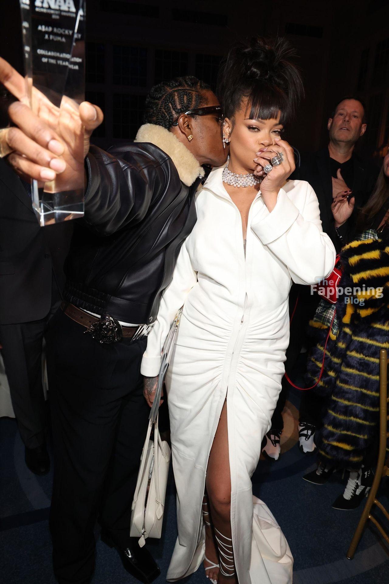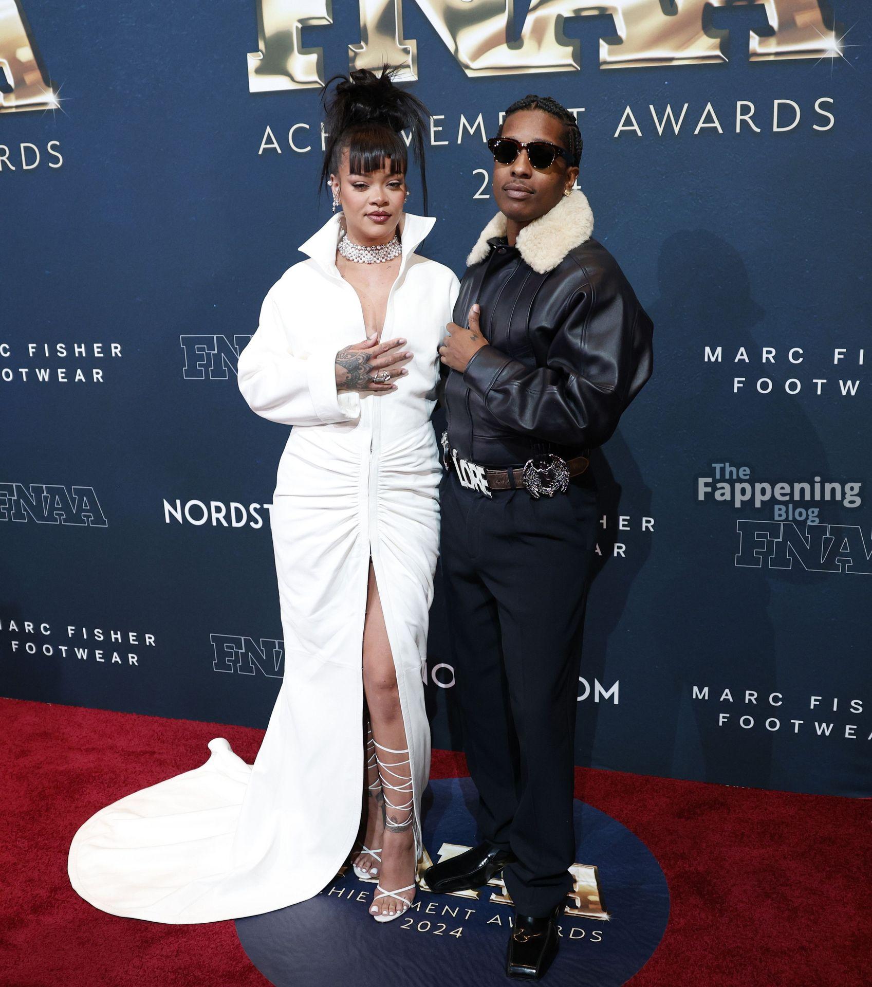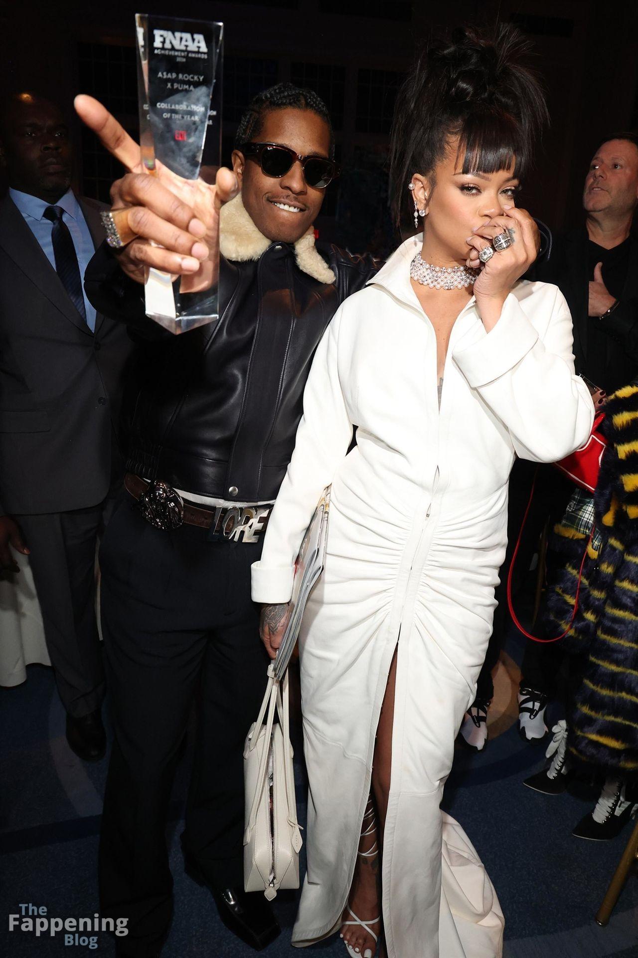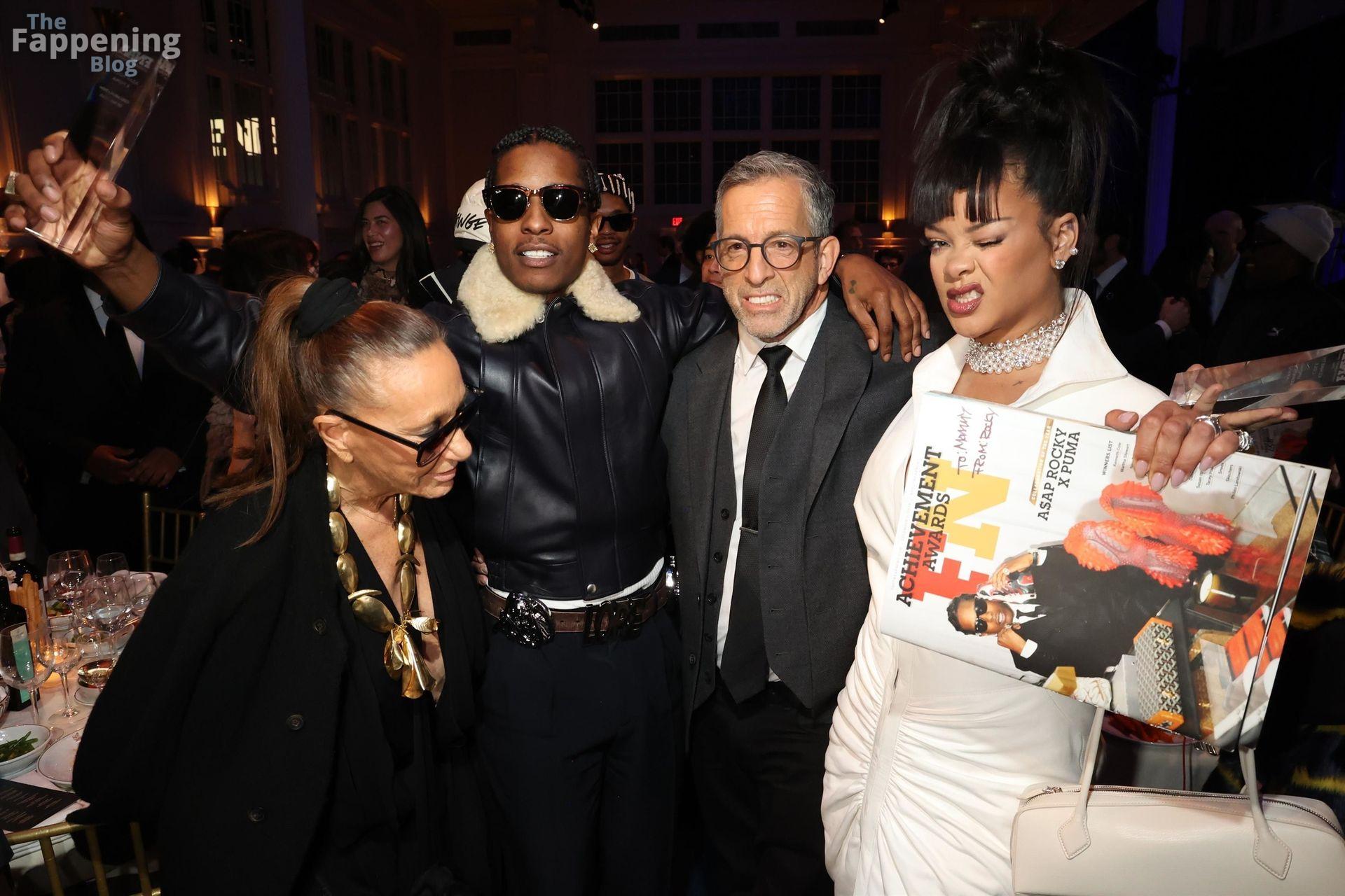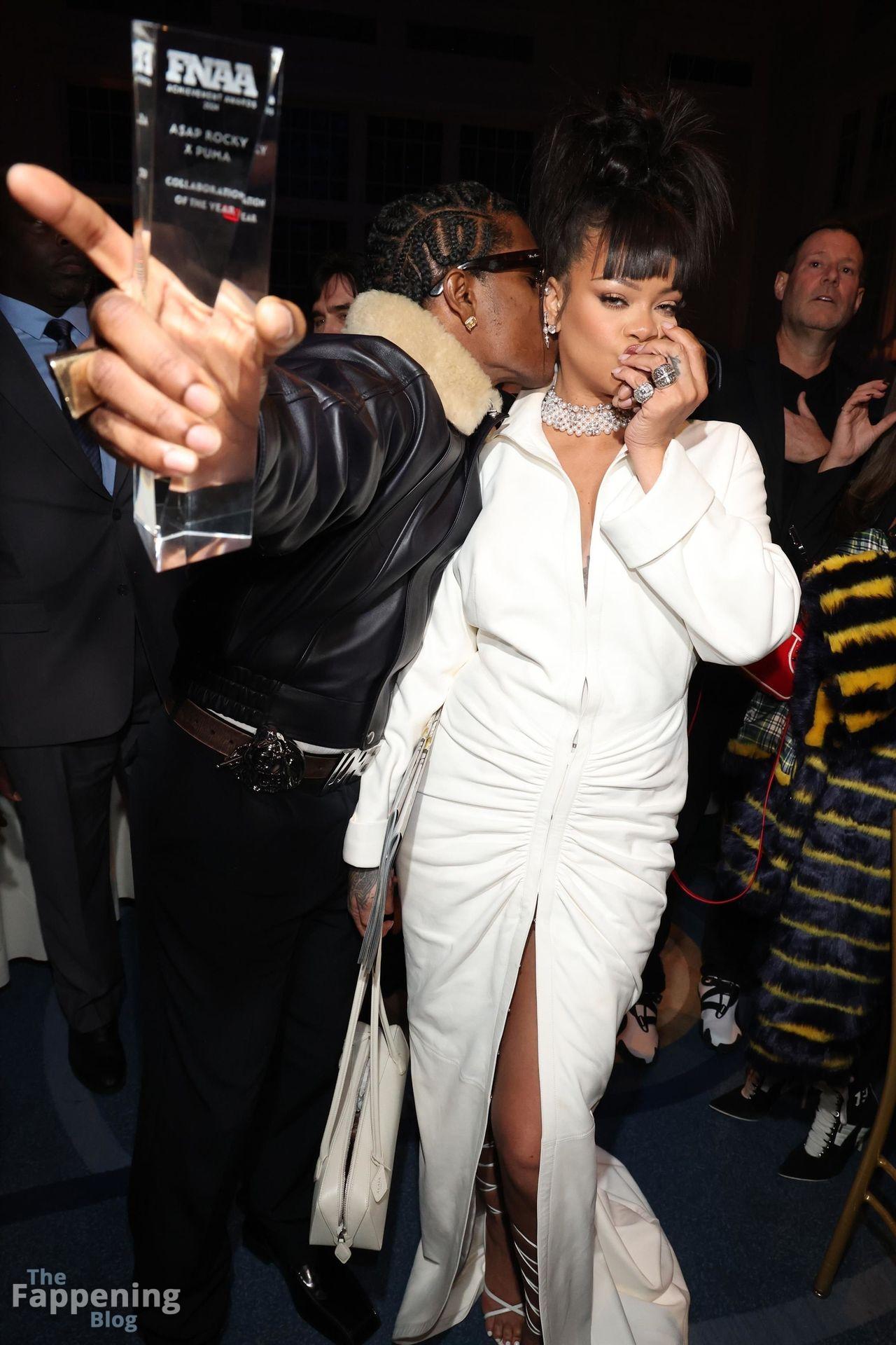 Rihanna stuns in a white dress at the 38th Annual Footwear News Achievement Awards at Cipriani South Street in New York City.