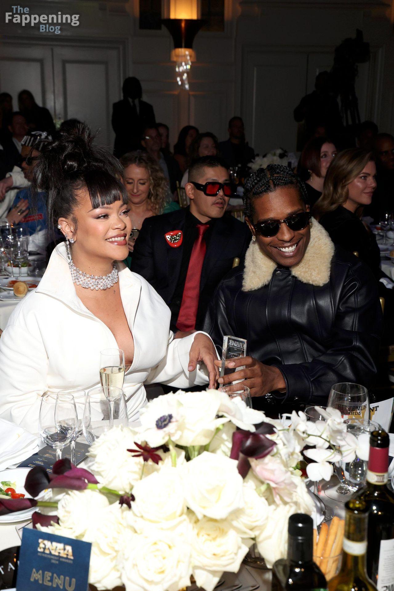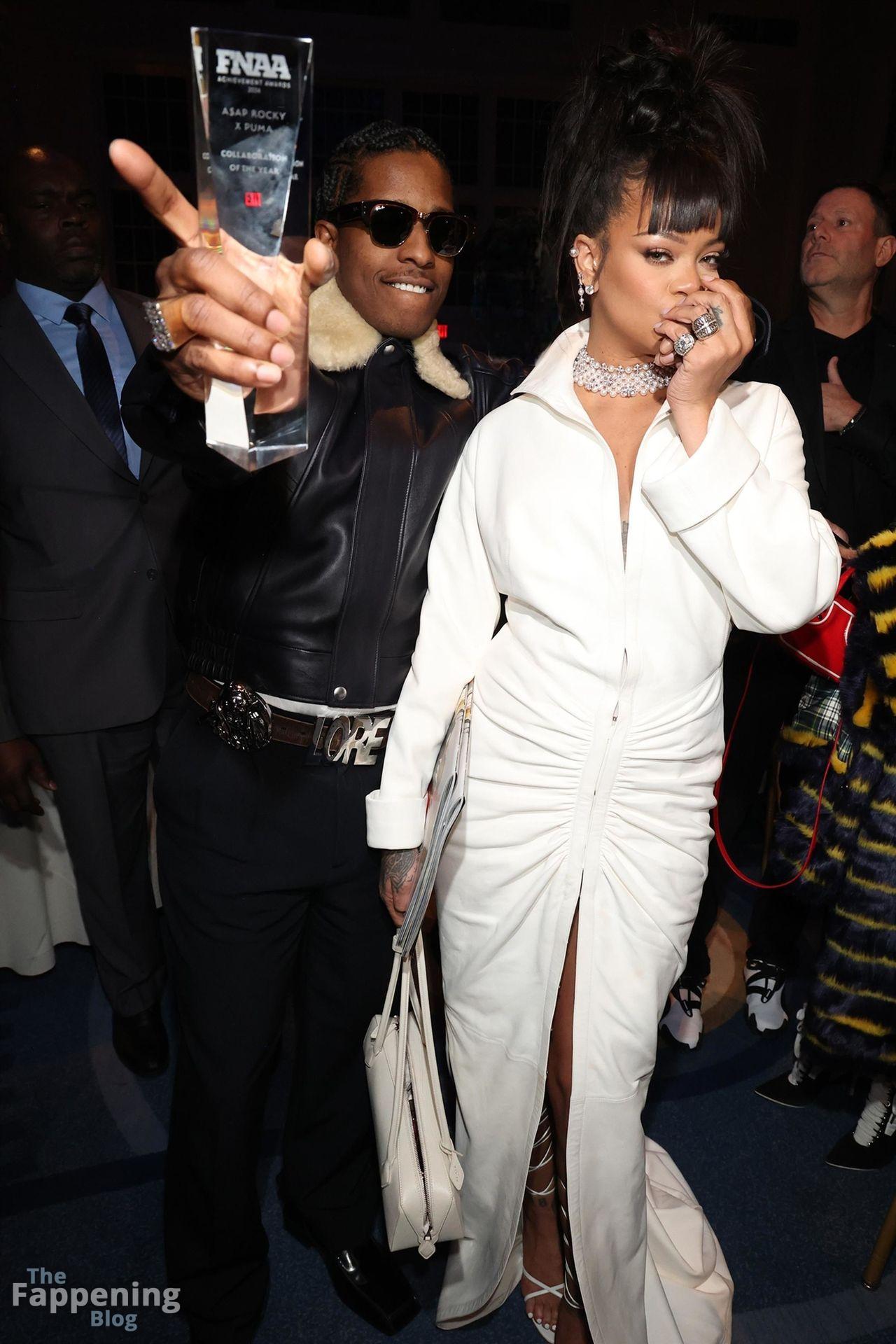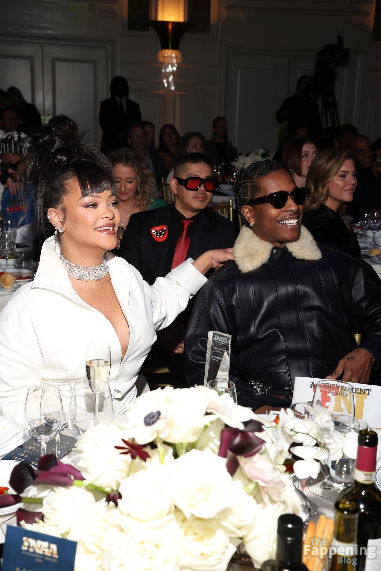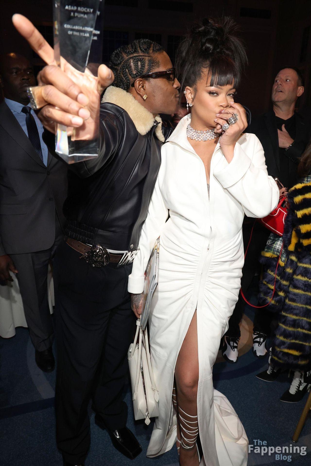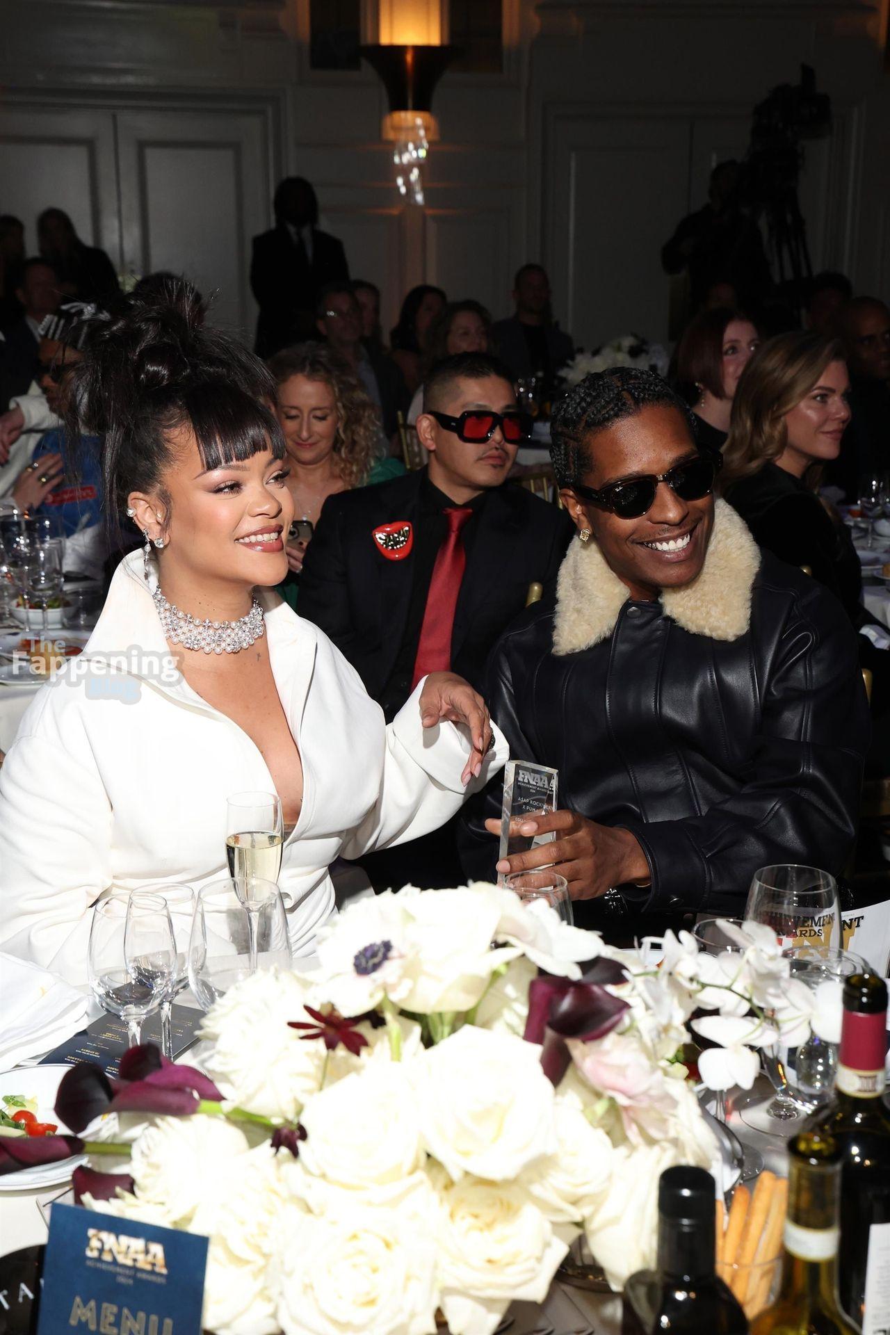 Rihanna stuns in a white dress at the 38th Annual Footwear News Achievement Awards at Cipriani South Street in New York City.