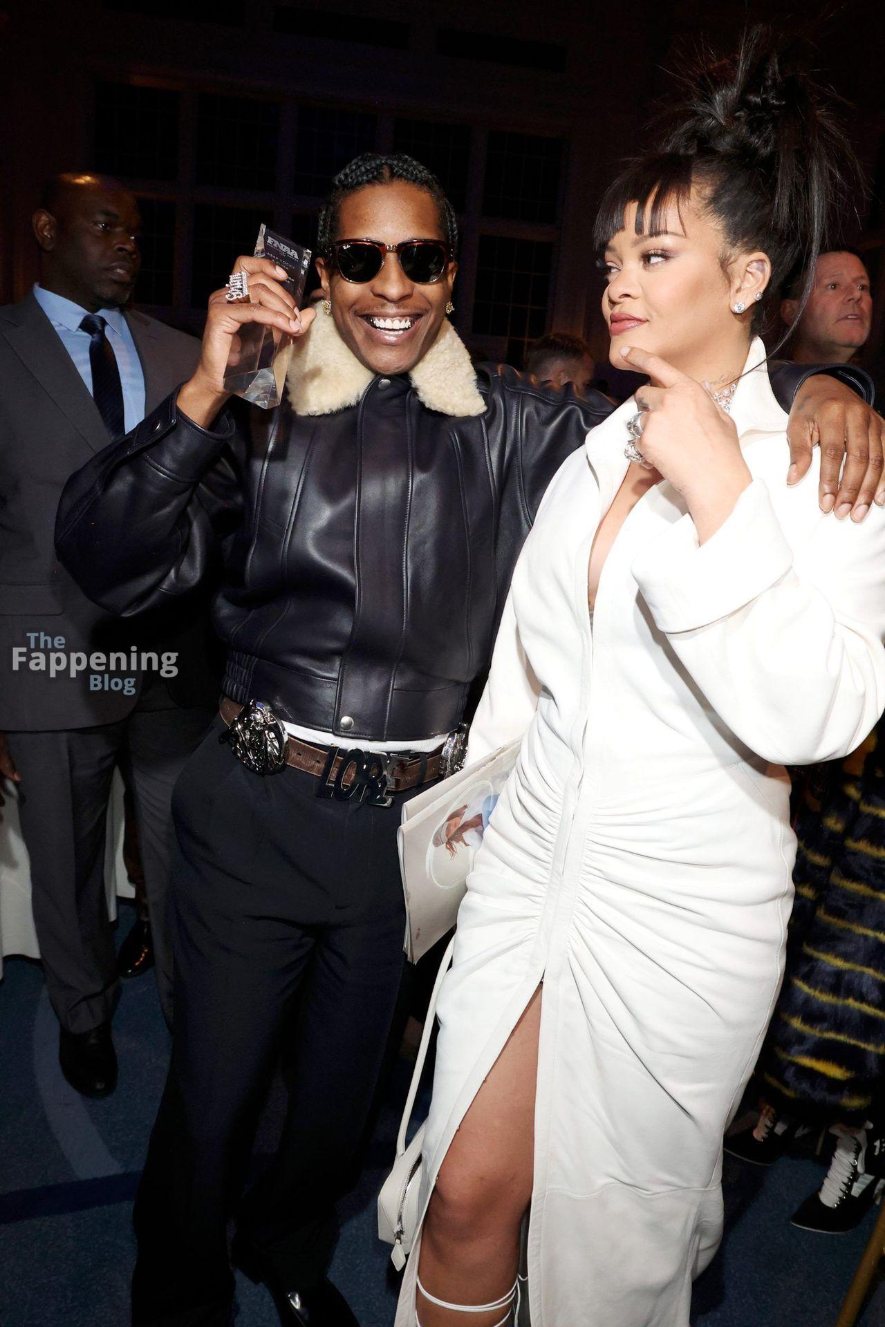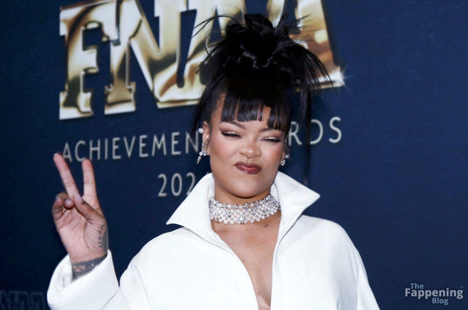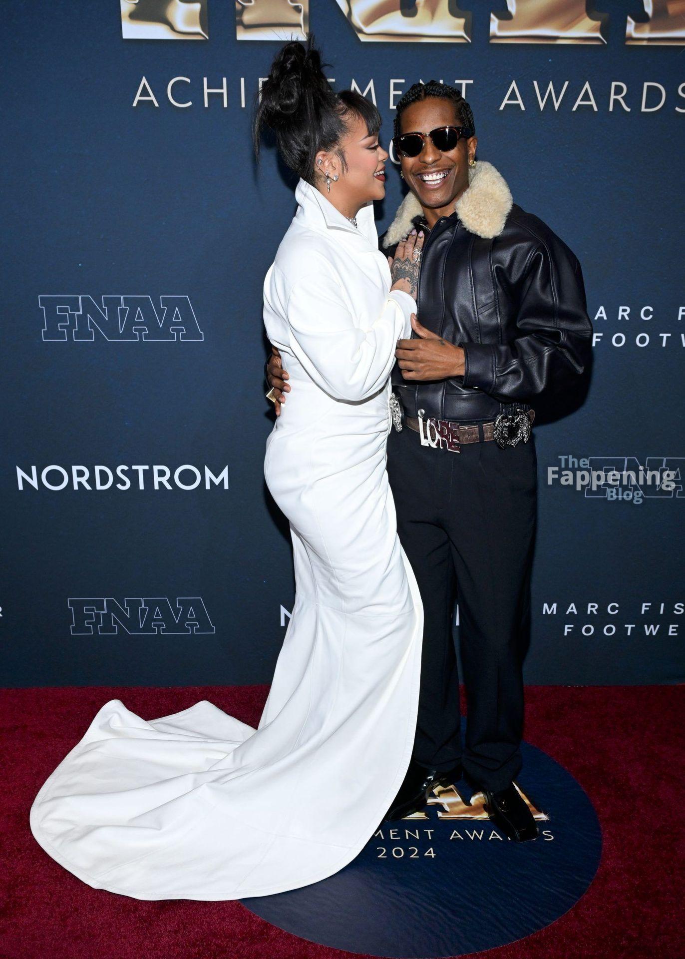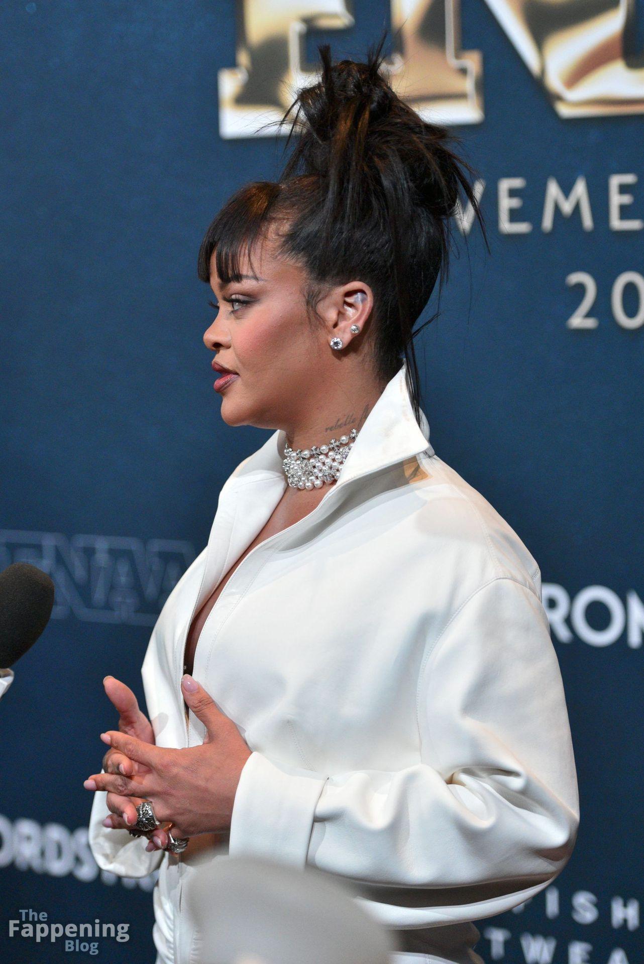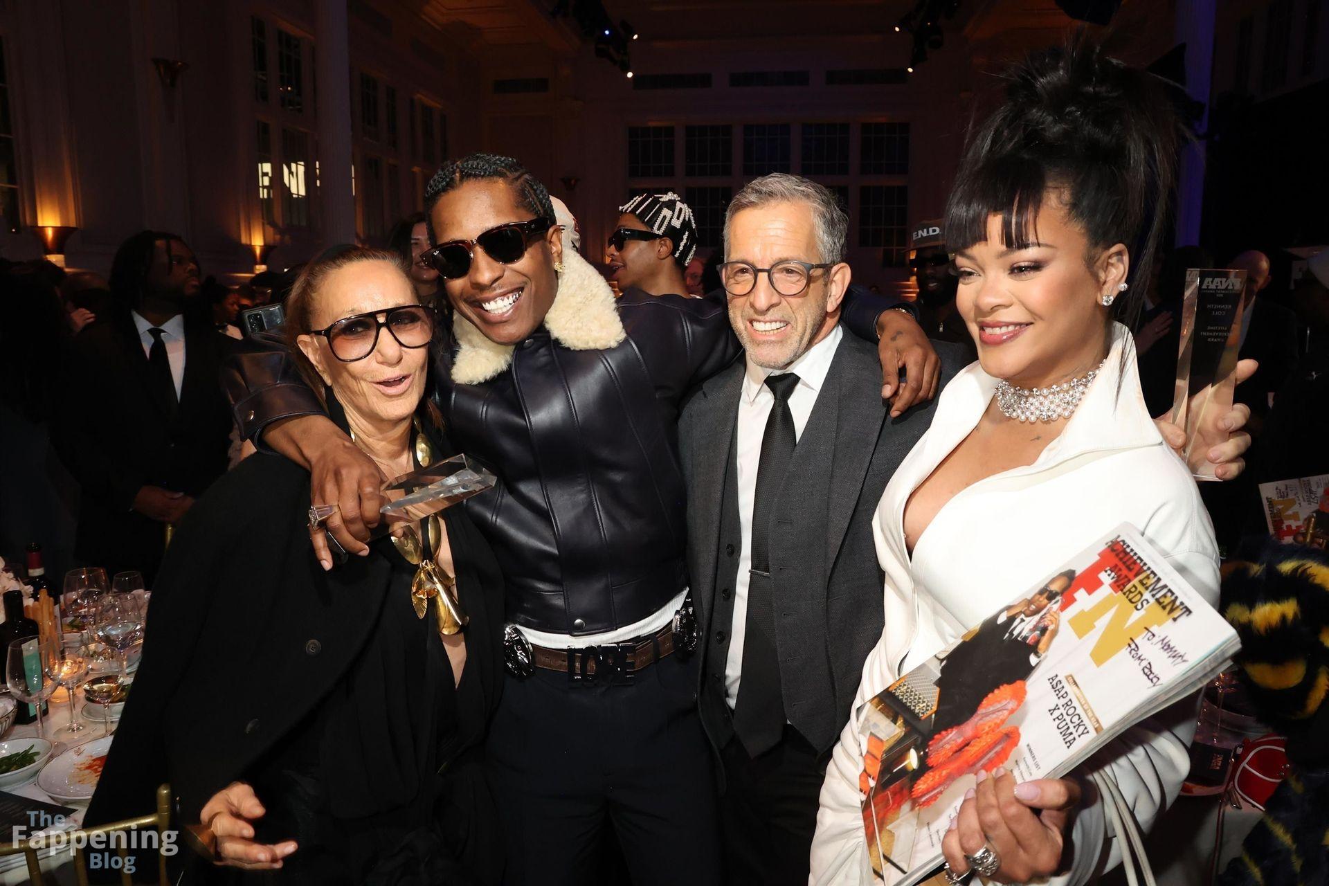 Rihanna stuns in a white dress at the 38th Annual Footwear News Achievement Awards at Cipriani South Street in New York City.