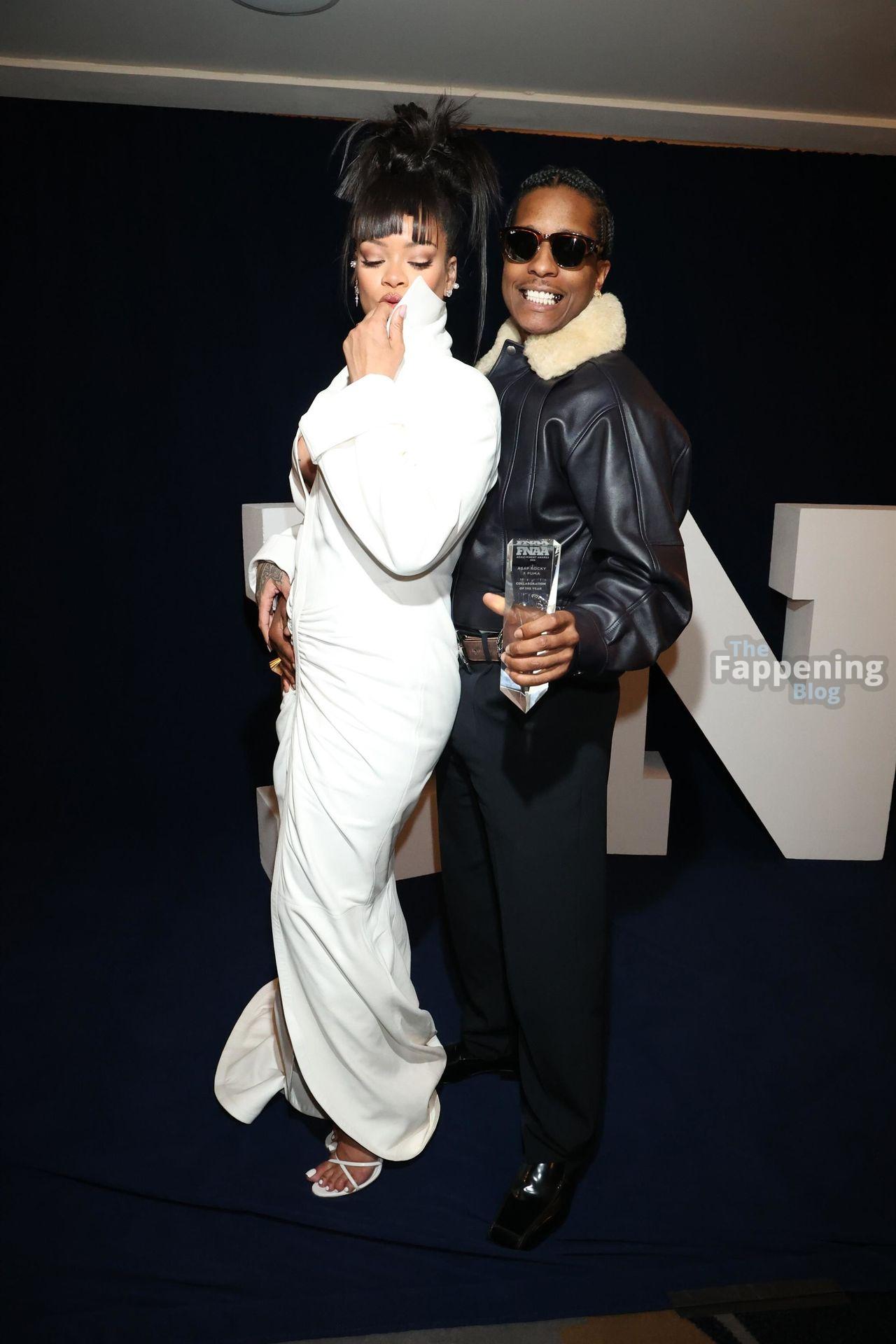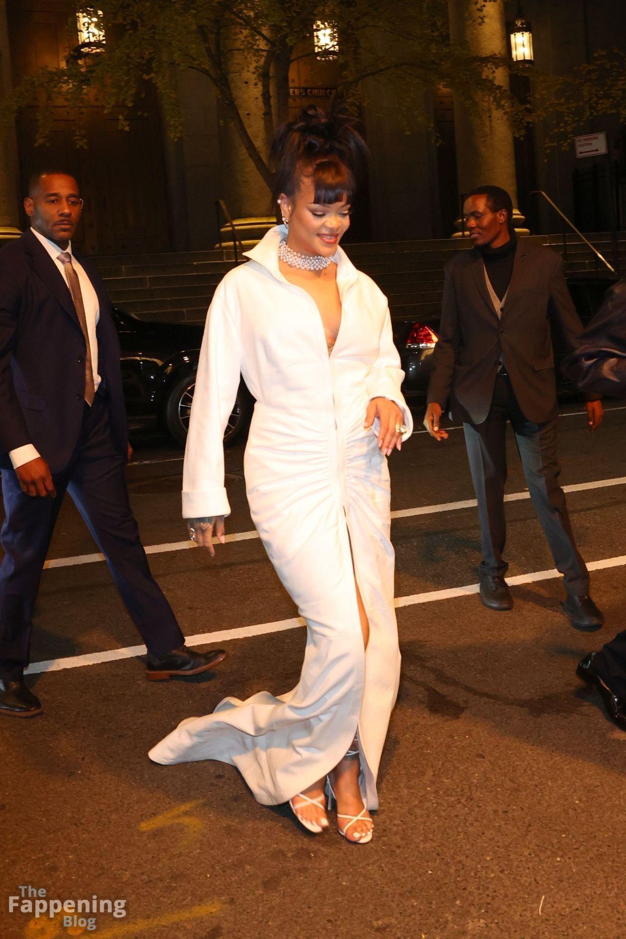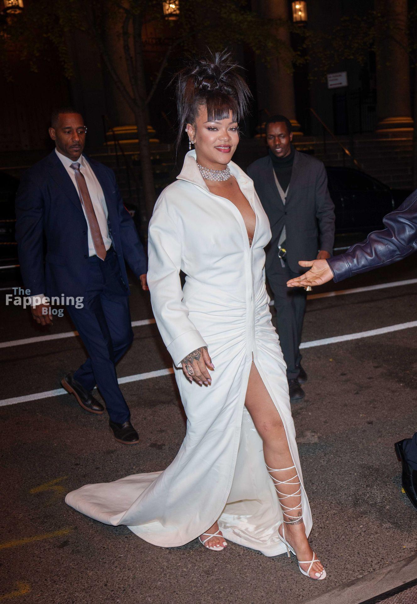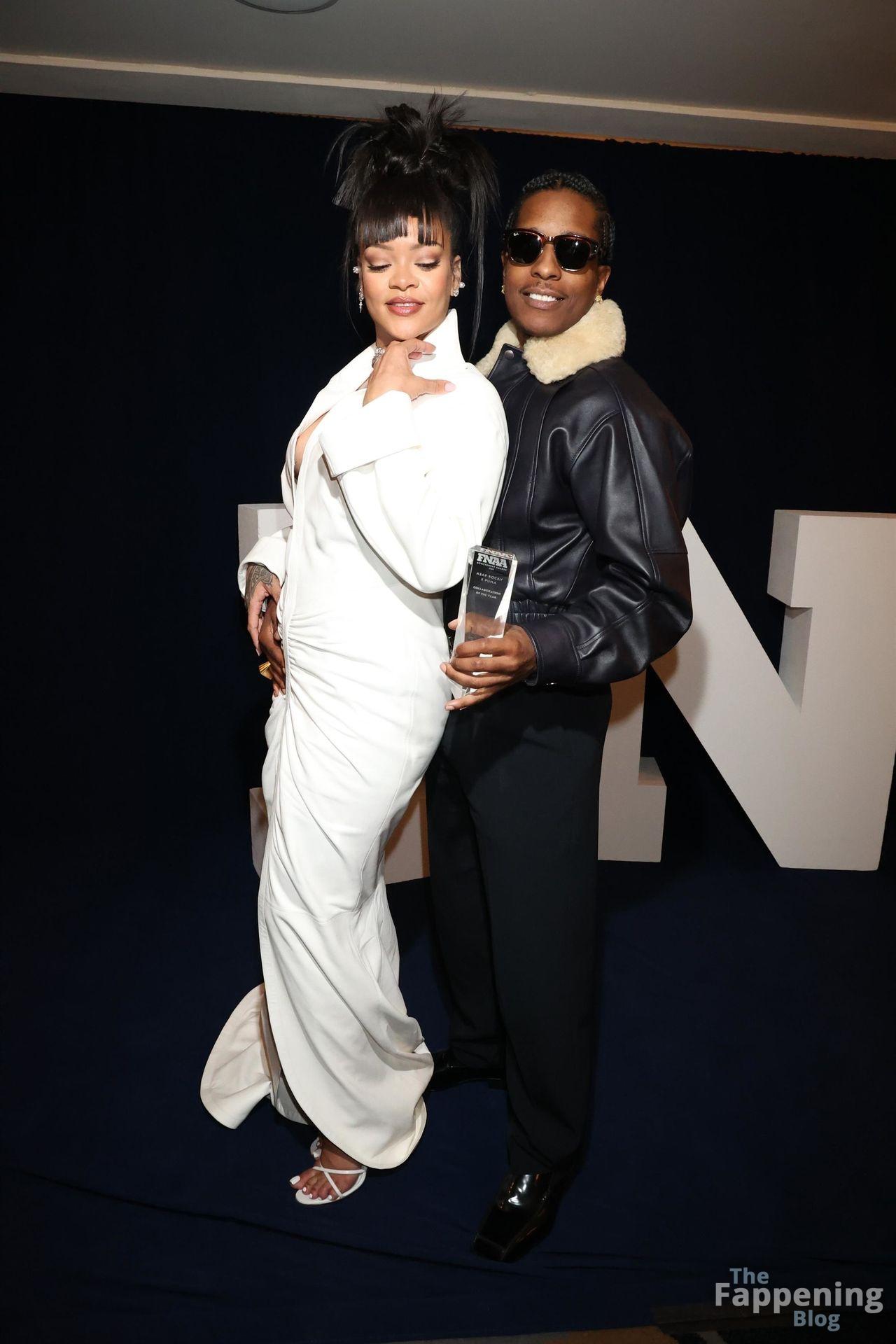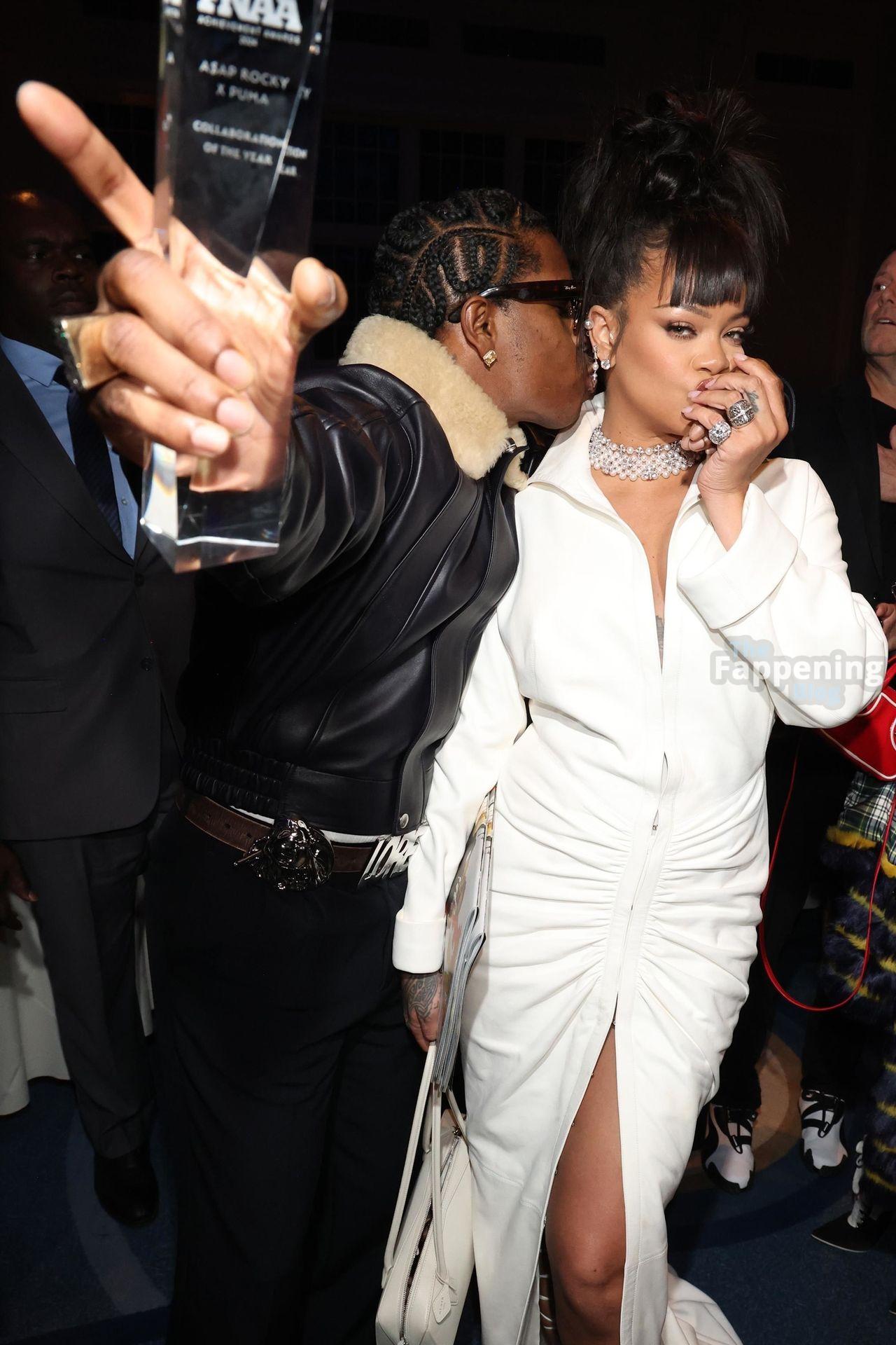 Rihanna stuns in a white dress at the 38th Annual Footwear News Achievement Awards at Cipriani South Street in New York City.