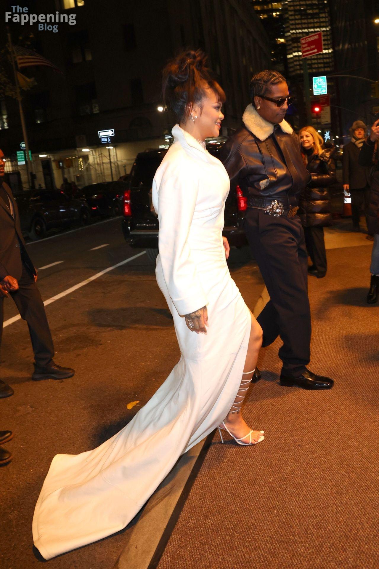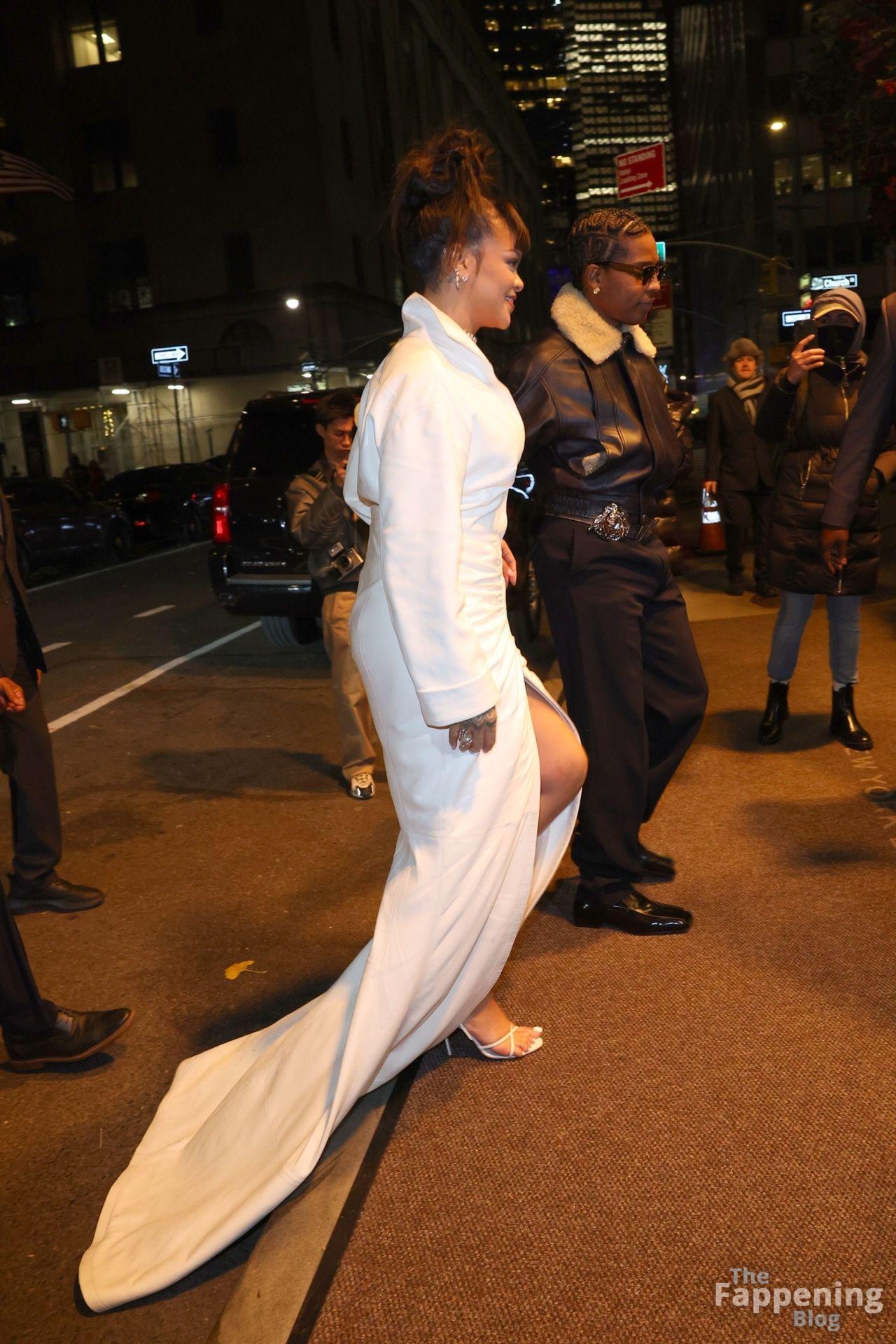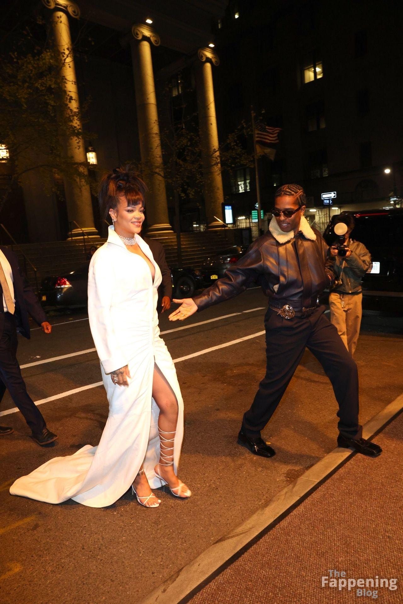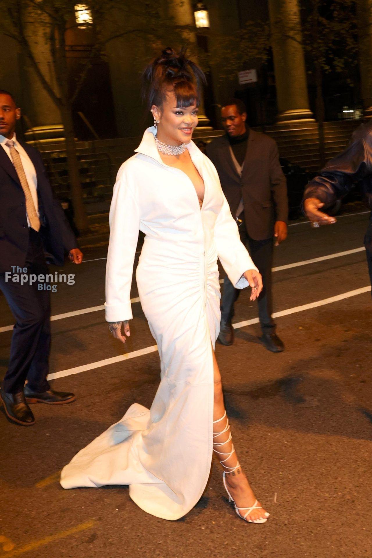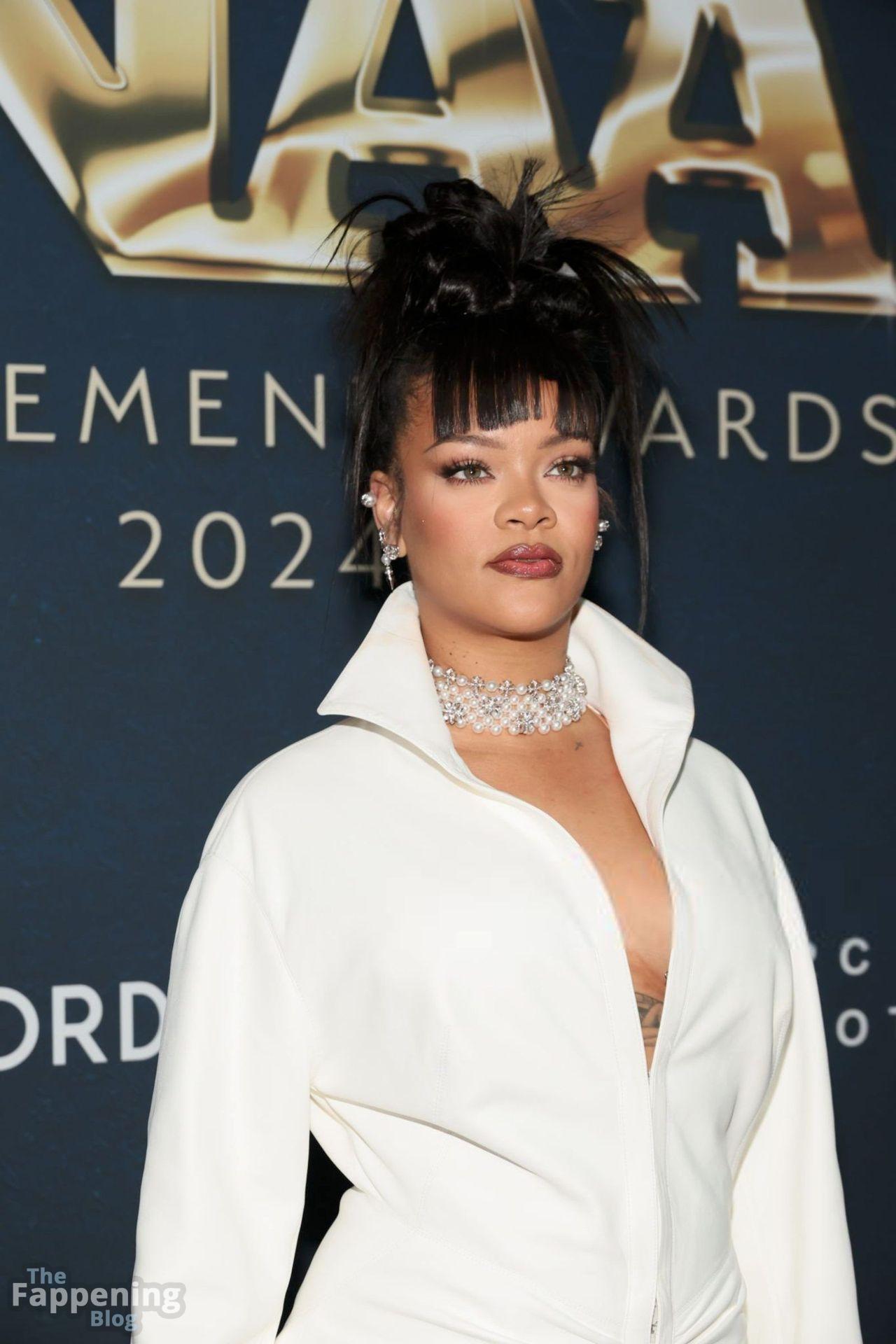 Rihanna stuns in a white dress at the 38th Annual Footwear News Achievement Awards at Cipriani South Street in New York City.