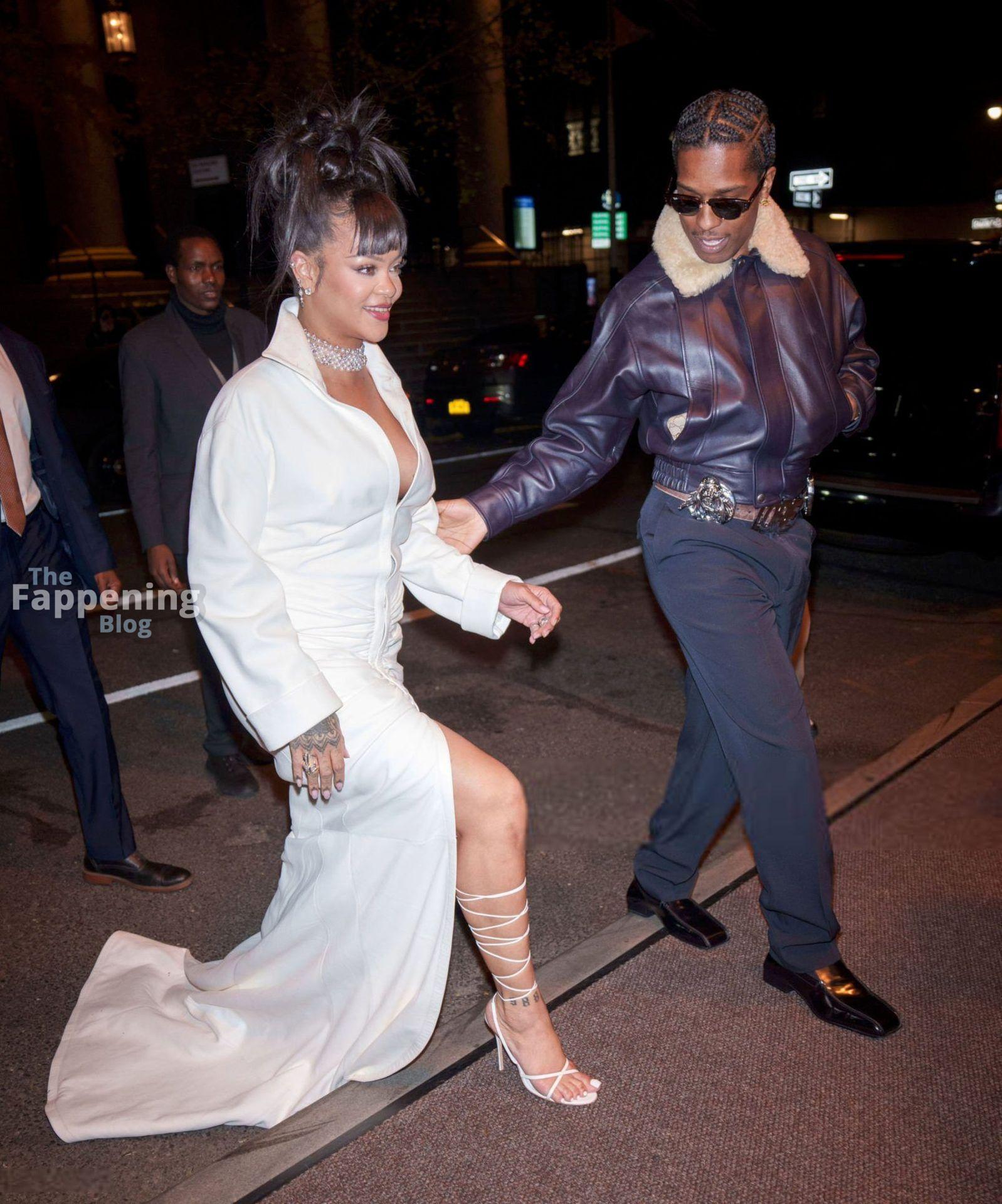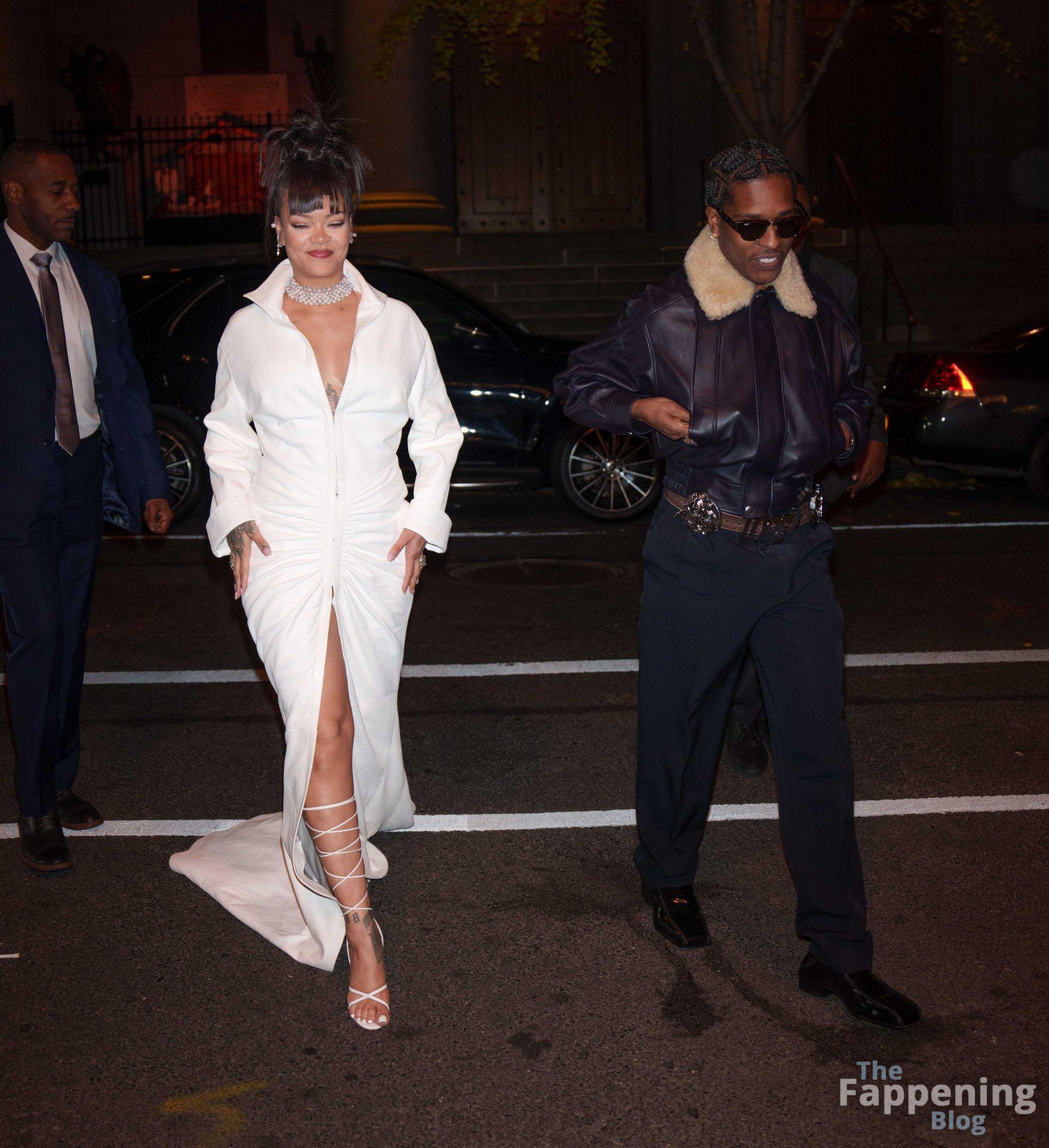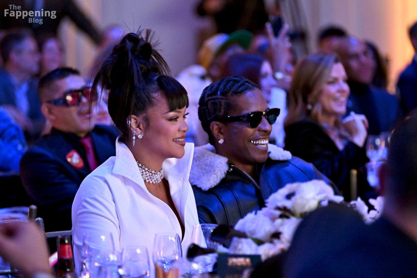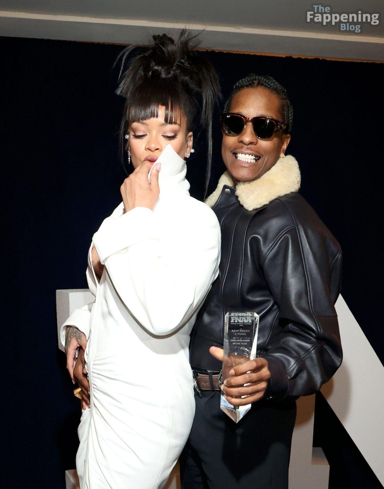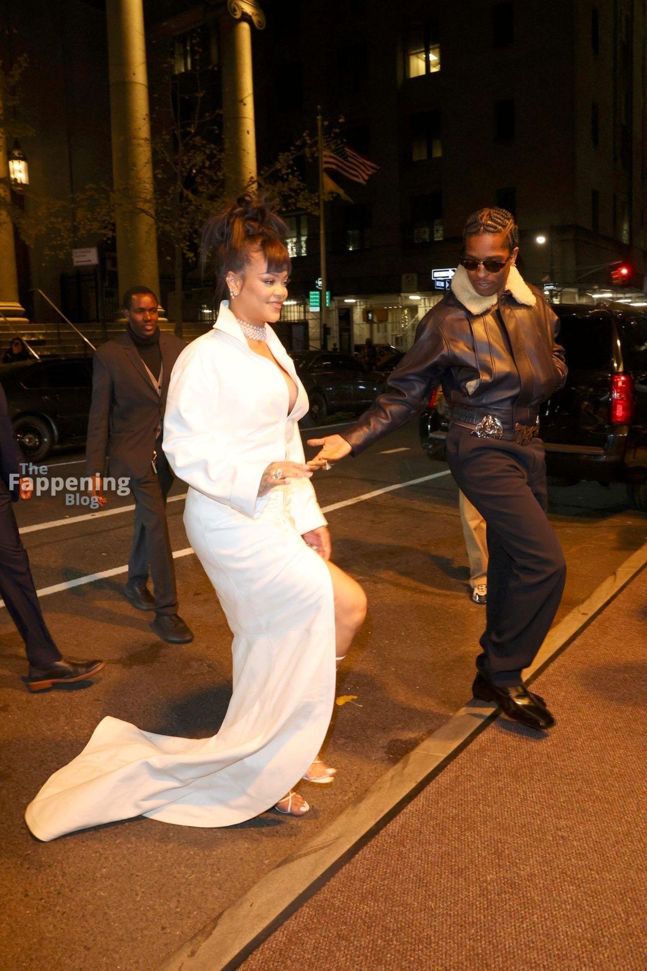 Rihanna stuns in a white dress at the 38th Annual Footwear News Achievement Awards at Cipriani South Street in New York City.