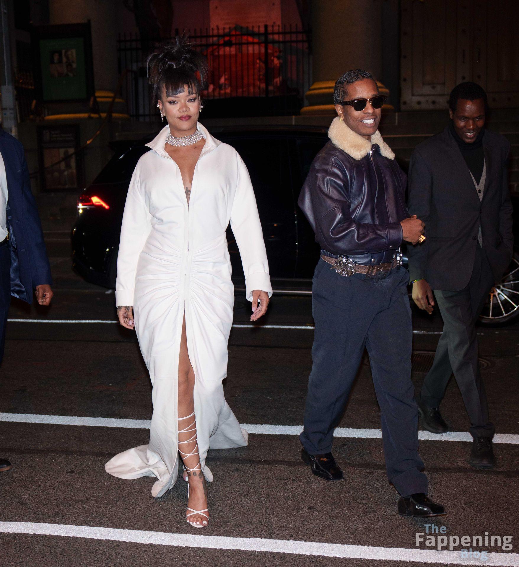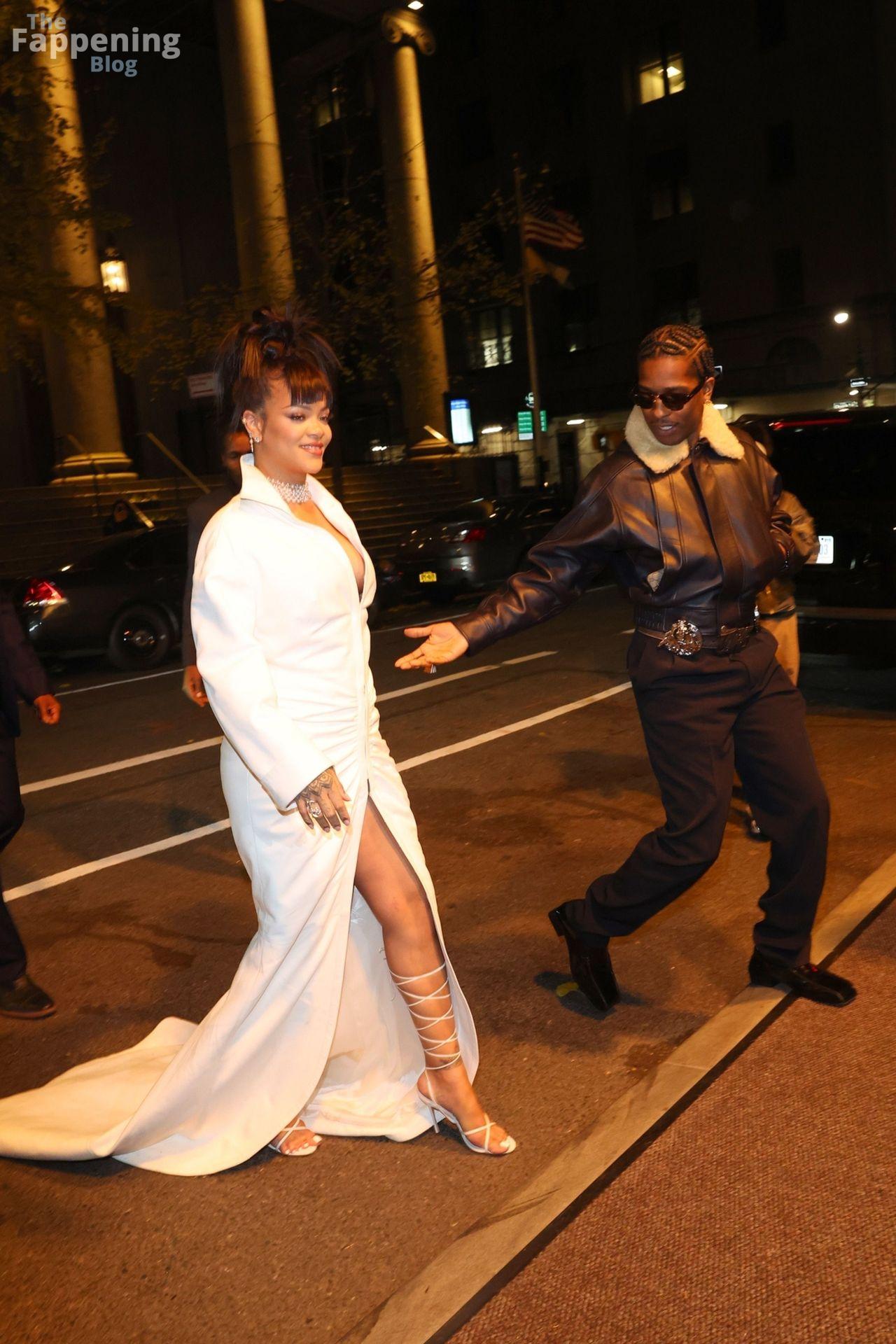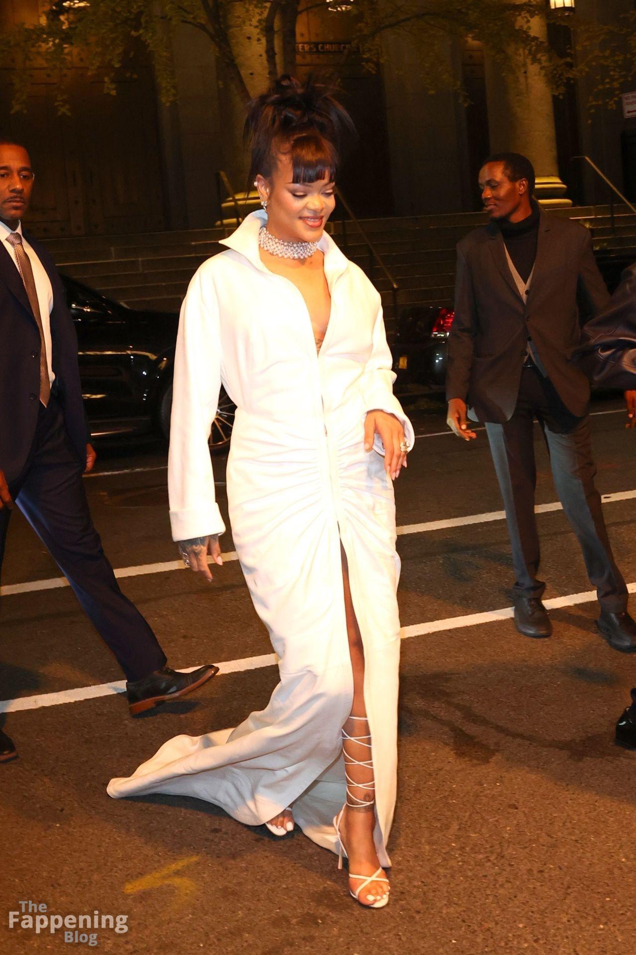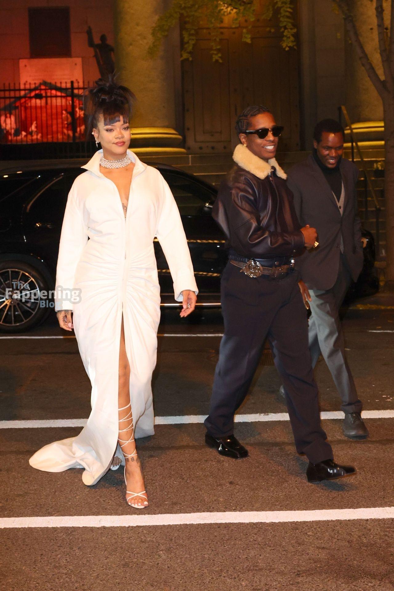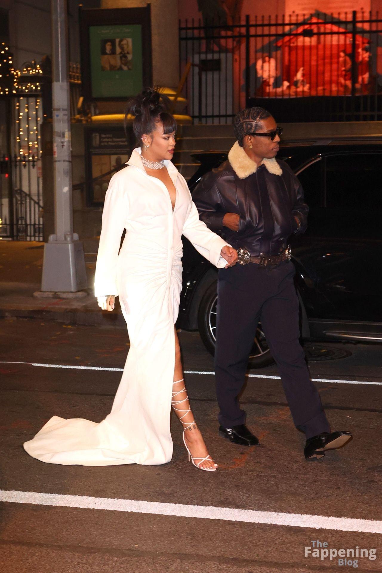 Rihanna stuns in a white dress at the 38th Annual Footwear News Achievement Awards at Cipriani South Street in New York City.