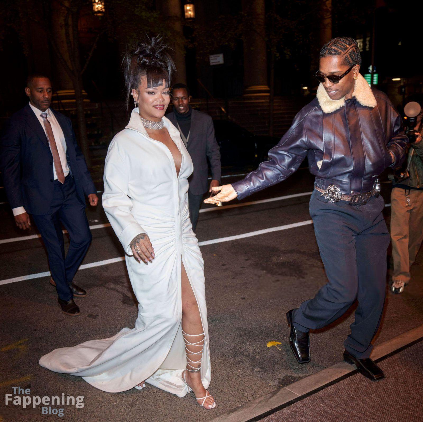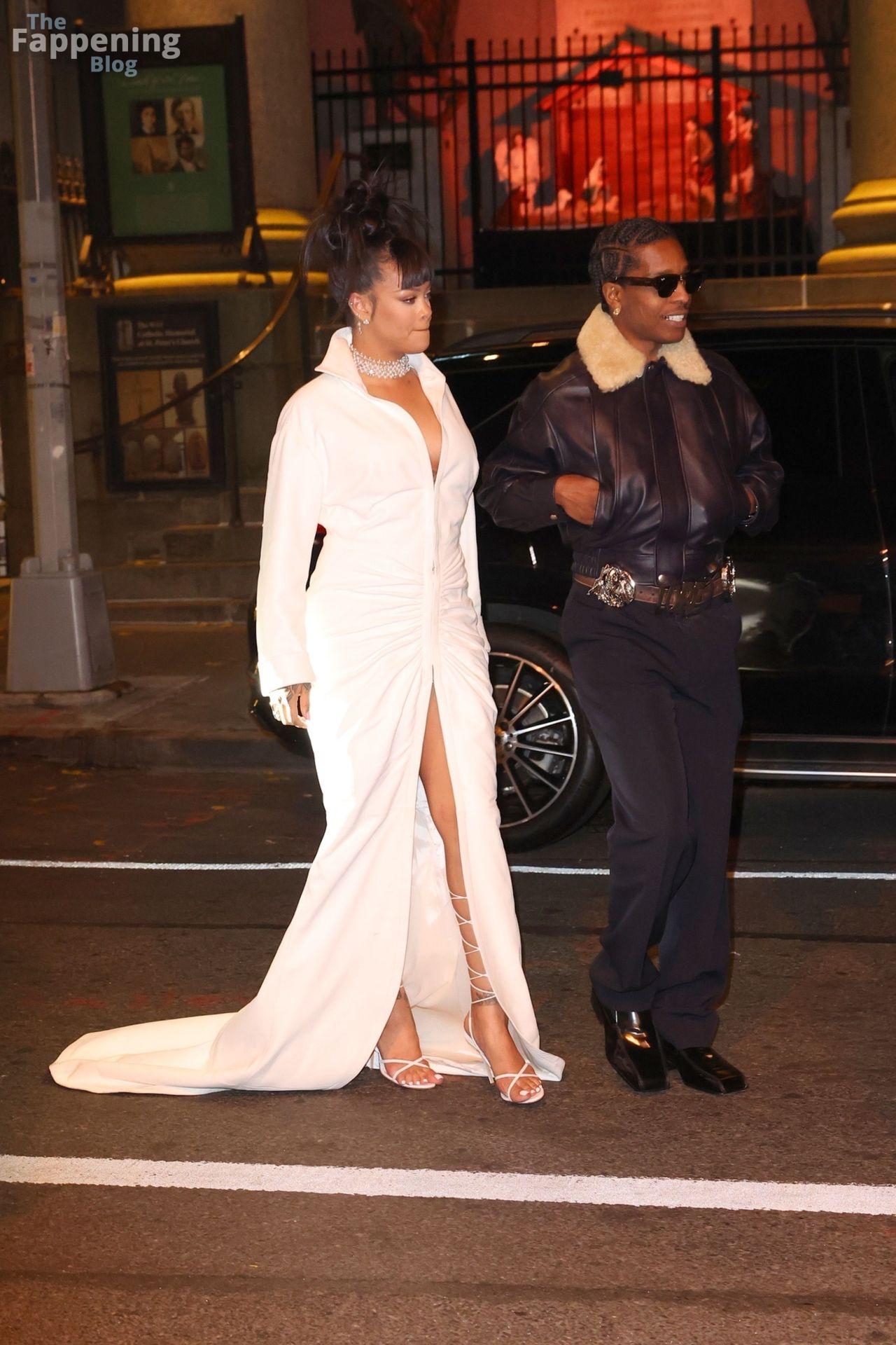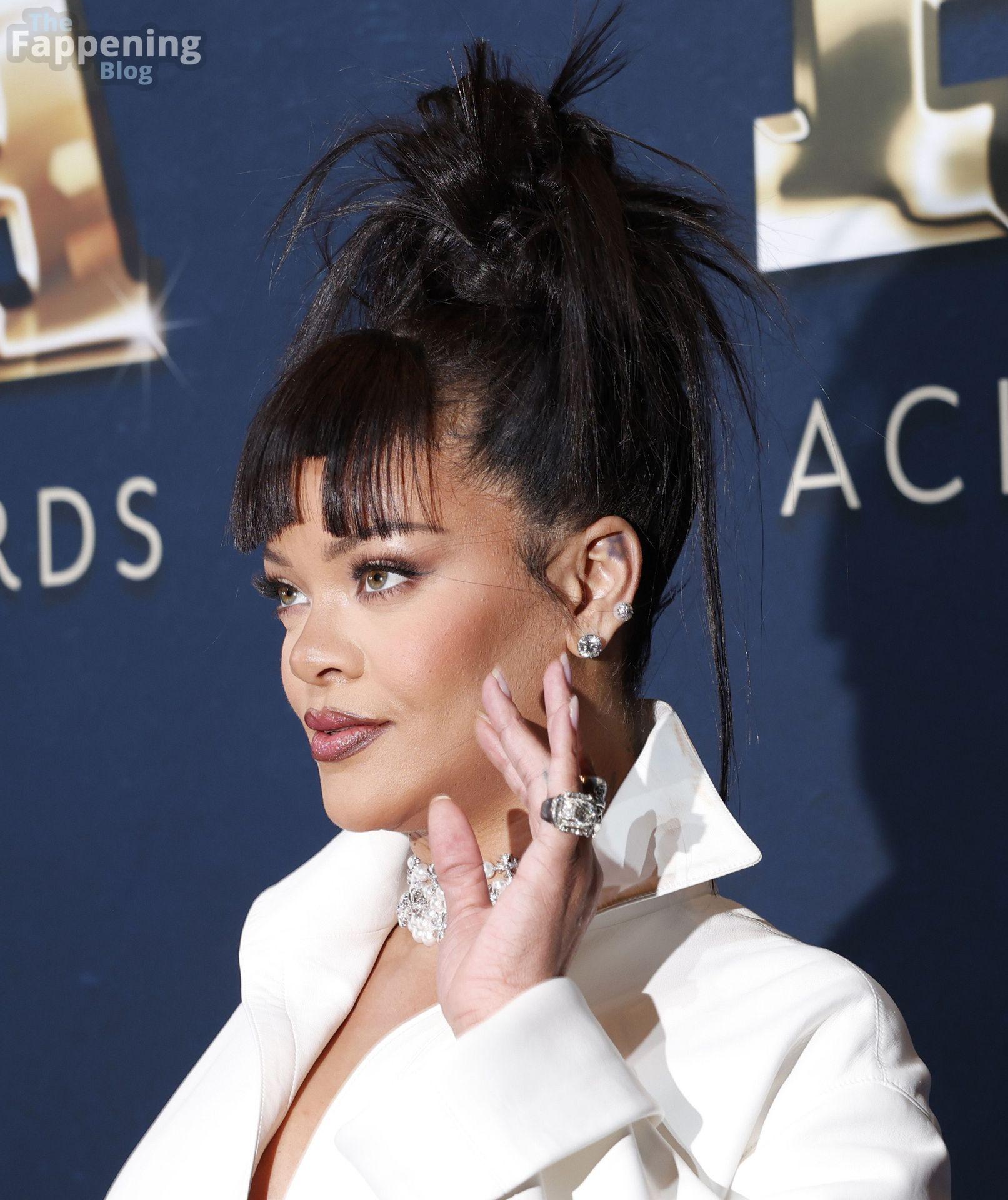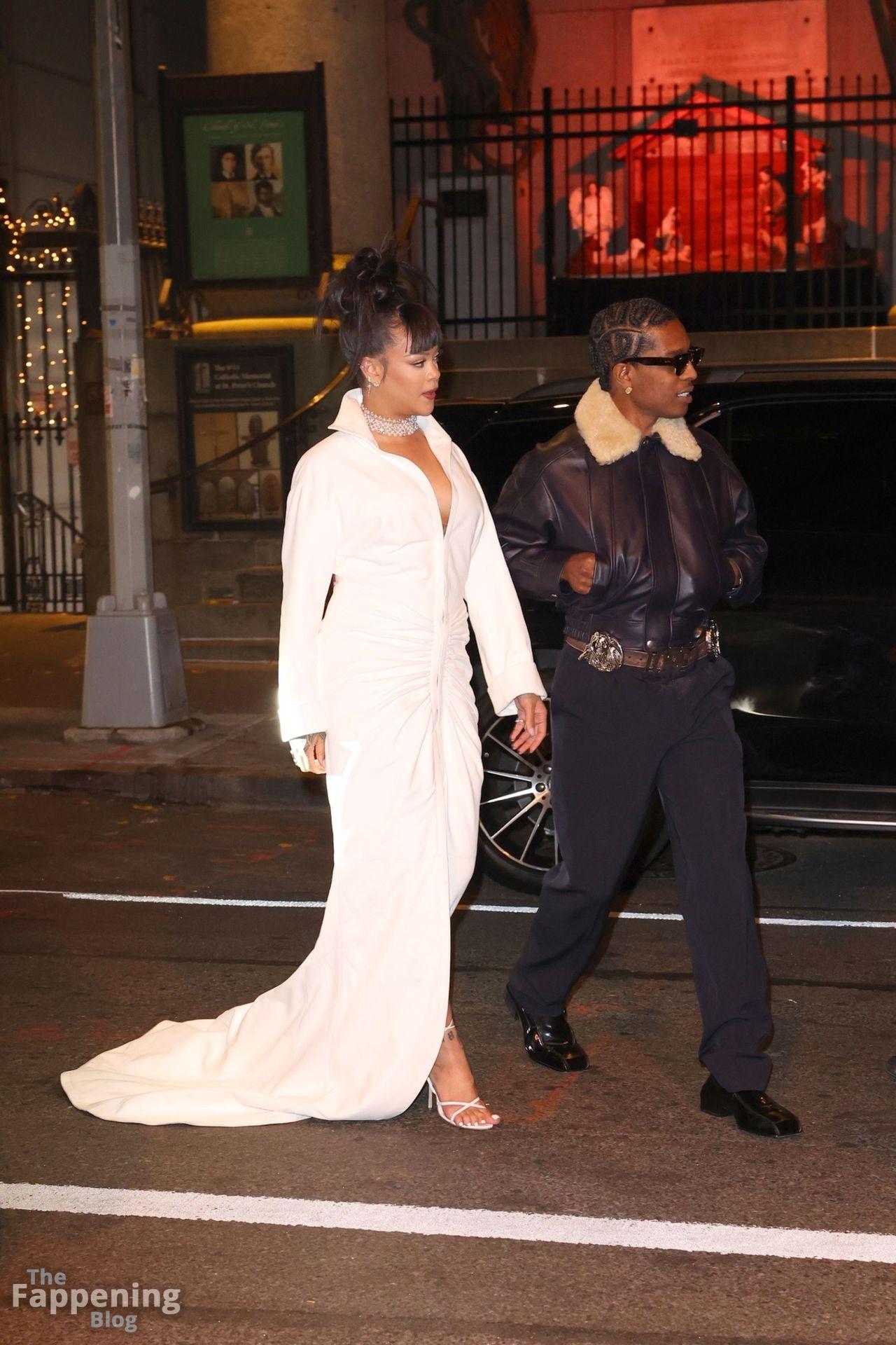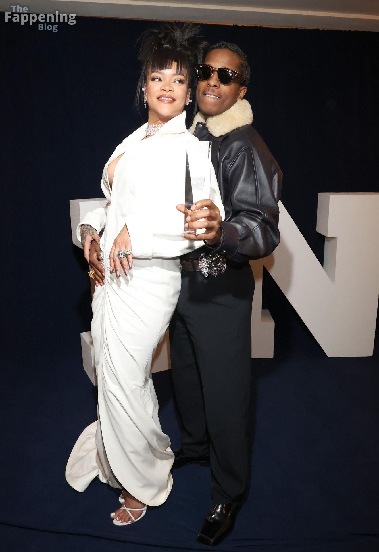 Rihanna stuns in a white dress at the 38th Annual Footwear News Achievement Awards at Cipriani South Street in New York City.
