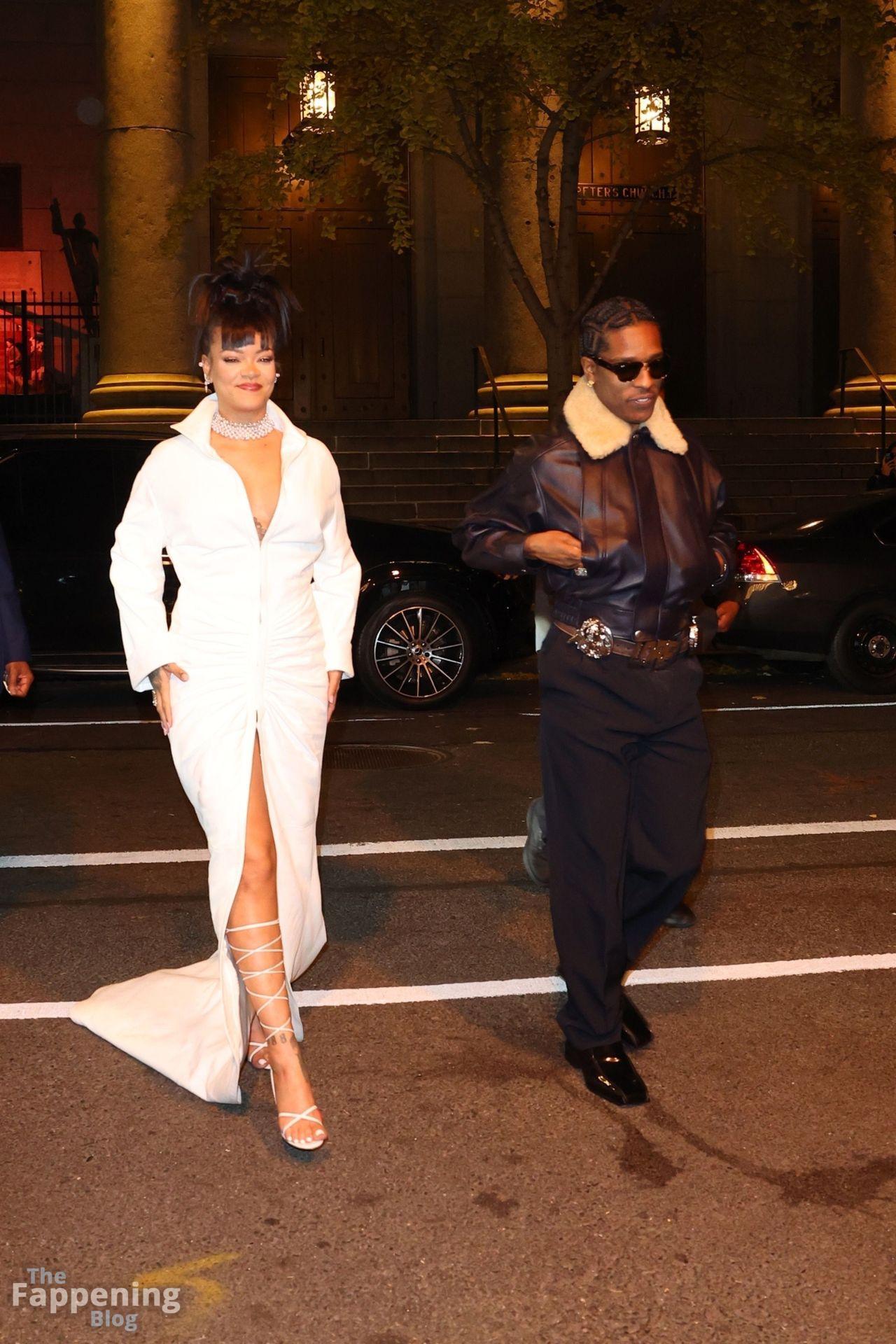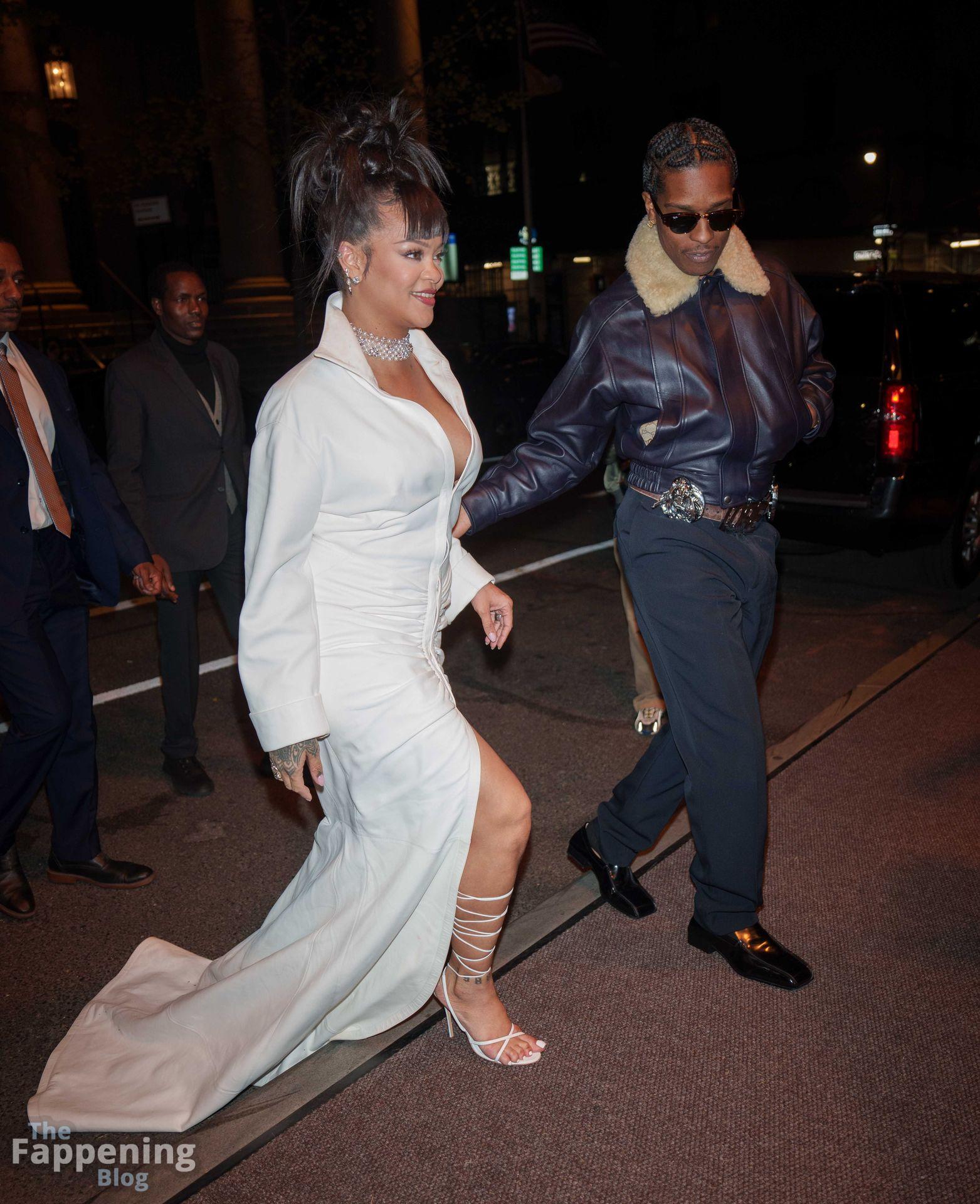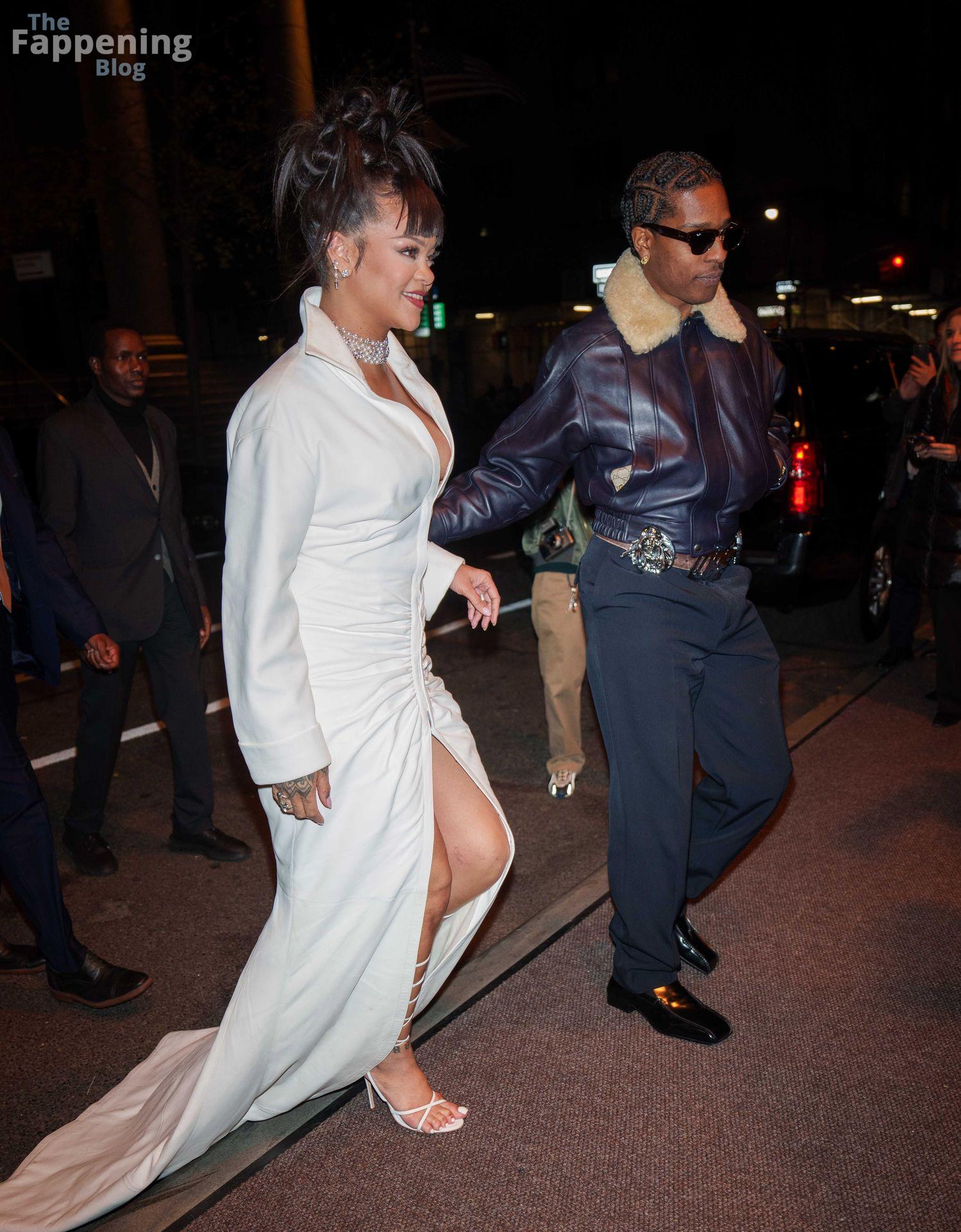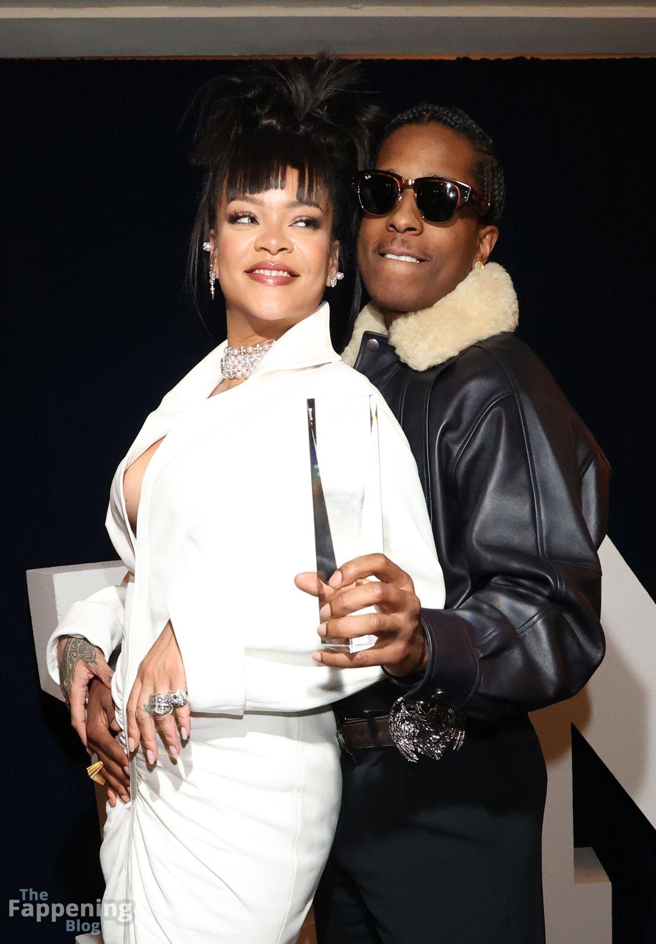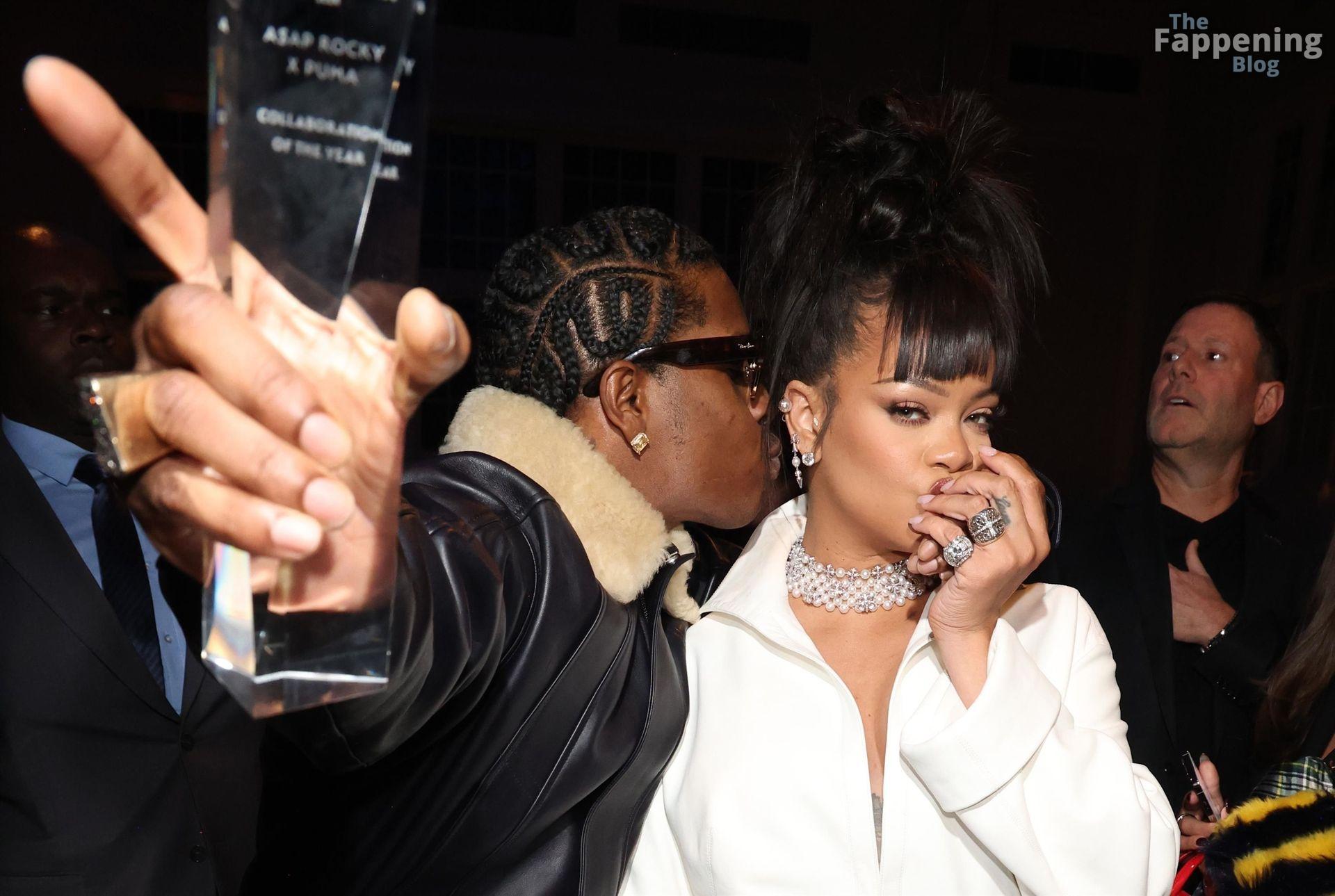 Rihanna stuns in a white dress at the 38th Annual Footwear News Achievement Awards at Cipriani South Street in New York City.