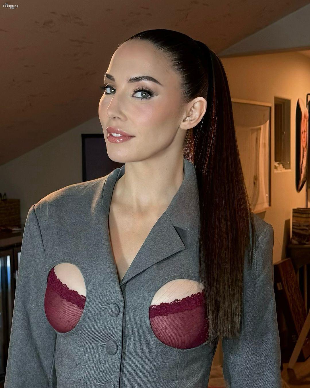 Comedian Whitney Cummings is pictured, rocking a totally see-through bra and a jacket with cutouts that put her tits on full display – nipples and all.