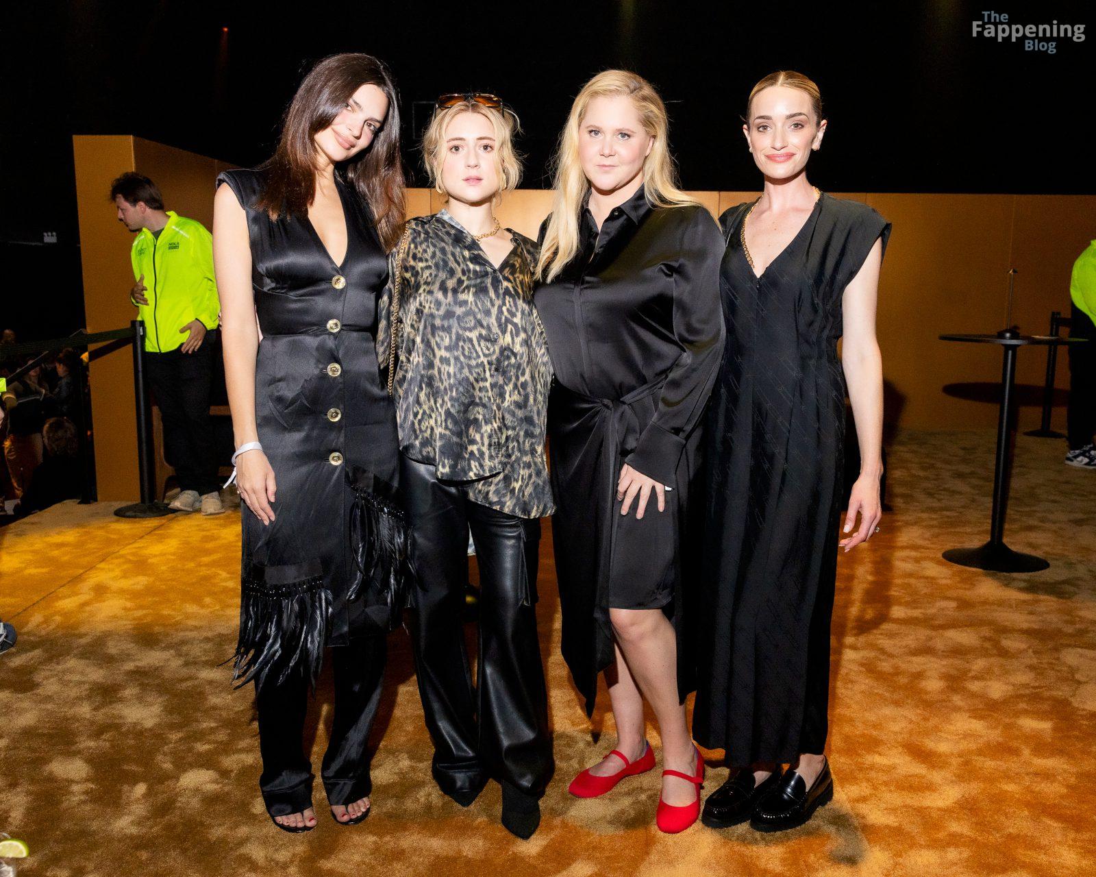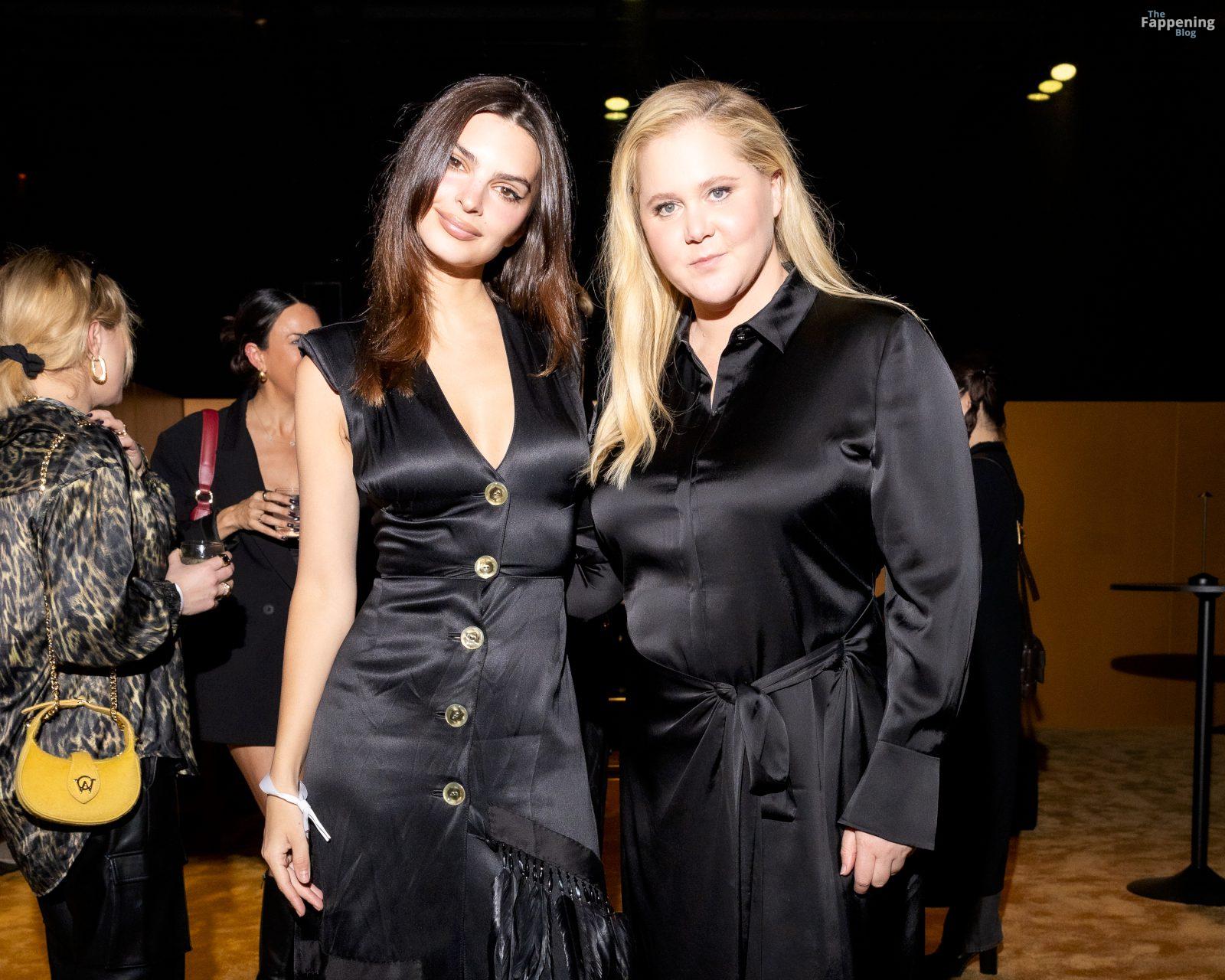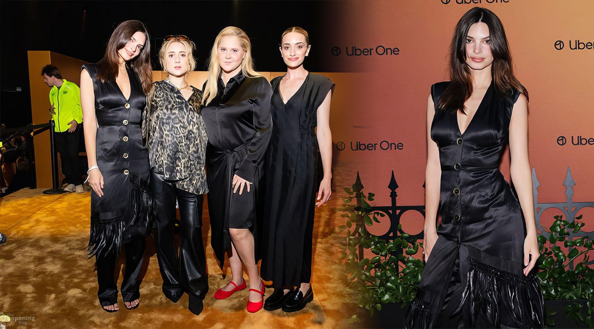 Emily Ratajkowski attends Uber’s The One Party, rocking a sleek black satin dress with a deep neckline.