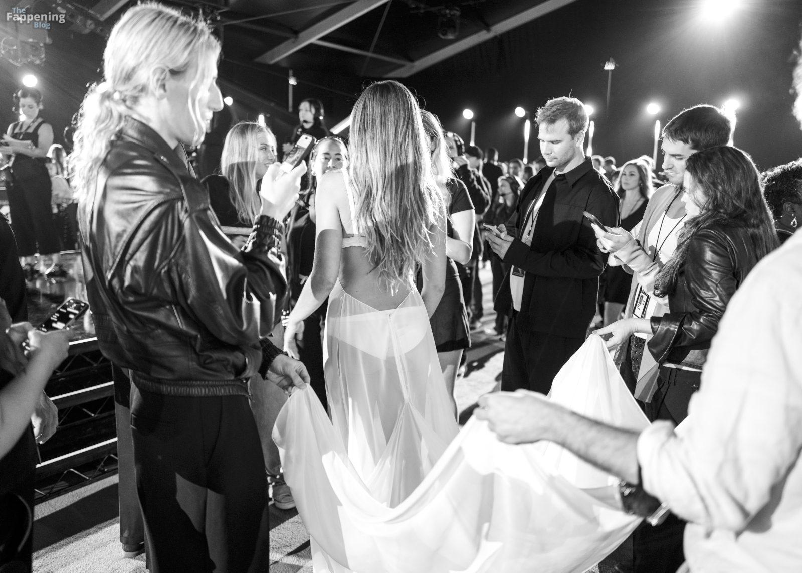 Singer Tate McRae is pictured at the VMAs in a sheer white gown. Check out her assets in the gallery below.