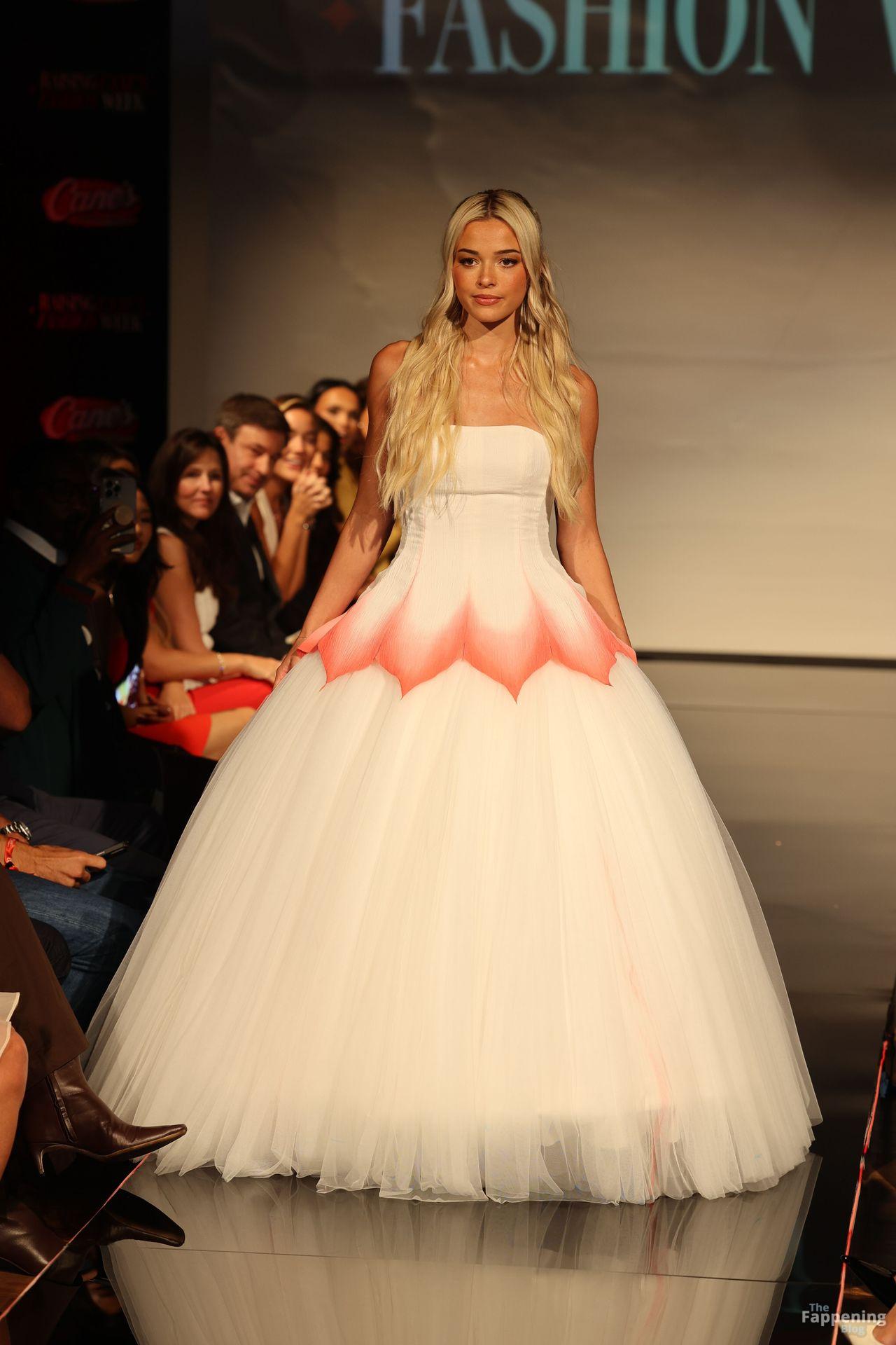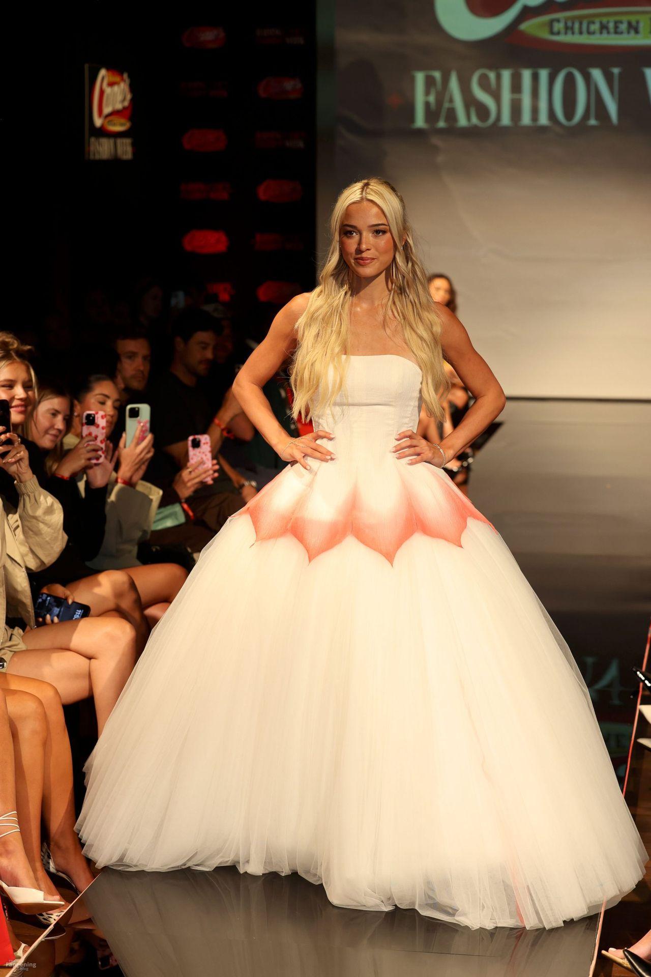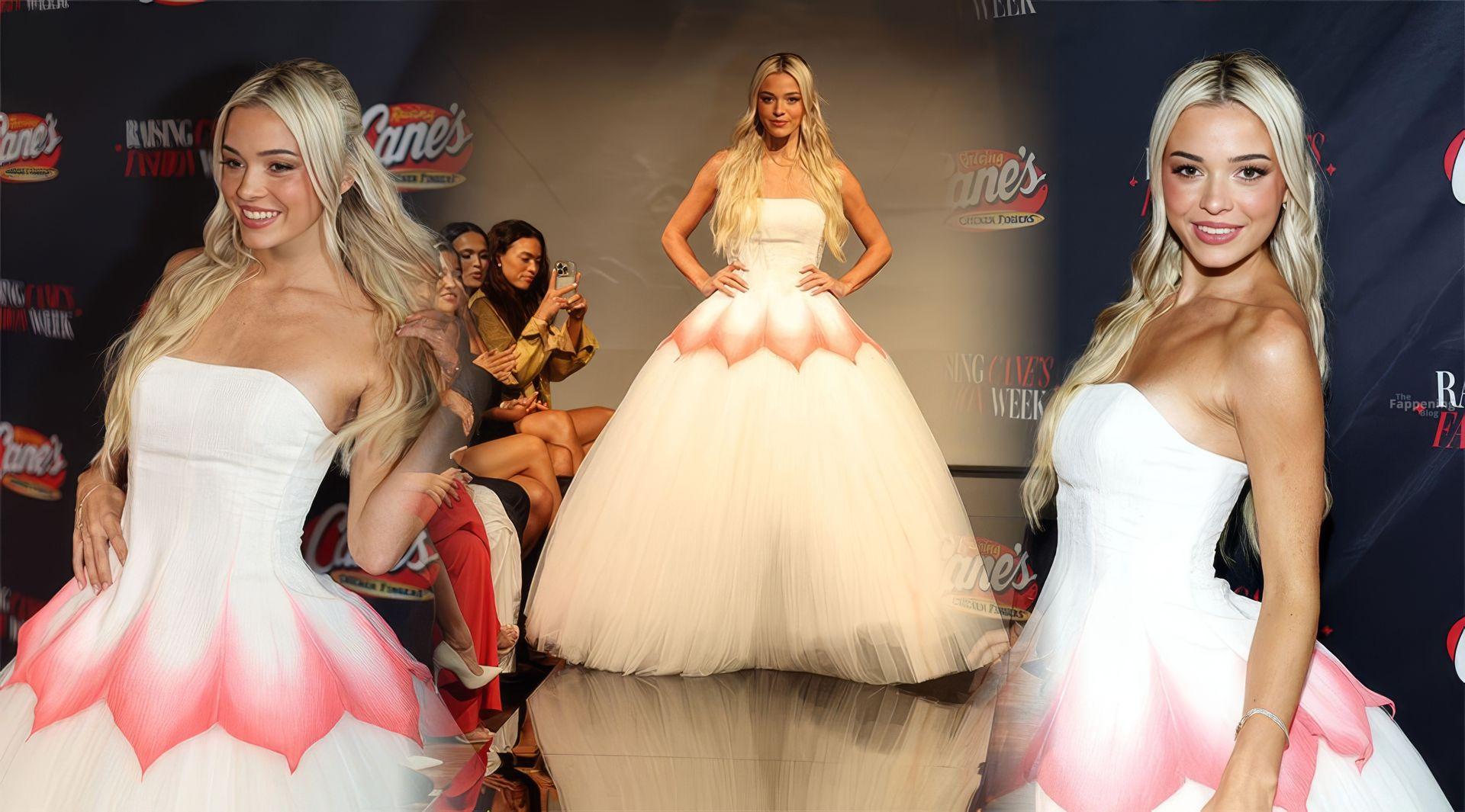 Olivia Dunne owned NYC Fashion Week, rockin’ a strapless gown with pink petal details that teased her sexy figure.