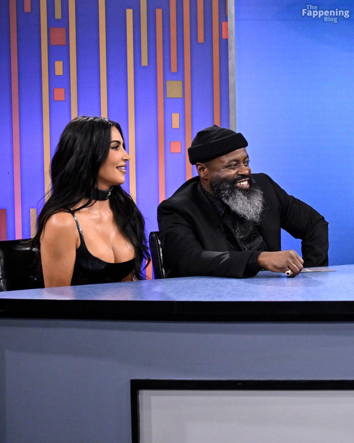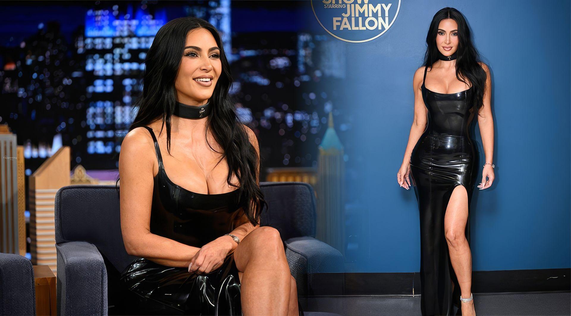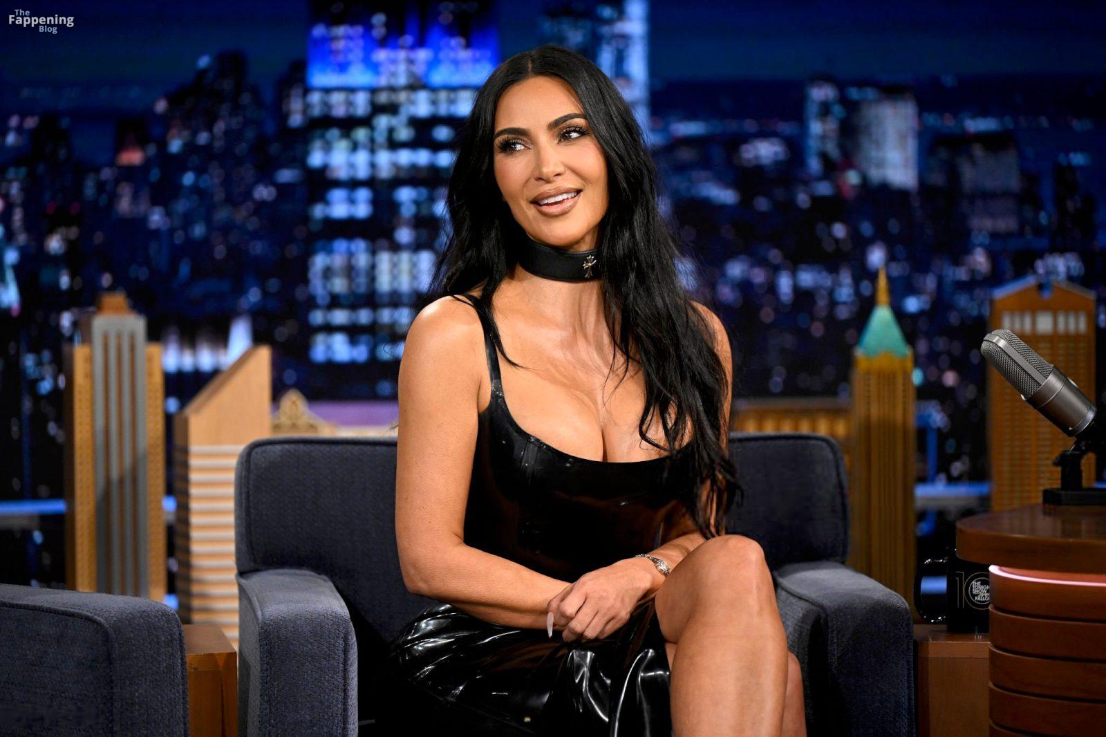 Kim Kardashian stuns on the Tonight Show, rockin’ a tight black latex dress that showed off her cleavage and a thigh-high slit.