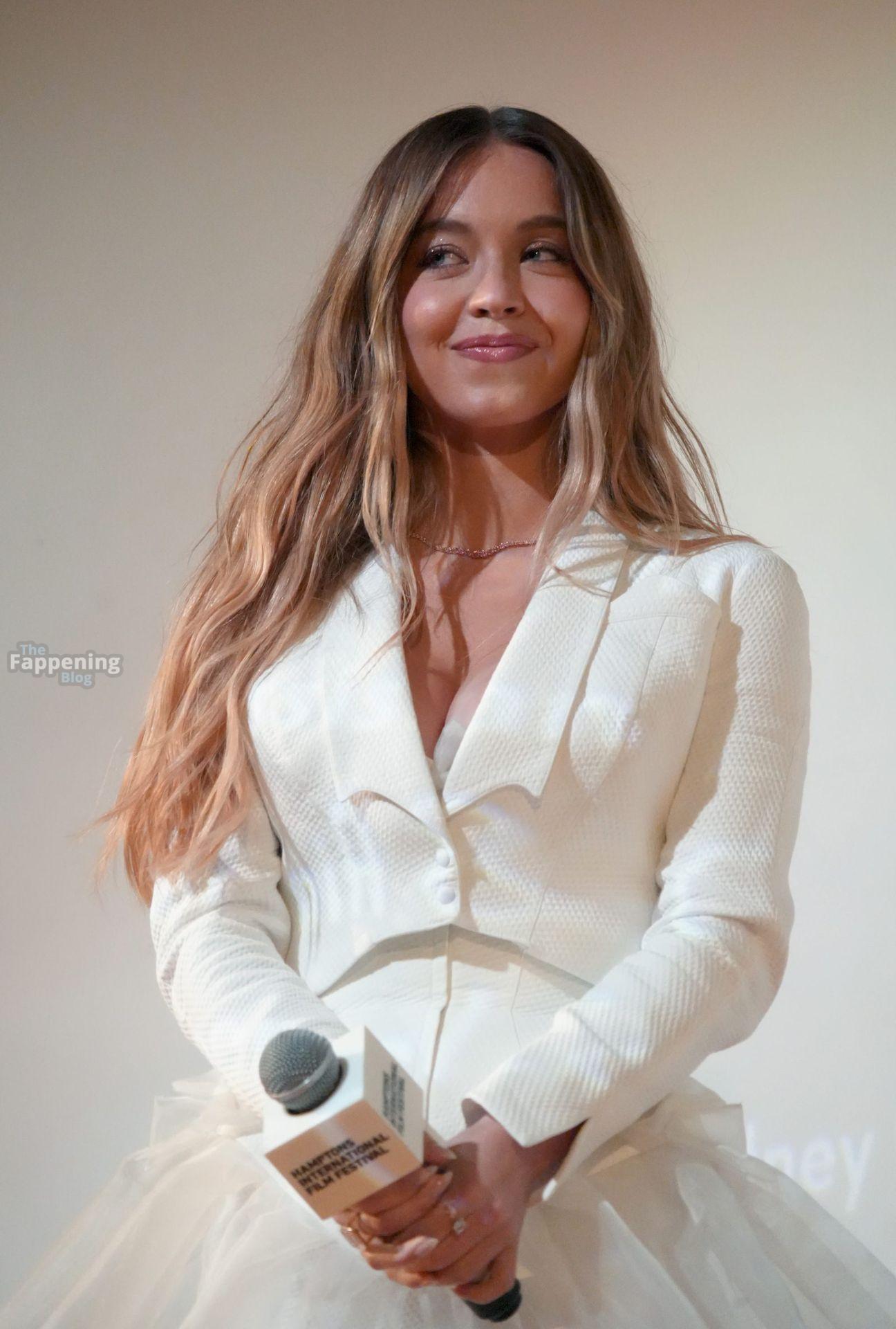 Sydney Sweeney stunned at the Hamptons Film Festival for the “Christy” premiere, rockin’ a plungin’ white dress that flashed nice cleavage and legs.