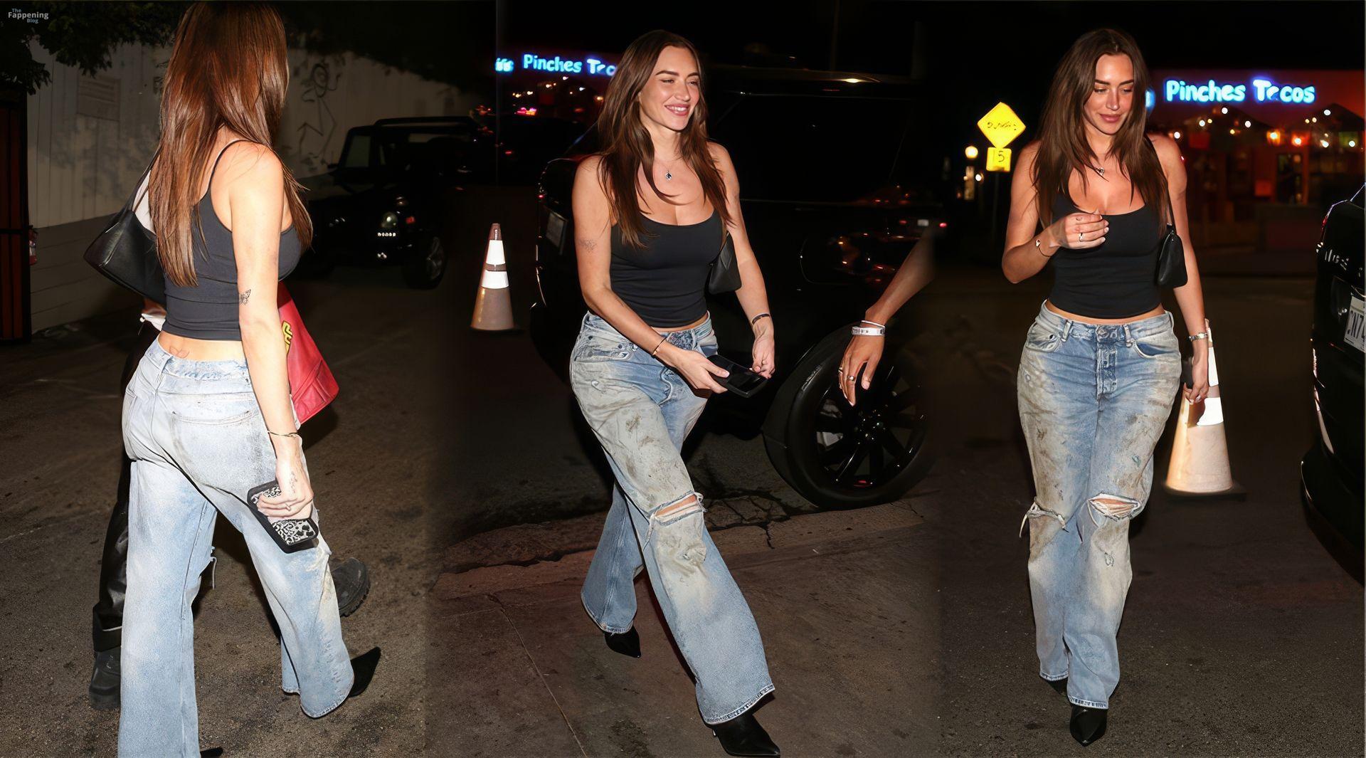 Anastasia Karanikolaou showed off major cleavage and booty in a tight tank and ripped jeans at Mark Ronson’s Chateau Marmont book release party.