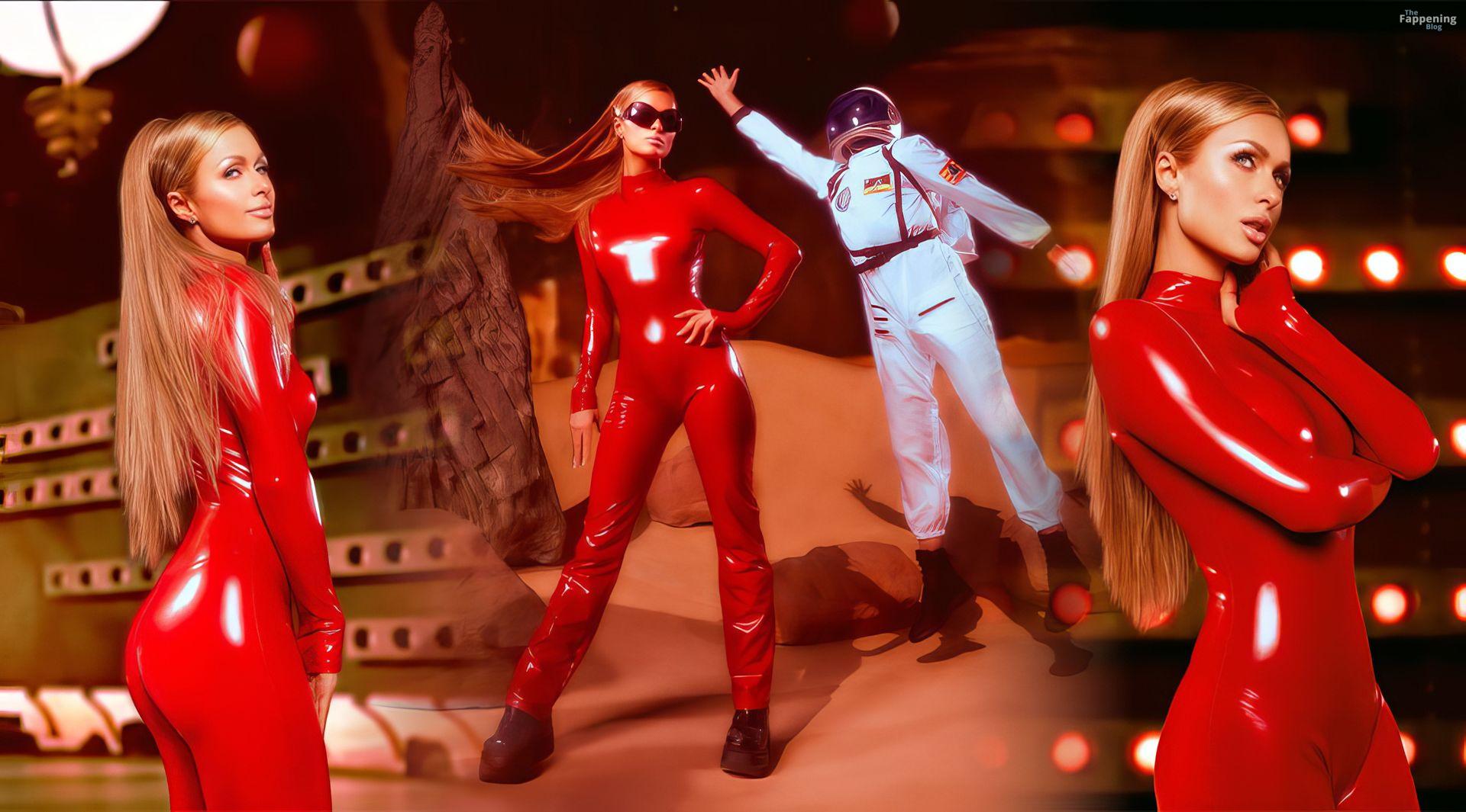 Paris Hilton poses in a red latex outfit for the “Oops!… I Did It Again” shoot.