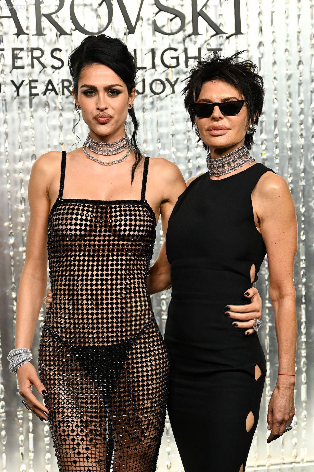 The 24-year-old model flashed her chest and black thong underneath the see-through gown, paired with lace peep-toe pumps and a glittery choker. She posed with her mom, Lisa Rinna, and other stars like Kylie Jenner and Emily Ratajkowski at the event at 6400 West Sunset Boulevard.