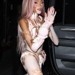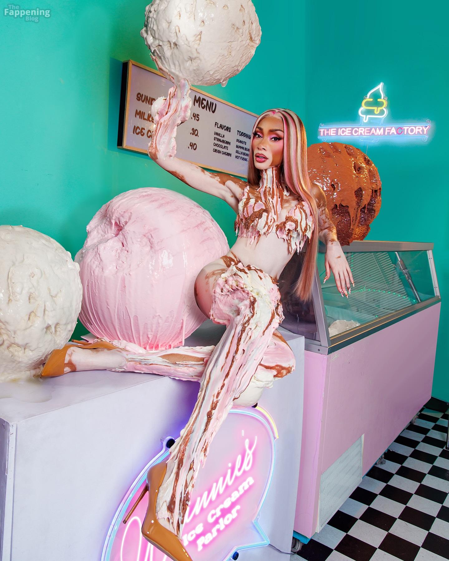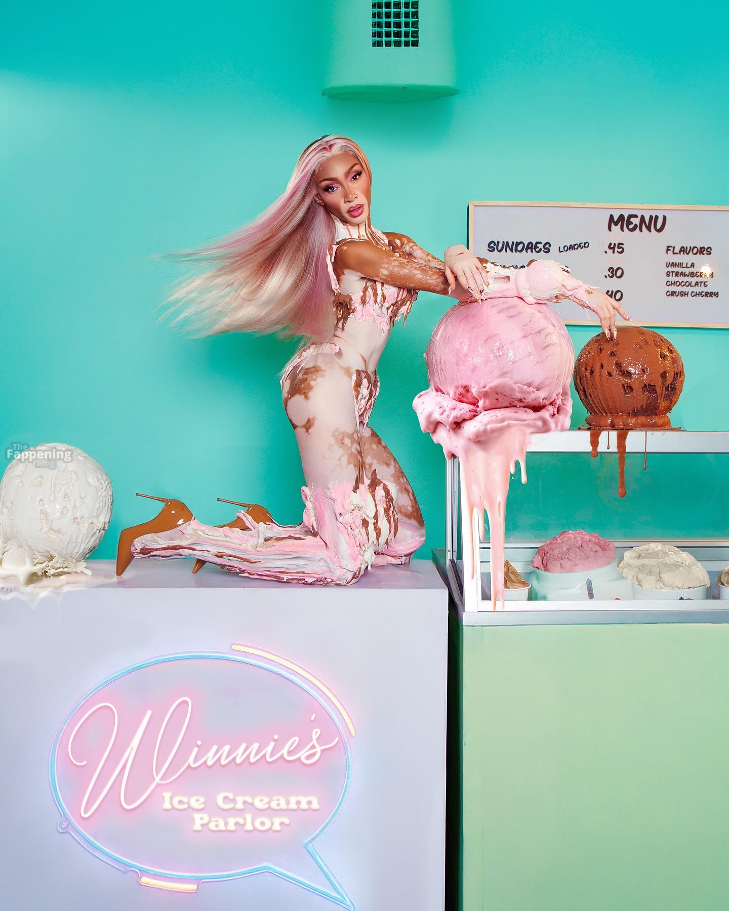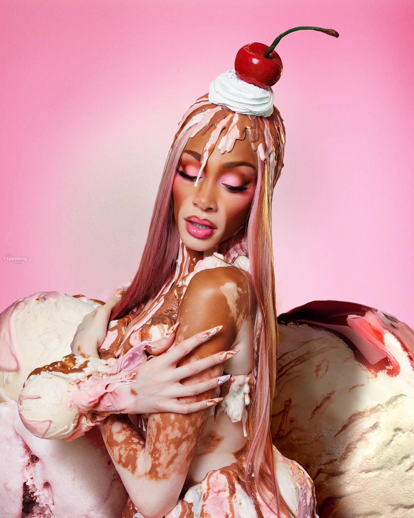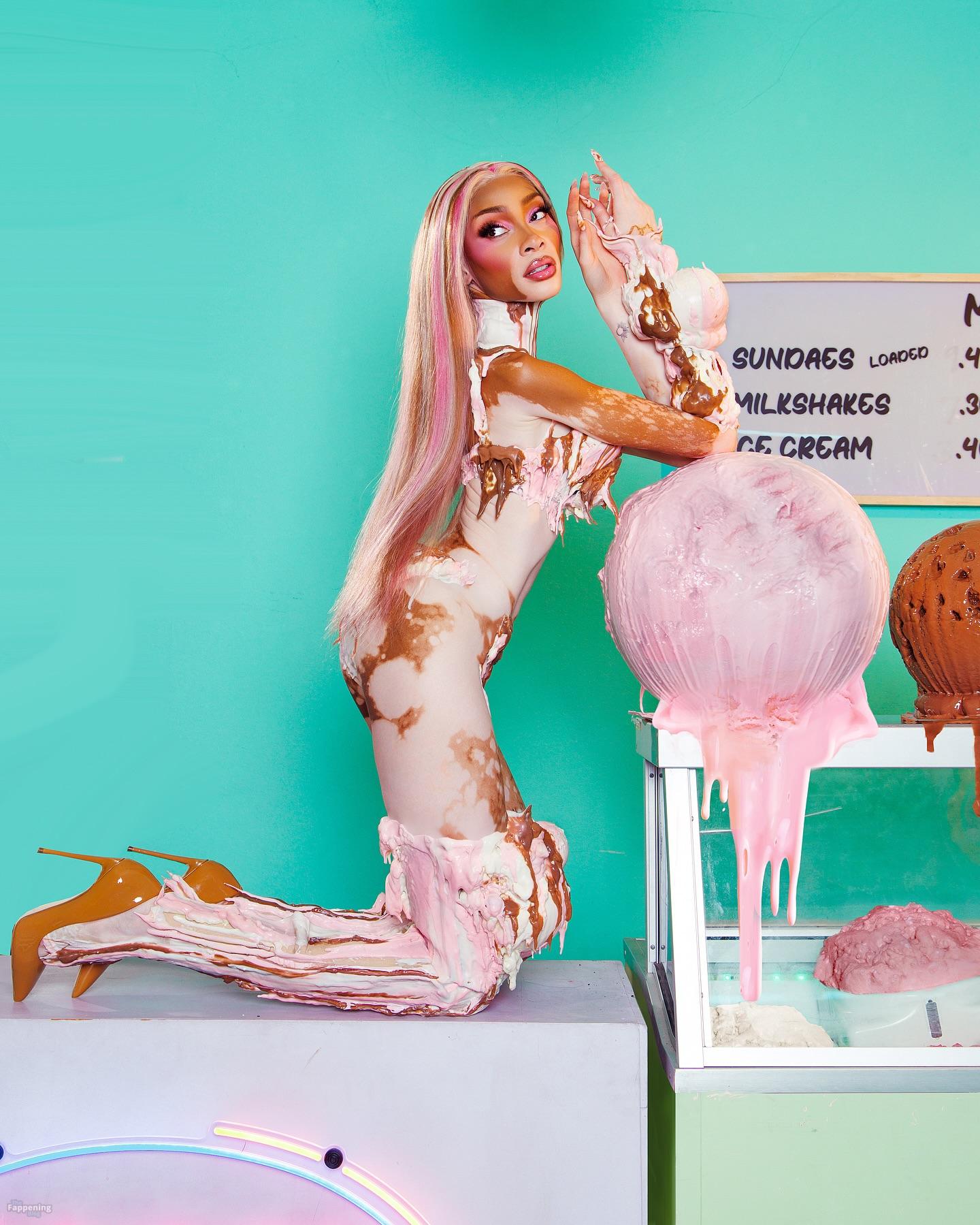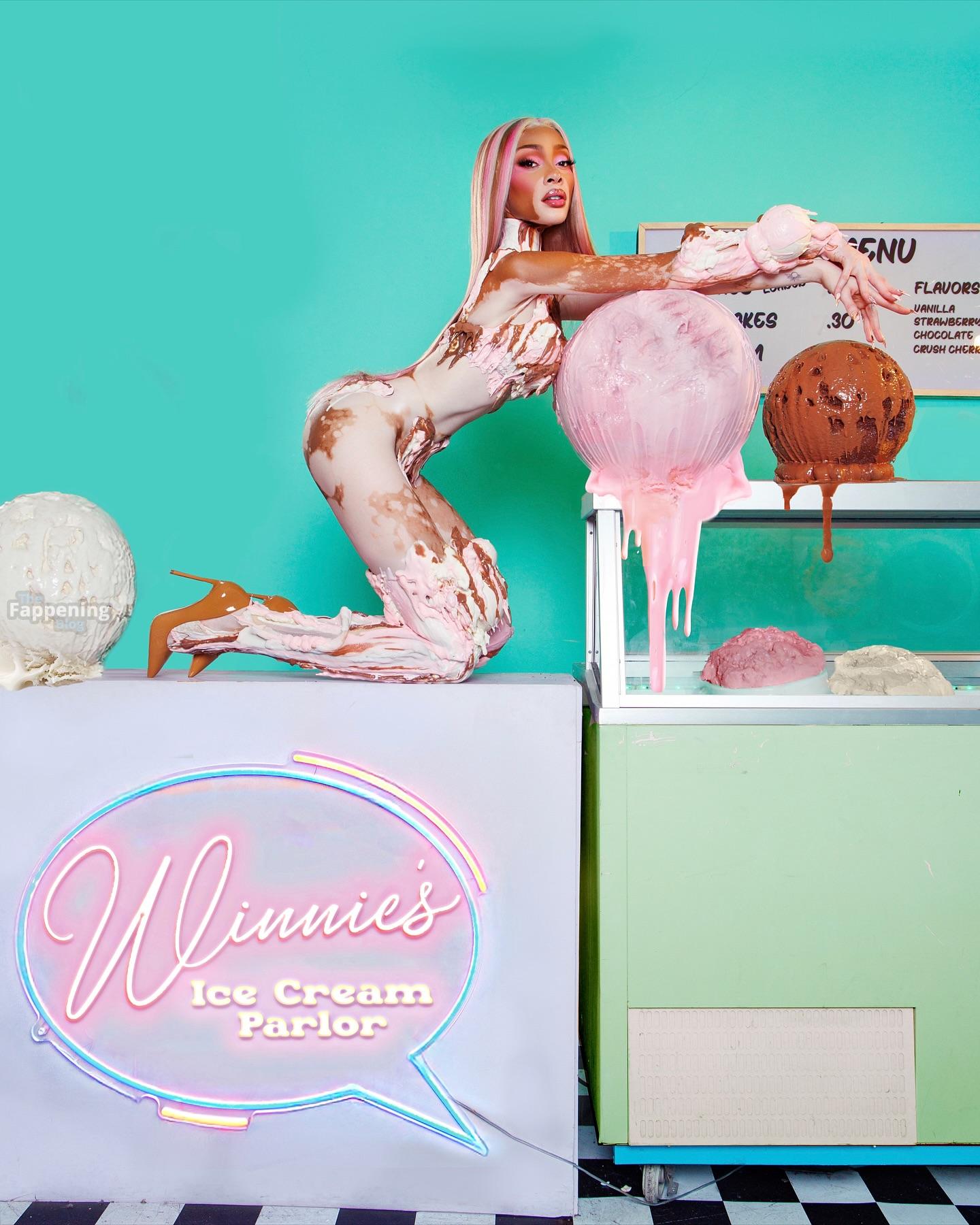Winnie Harlow pulled off the most original Halloween costume this year. She went as an ice cream monster. It’s a killer idea – a sexy, half-naked girl slathered in ice cream, scary as hell. In the pics, the model with vitiligo poses in an ice cream shop, lookin’ like part of the menu. Would you lick that sweet white ice cream off her? Hell yeah.