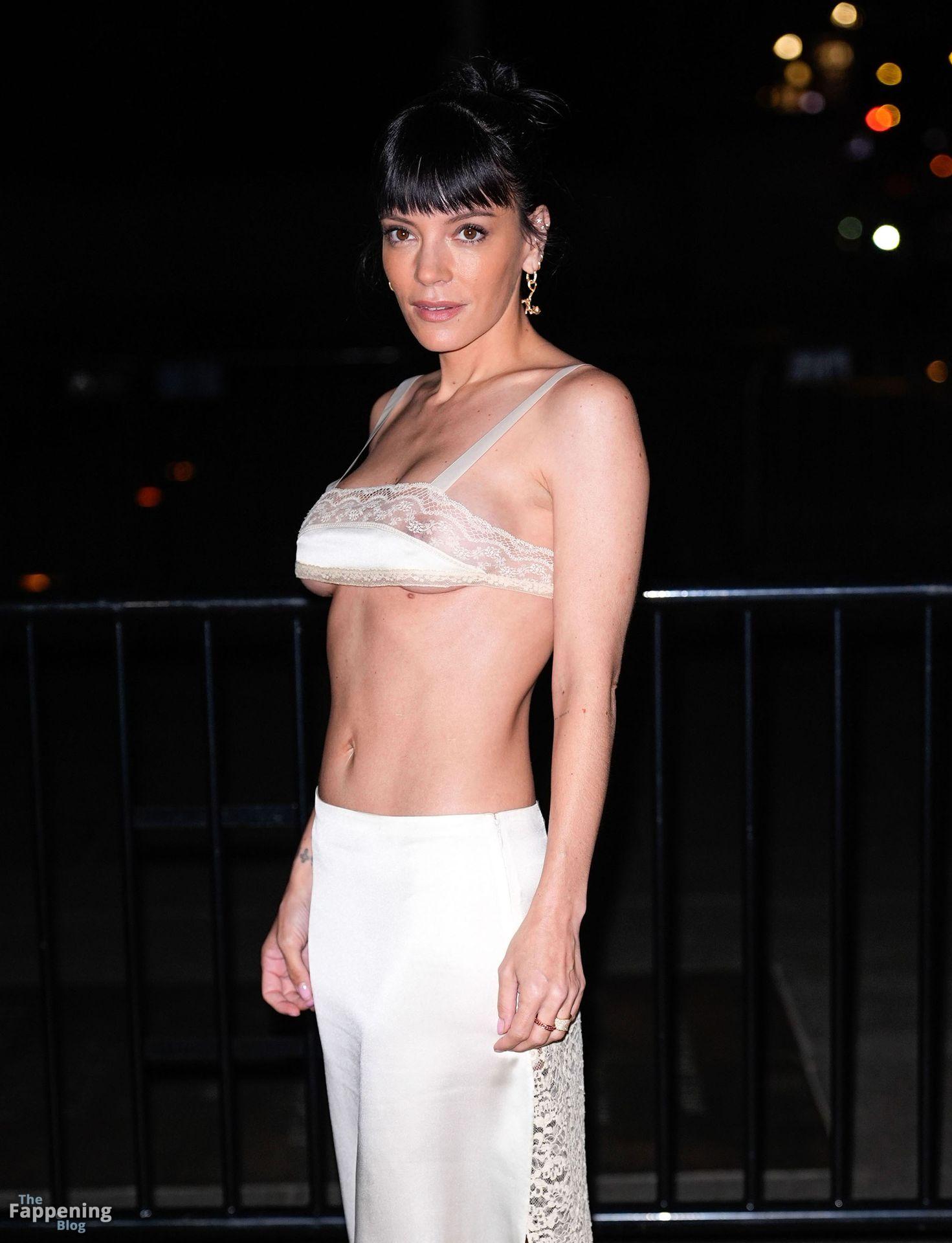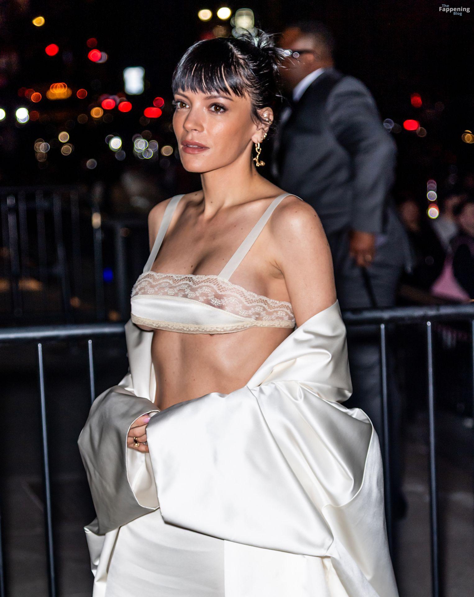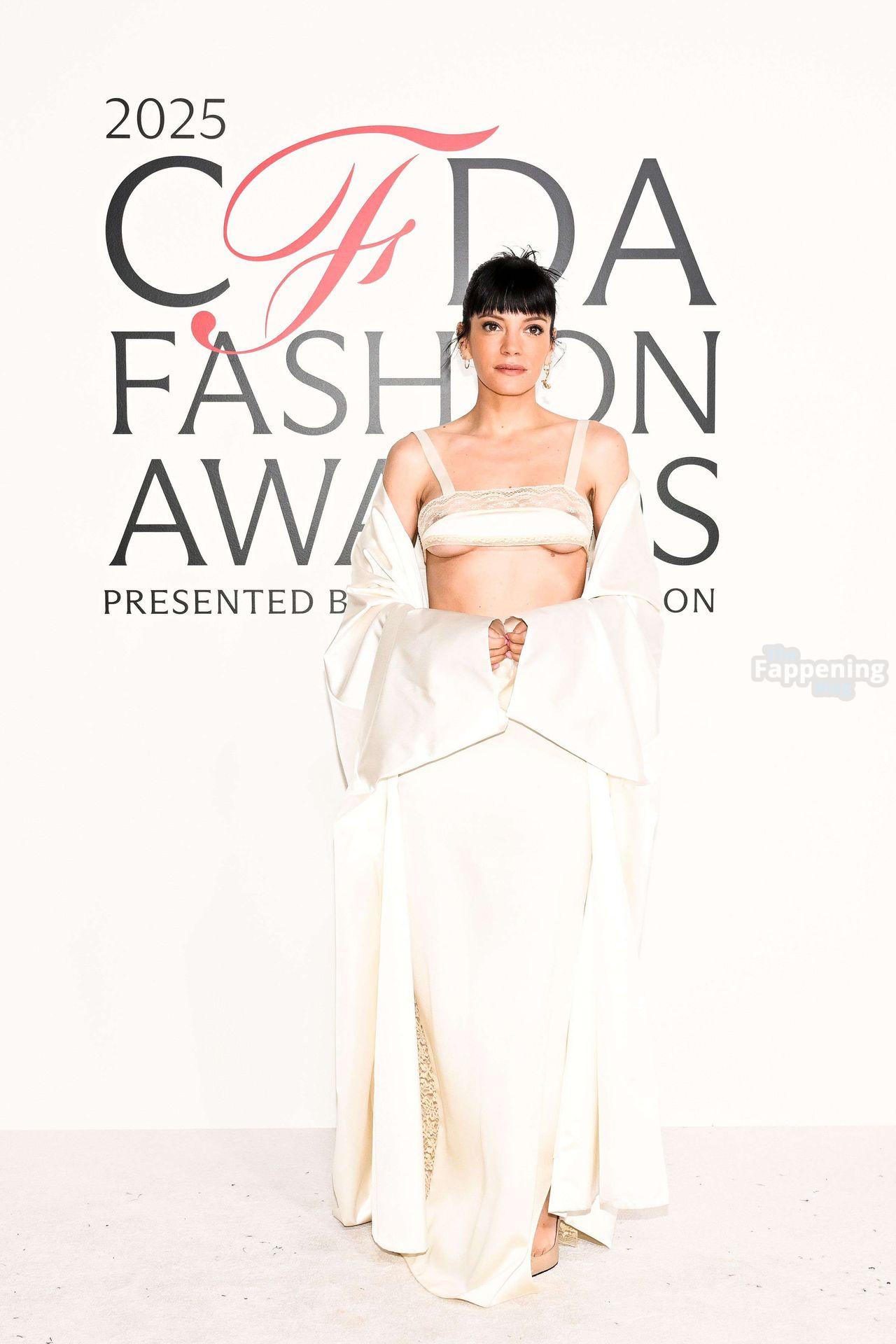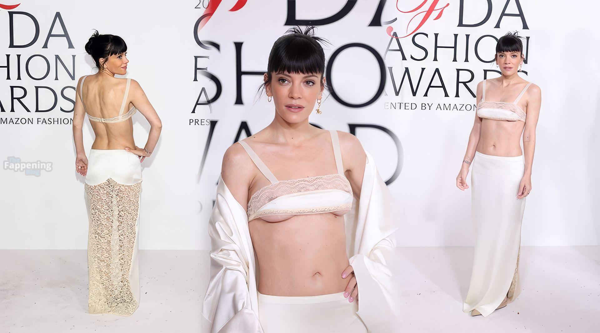 Lily Allen went braless in a see-through lace top at the CFDA Awards 2025. Her areola showed through the fabric, almost causin’ a nip slip.