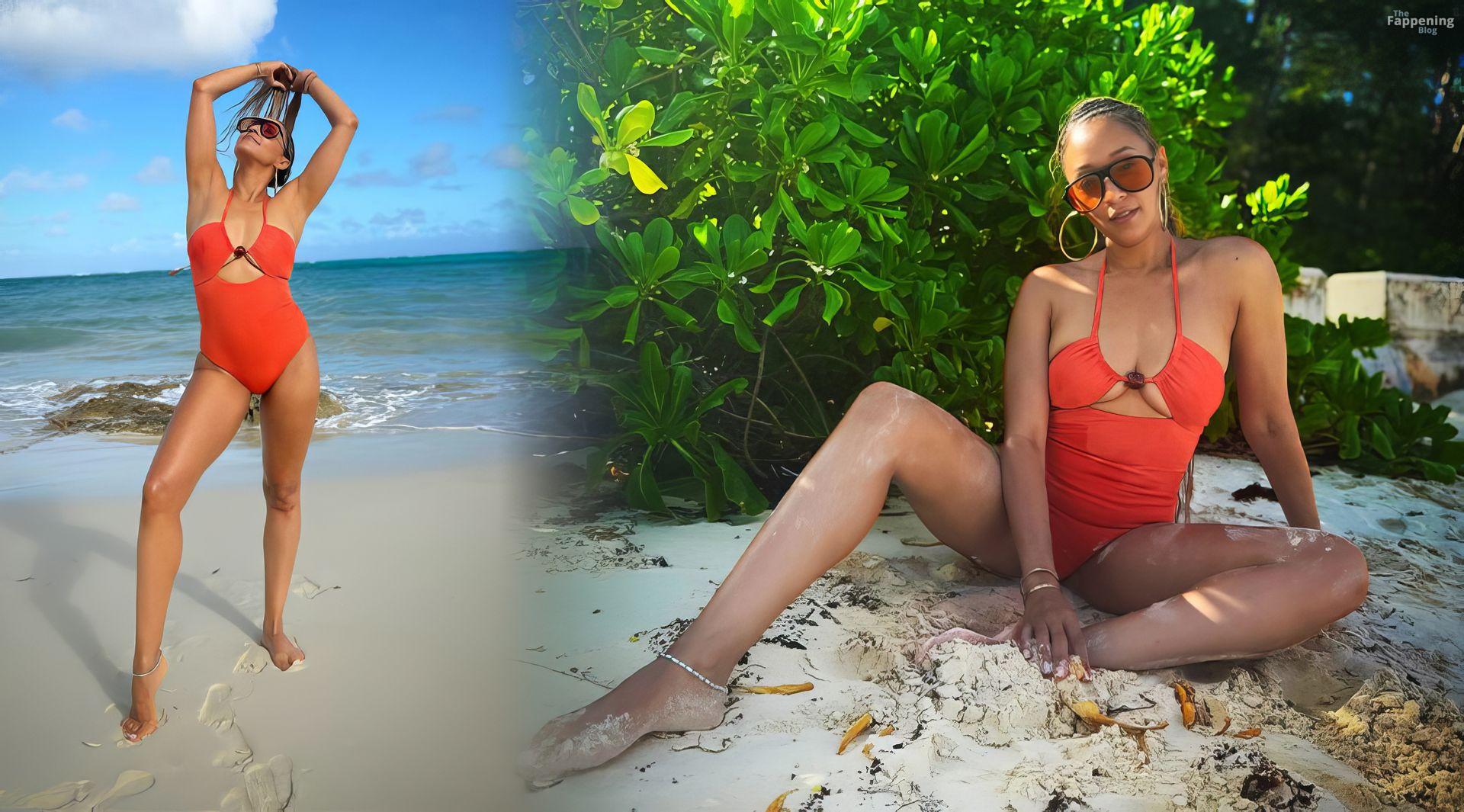 Tia Mowry poses in the Bahamas in a sexy orange swimsuit, showin’ off assets in this beach photoshoot.