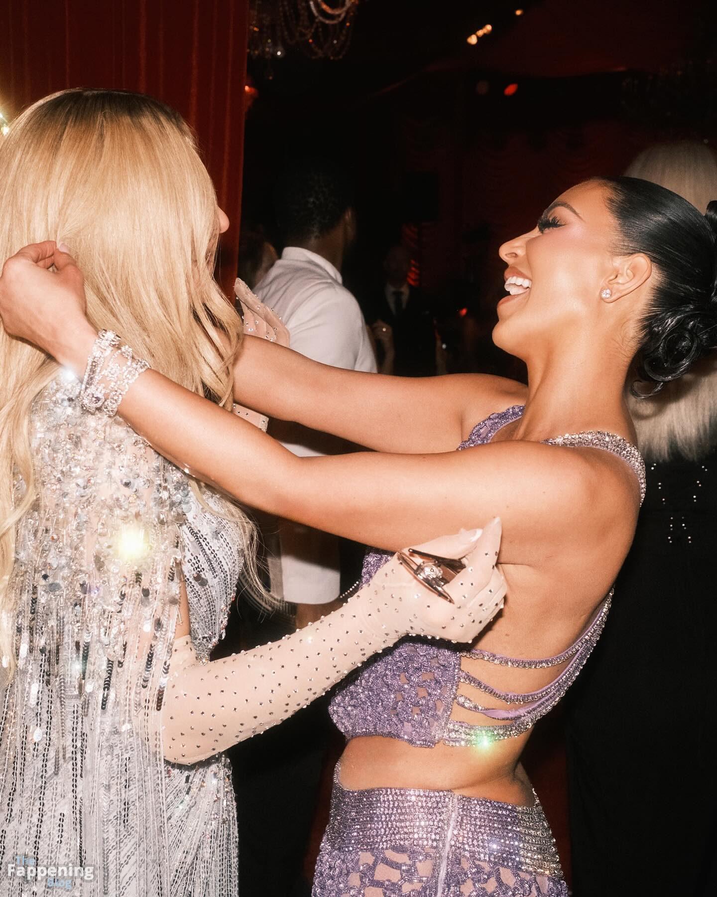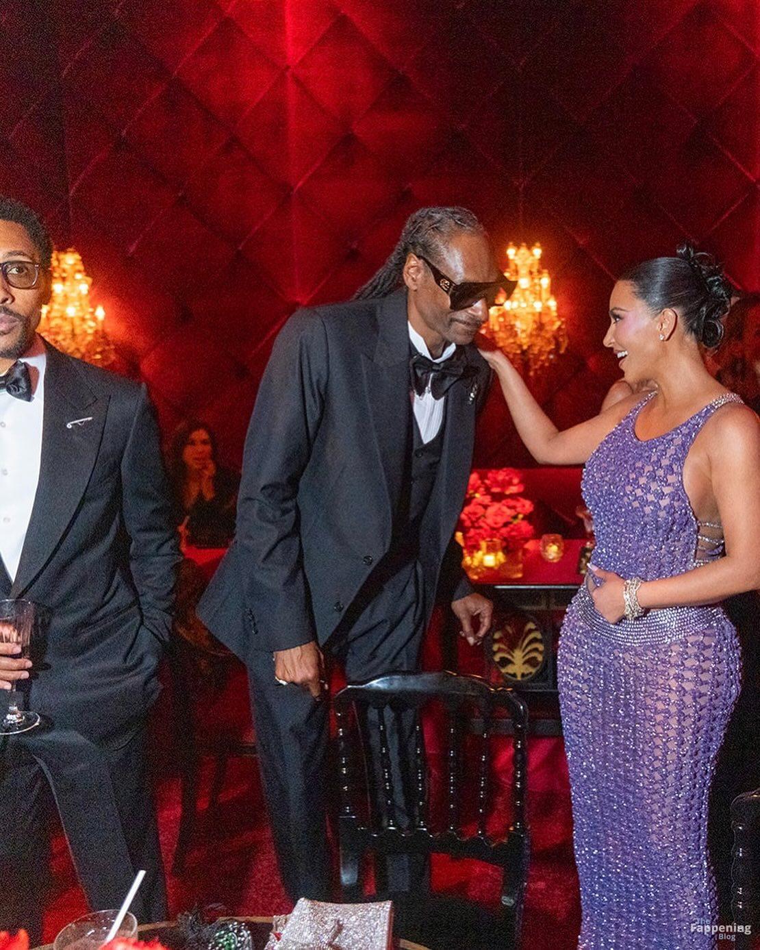 Kim Kardashian rocks a see-through purple mesh dress, showin’ her ass and boobs at a packed celeb party.