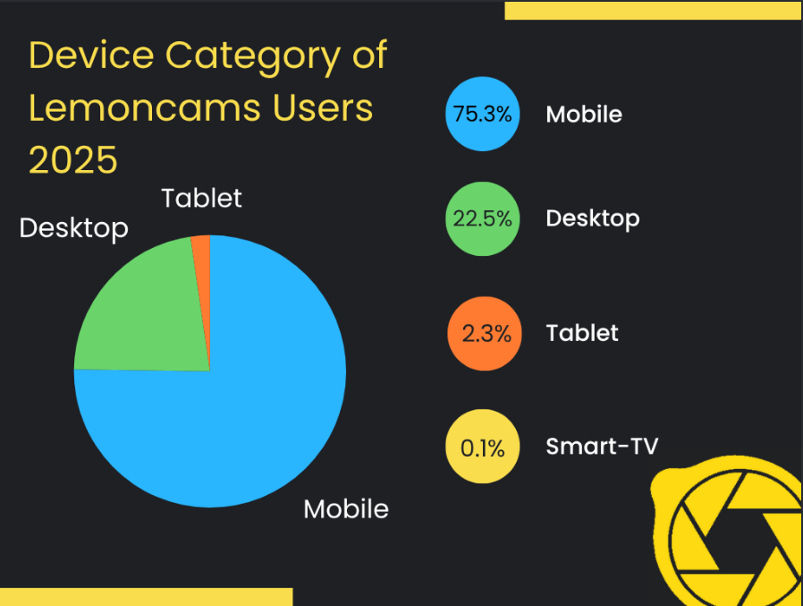 Regional preferences offer a much more detailed story into these insights. In some countries like Indonesia and India, mobile dominance is quite extreme. It exceeds 90% of total Lemoncams traffic. Meanwhile, certain Western nations, like the United States and the United Kingdom, with 35.9% and 32.5% of their audiences respectively, picking Desktop, point to a preference for larger screens.